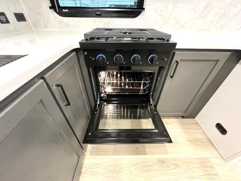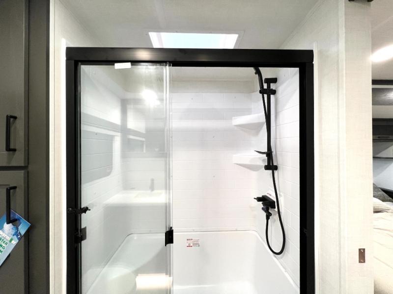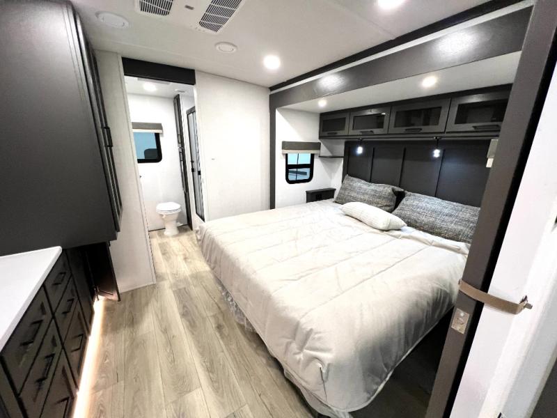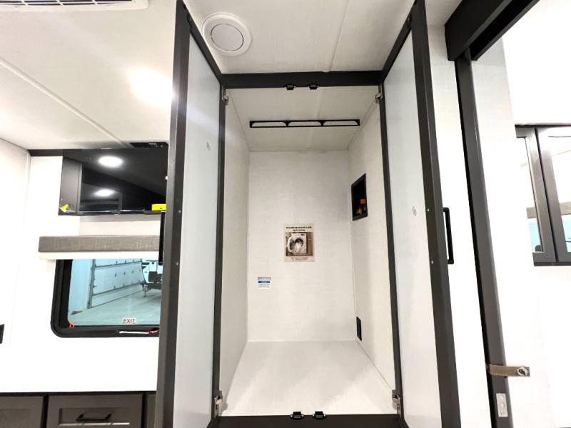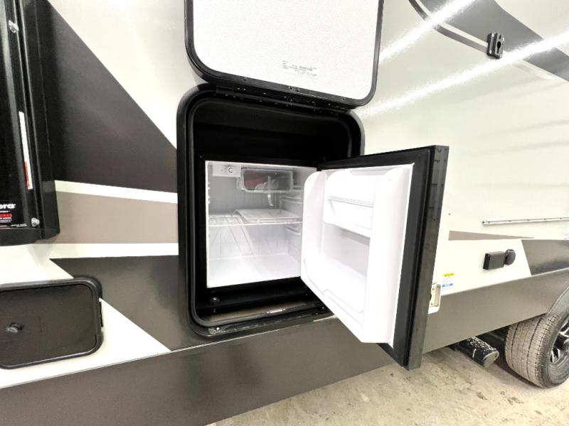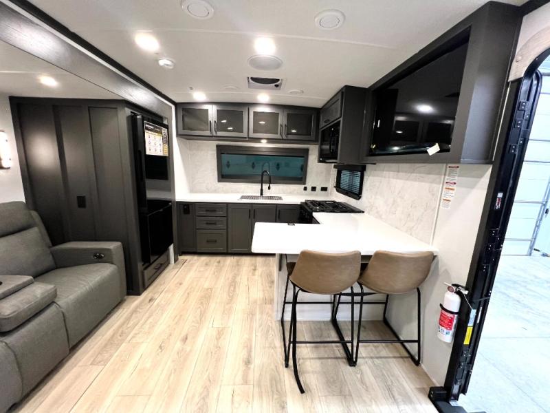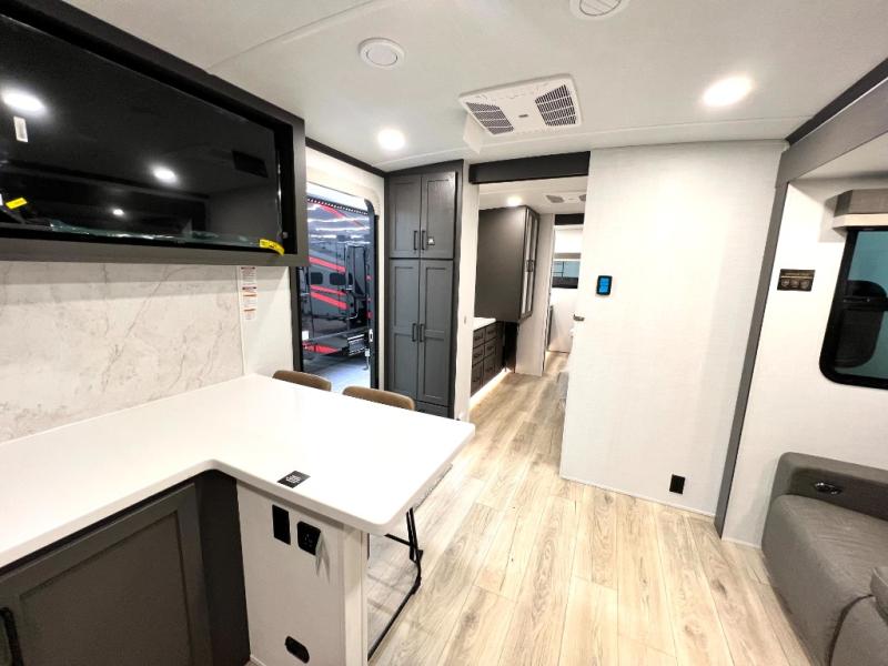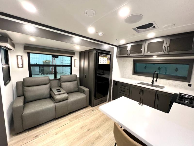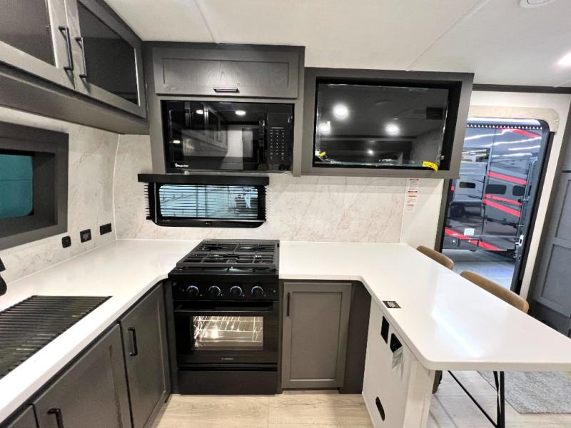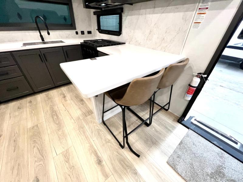 This front kitchen, couple's trailer is ready for adventure when you are! Once you arrive at your destination, prepare a quick lunch with the Griddle Prep, and enjoy the shade provided by the 19' power awning. You can eat outside, or inside at the counter with stools. The 67" theatre seat will make this travel trailer feel more like home, and the double slides provide more space to stretch out. Within the master bedroom you'll find a king bed, a large wardrobe and a dresser, plus an optional TV. And check out the full rear bath with dual bath sinks and a shower with a seat! Now, that's what I call comfort!