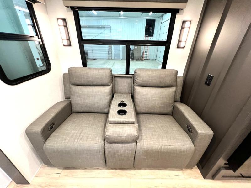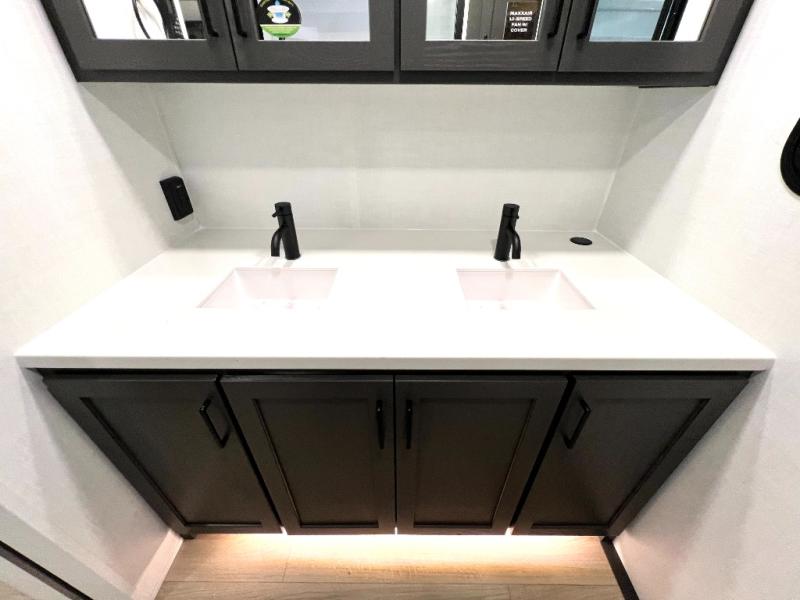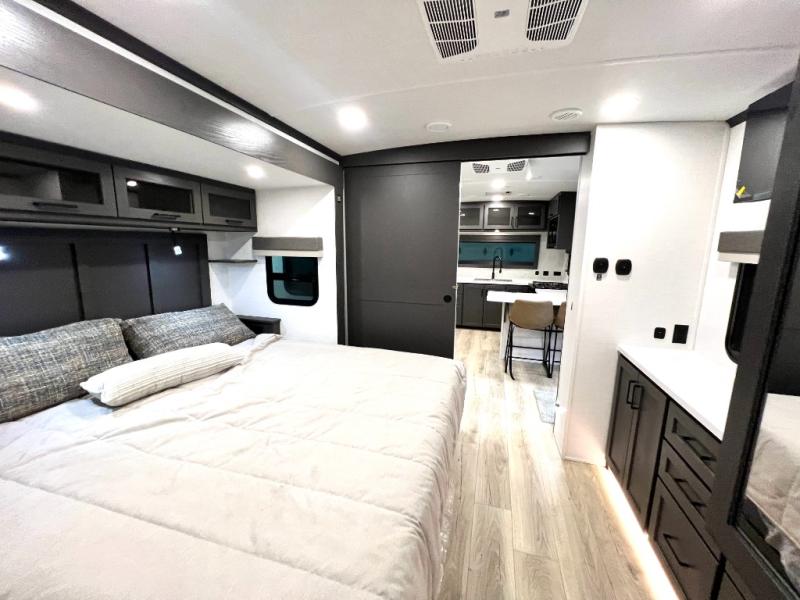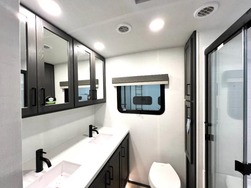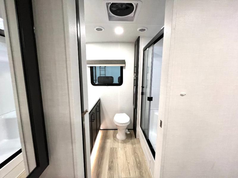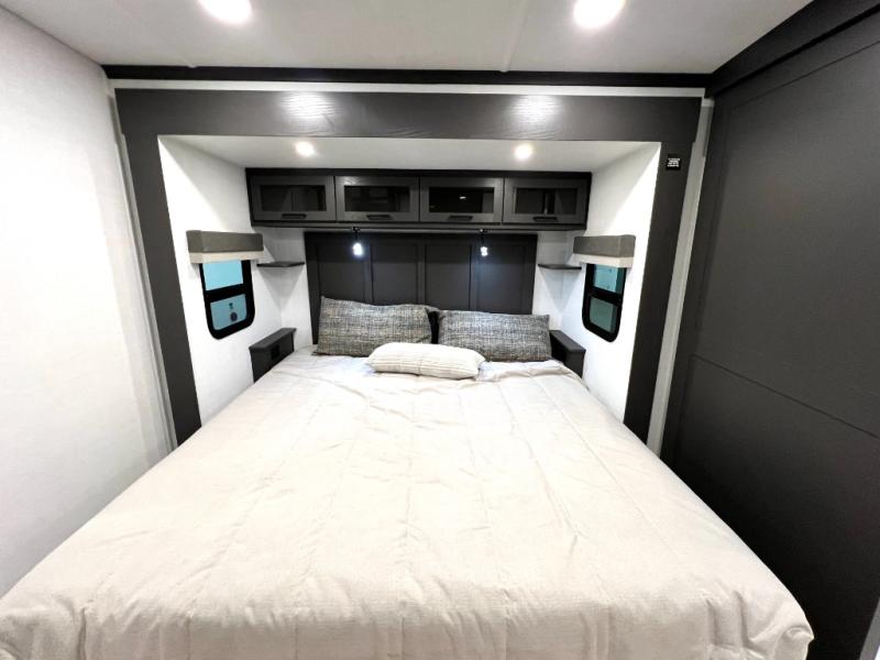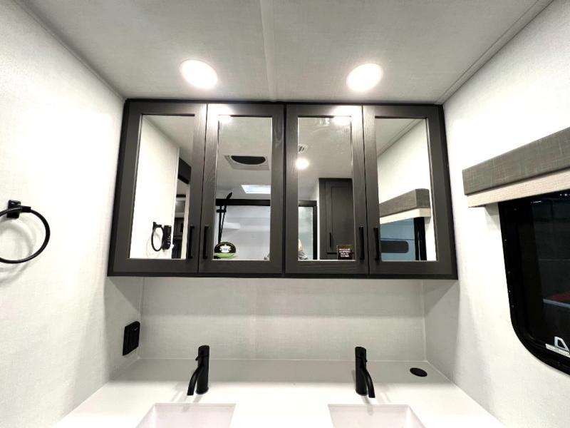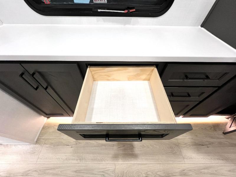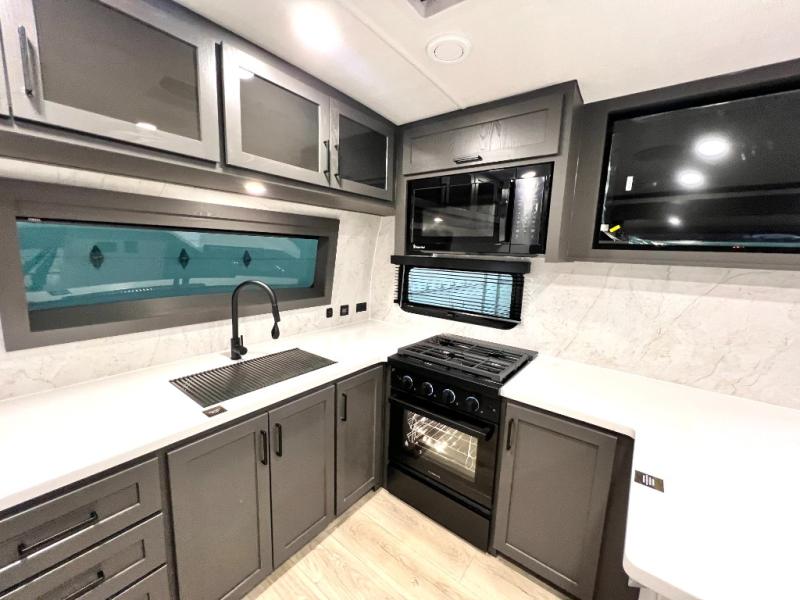 This front kitchen, couple's trailer is ready for adventure when you are! Once you arrive at your destination, prepare a quick lunch with the Griddle Prep, and enjoy the shade provided by the 19' power awning. You can eat outside, or inside at the counter with stools. The 67" theatre seat will make this travel trailer feel more like home, and the double slides provide more space to stretch out. Within the master bedroom you'll find a king bed, a large wardrobe and a dresser, plus an optional TV. And check out the full rear bath with dual bath sinks and a shower with a seat! Now, that's what I call comfort!