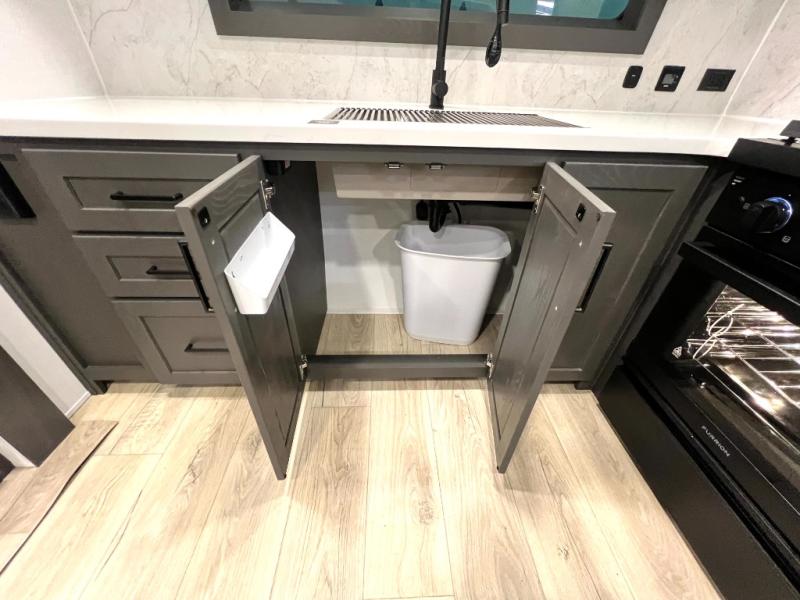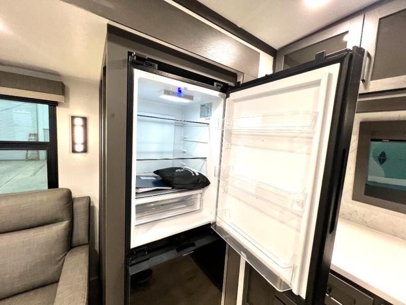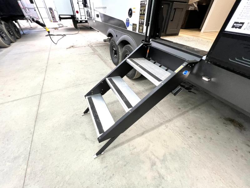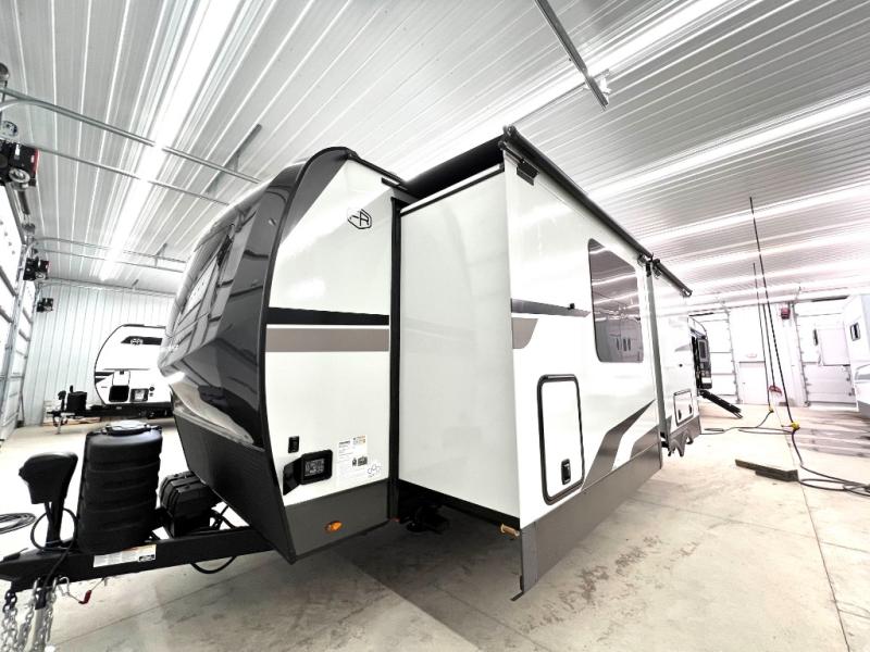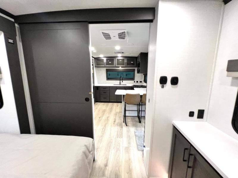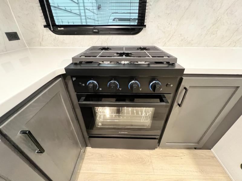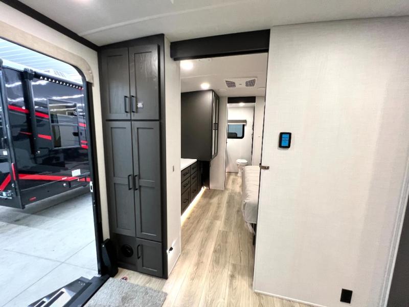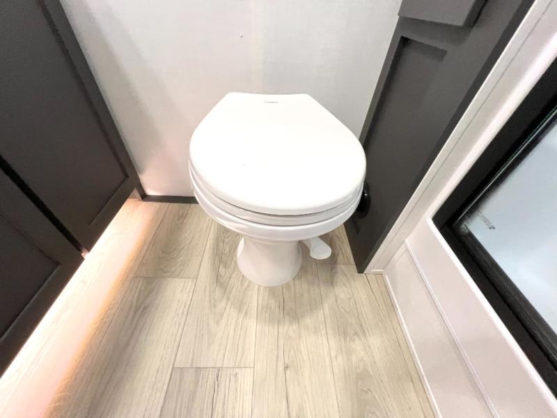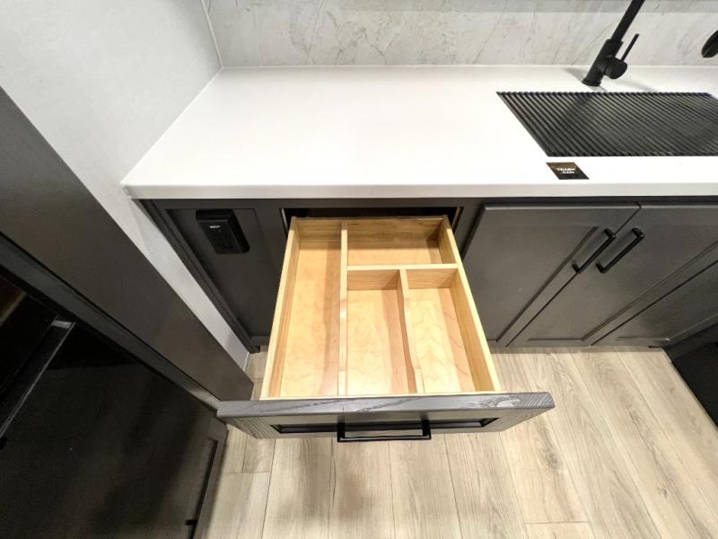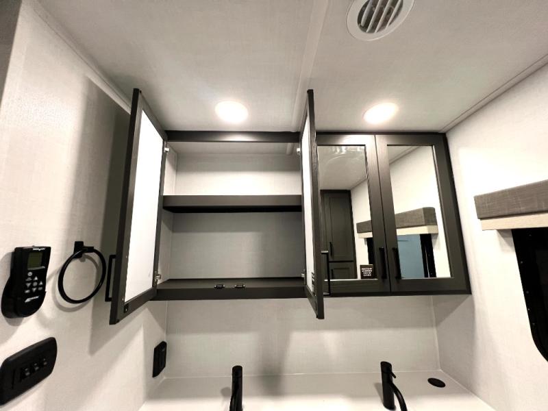 This front kitchen, couple's trailer is ready for adventure when you are! Once you arrive at your destination, prepare a quick lunch with the Griddle Prep, and enjoy the shade provided by the 19' power awning. You can eat outside, or inside at the counter with stools. The 67" theatre seat will make this travel trailer feel more like home, and the double slides provide more space to stretch out. Within the master bedroom you'll find a king bed, a large wardrobe and a dresser, plus an optional TV. And check out the full rear bath with dual bath sinks and a shower with a seat! Now, that's what I call comfort!