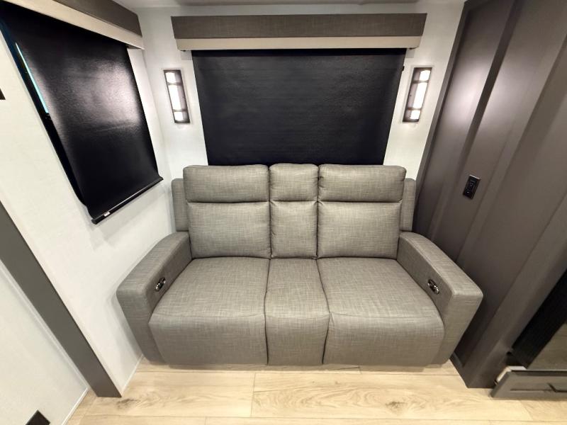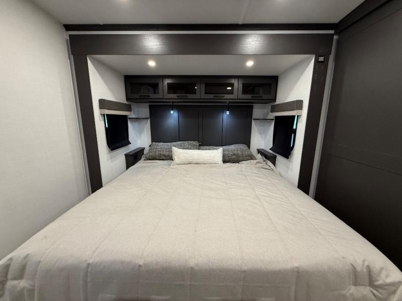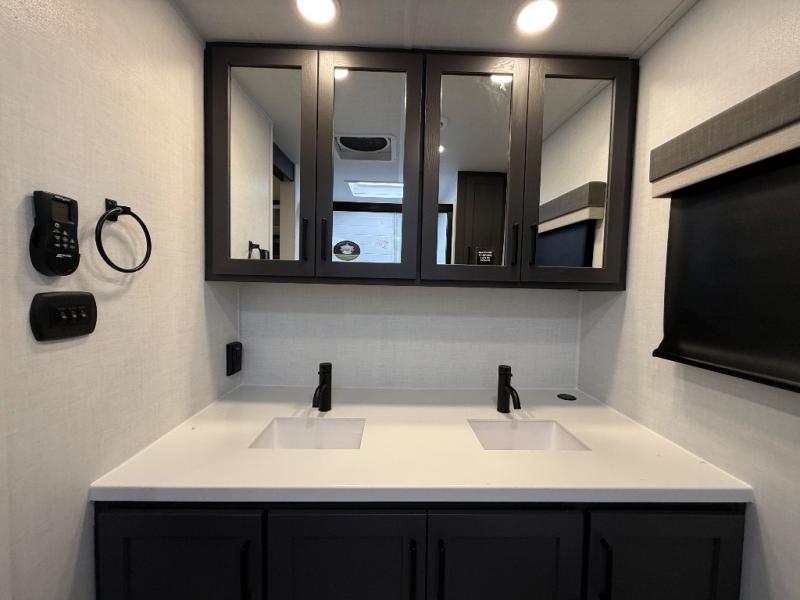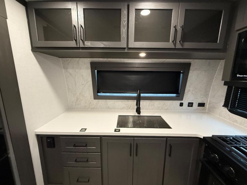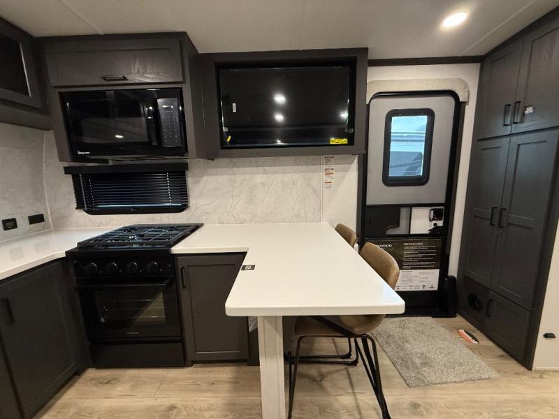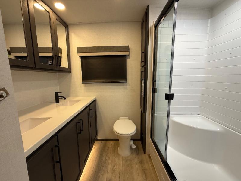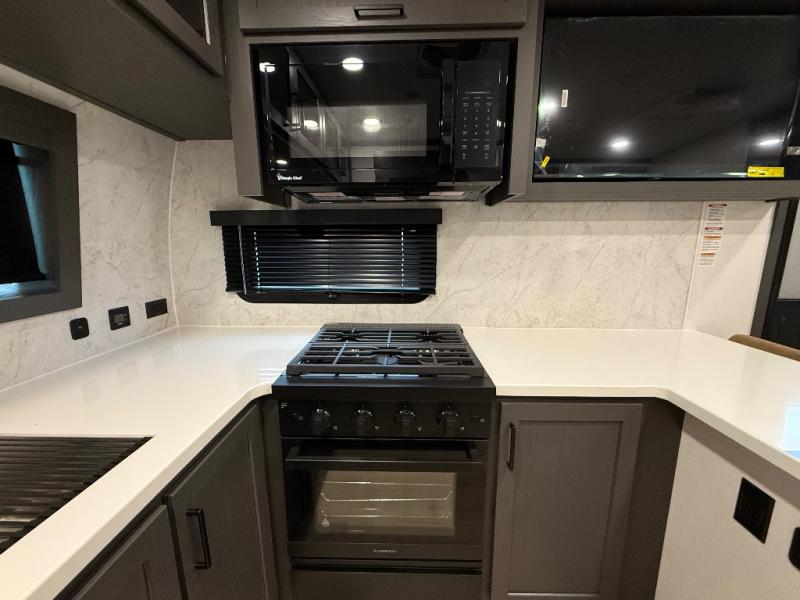 This front kitchen, couple's trailer is ready for adventure when you are! Once you arrive at your destination, prepare a quick lunch with the Griddle Prep, and enjoy the shade provided by the 19' power awning. You can eat outside, or inside at the counter with stools. The 67" theatre seat will make this travel trailer feel more like home, and the double slides provide more space to stretch out. Within the master bedroom you'll find a king bed, a large wardrobe and a dresser, plus an optional TV. And check out the full rear bath with dual bath sinks and a shower with a seat! Now, that's what I call comfort!