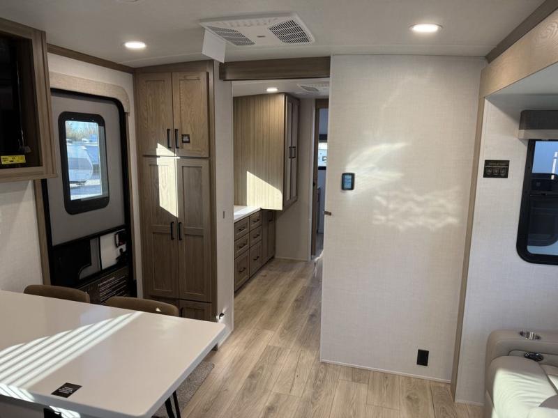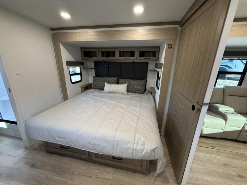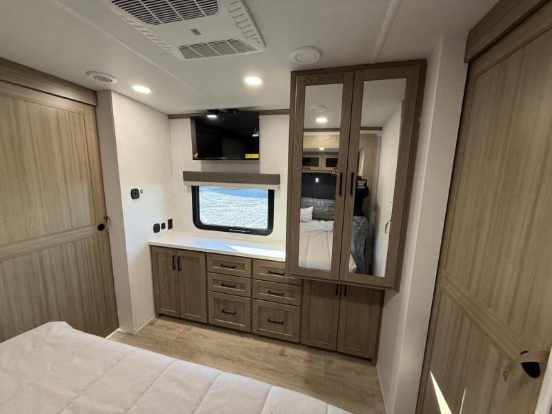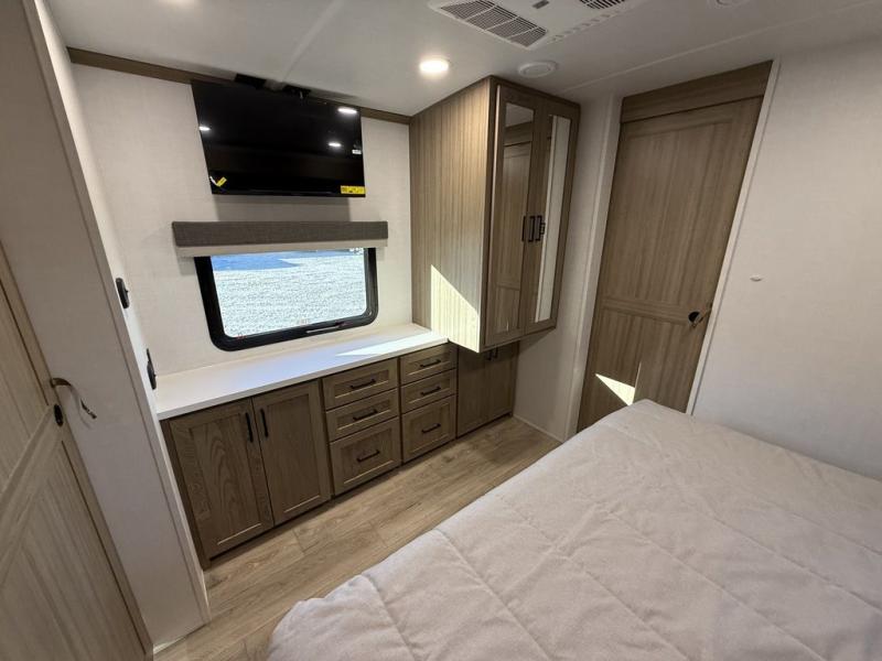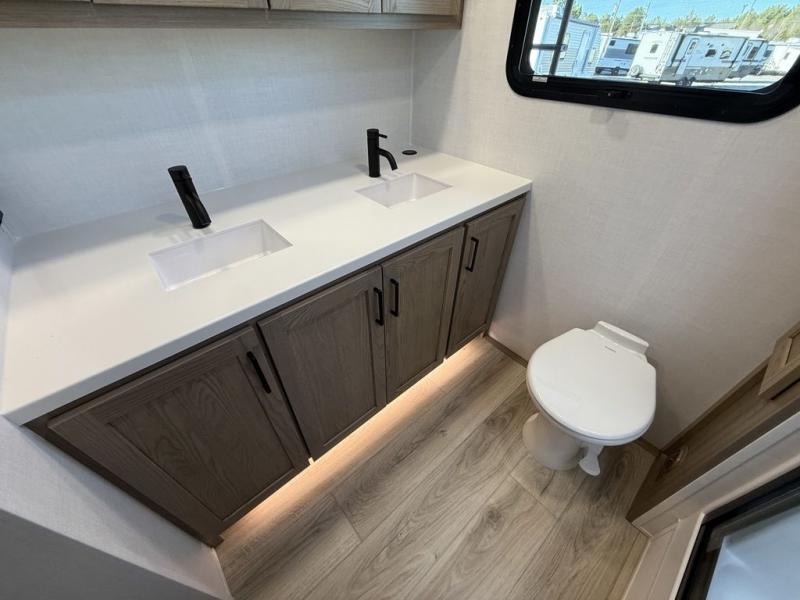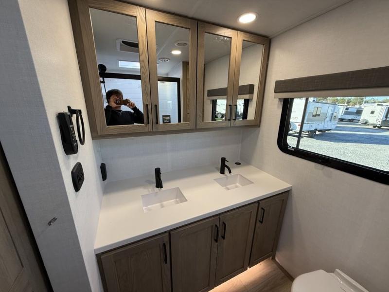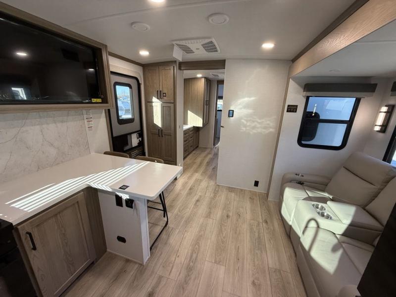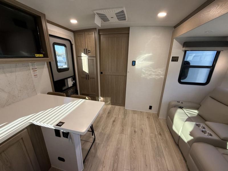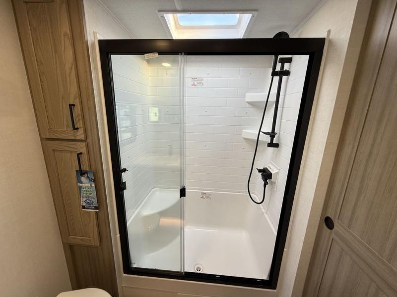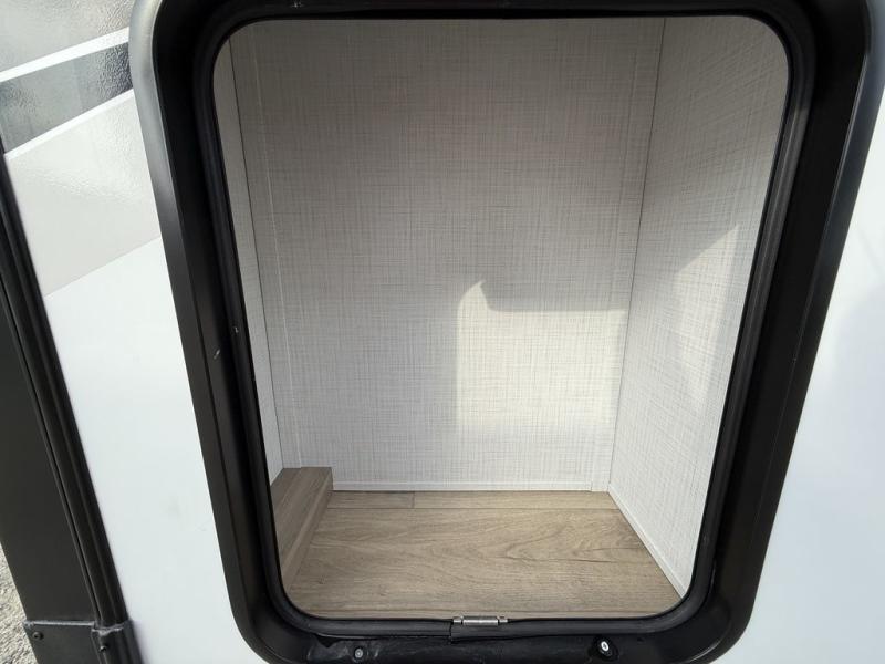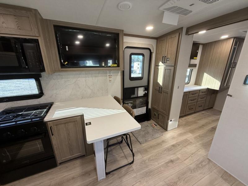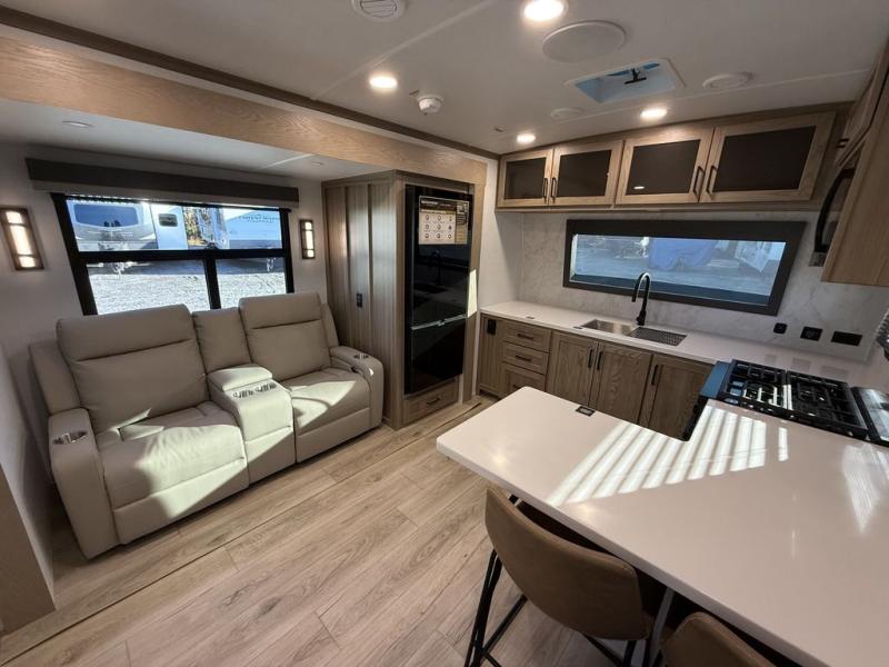 This front kitchen, couple's trailer is ready for adventure when you are! Once you arrive at your destination, prepare a quick lunch with the Griddle Prep, and enjoy the shade provided by the 19' power awning. You can eat outside, or inside at the counter with stools. The 67" theatre seat will make this travel trailer feel more like home, and the double slides provide more space to stretch out. Within the master bedroom you'll find a king bed, a large wardrobe and a dresser, plus an optional TV. And check out the full rear bath with dual bath sinks and a shower with a seat! Now, that's what I call comfort!
