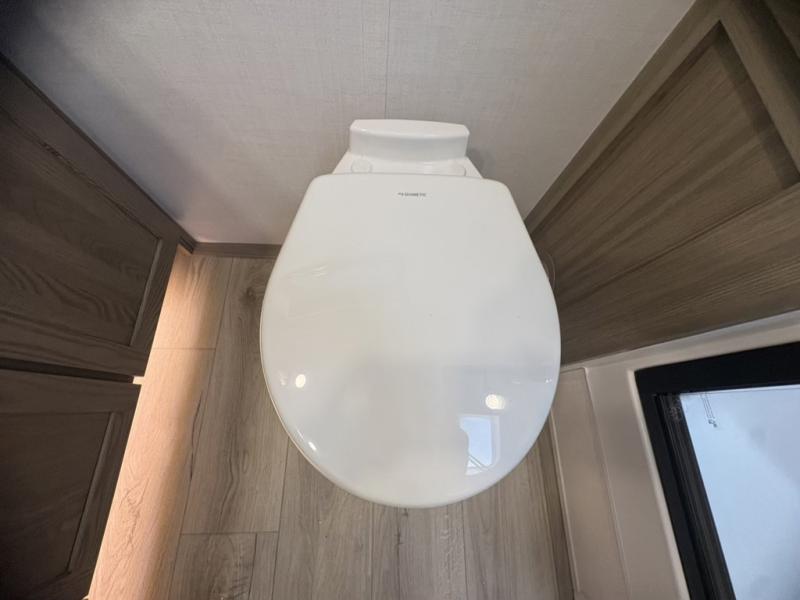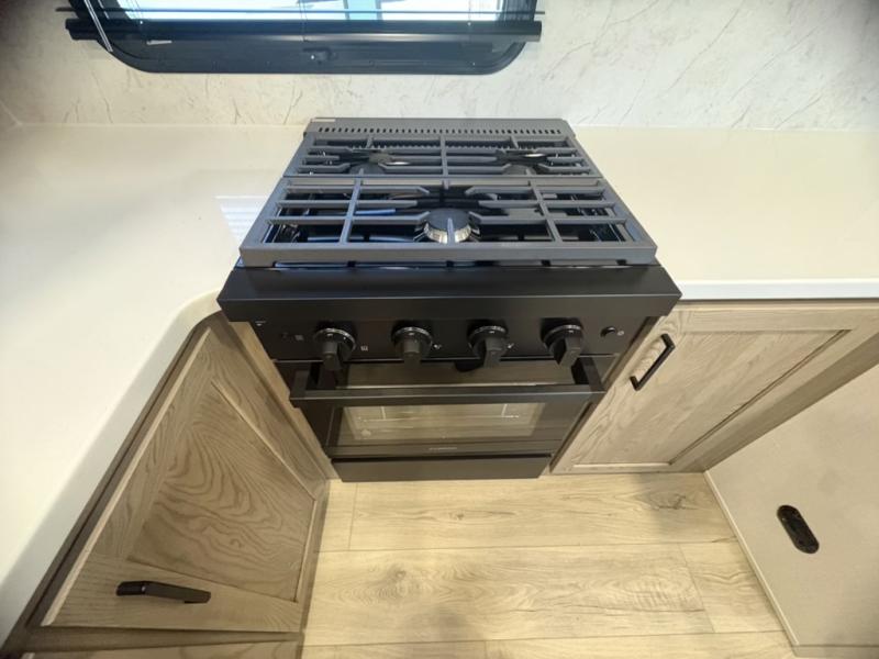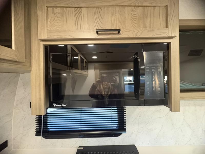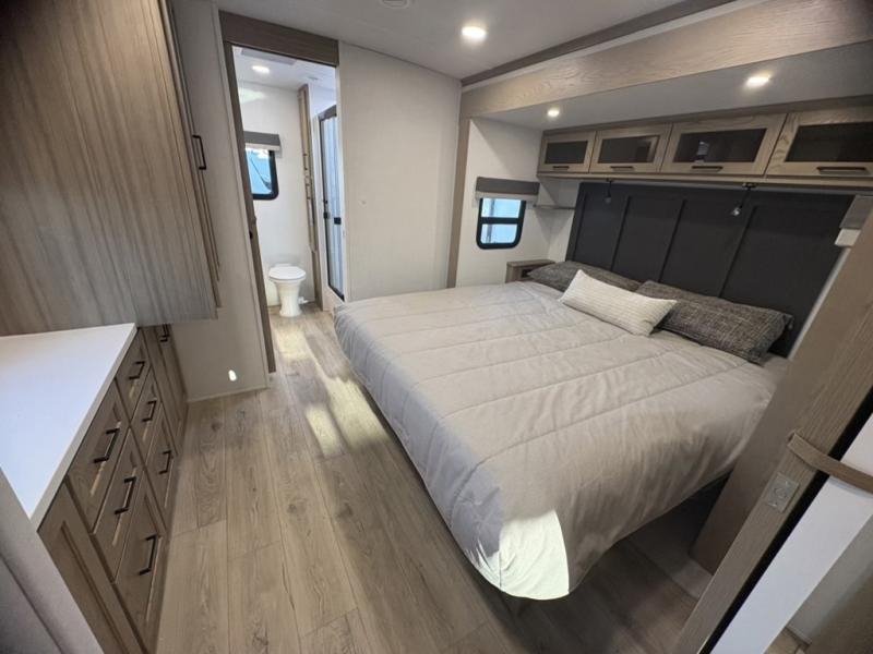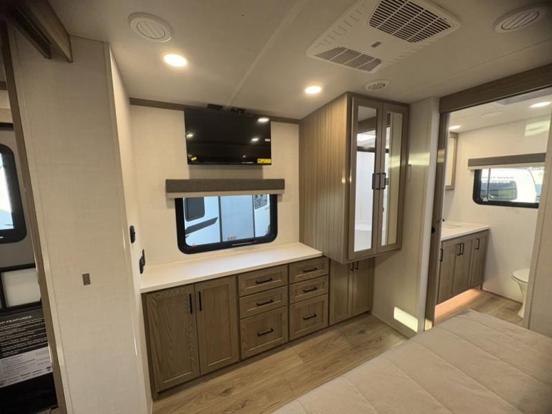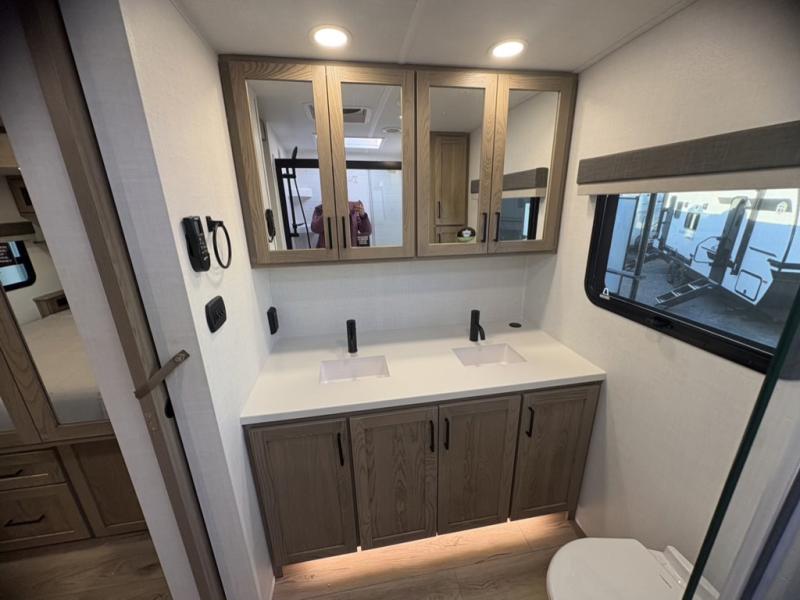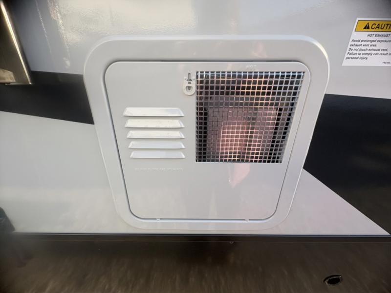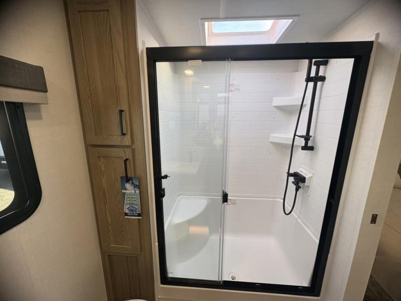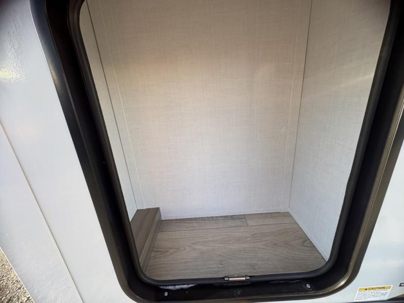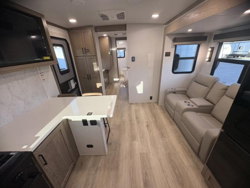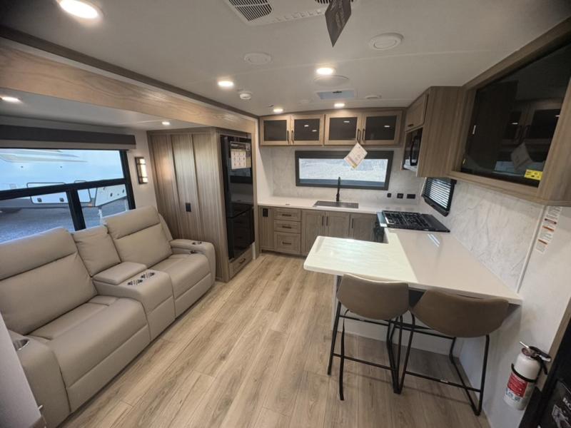 This front kitchen, couple's trailer is ready for adventure when you are! Once you arrive at your destination, prepare a quick lunch with the Griddle Prep, and enjoy the shade provided by the 19' power awning. You can eat outside, or inside at the counter with stools. The 67" theatre seat will make this travel trailer feel more like home, and the double slides provide more space to stretch out. Within the master bedroom you'll find a king bed, a large wardrobe and a dresser, plus an optional TV. And check out the full rear bath with dual bath sinks and a shower with a seat! Now, that's what I call comfort!