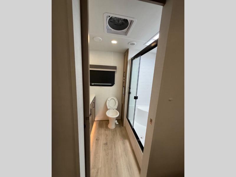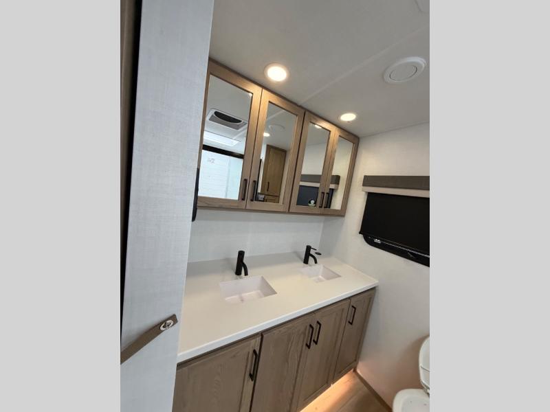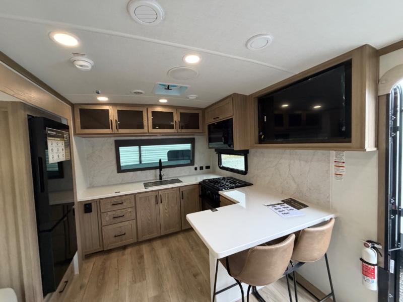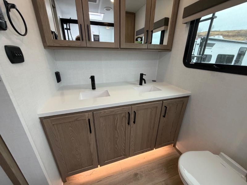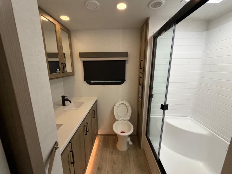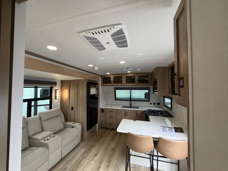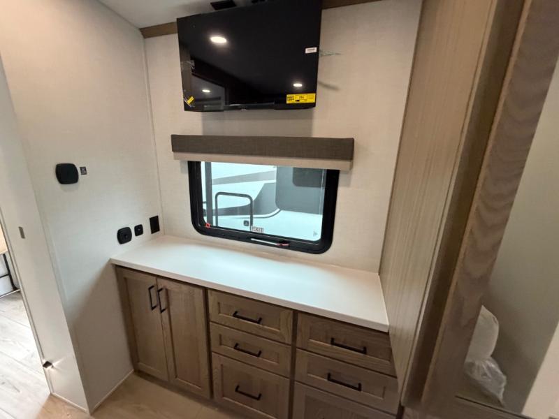 This front kitchen, couple's trailer is ready for adventure when you are! Once you arrive at your destination, prepare a quick lunch with the Griddle Prep, and enjoy the shade provided by the 19' power awning. You can eat outside, or inside at the counter with stools. The 67" theatre seat will make this travel trailer feel more like home, and the double slides provide more space to stretch out. Within the master bedroom you'll find a king bed, a large wardrobe and a dresser, plus an optional TV. And check out the full rear bath with dual bath sinks and a shower with a seat! Now, that's what I call comfort!