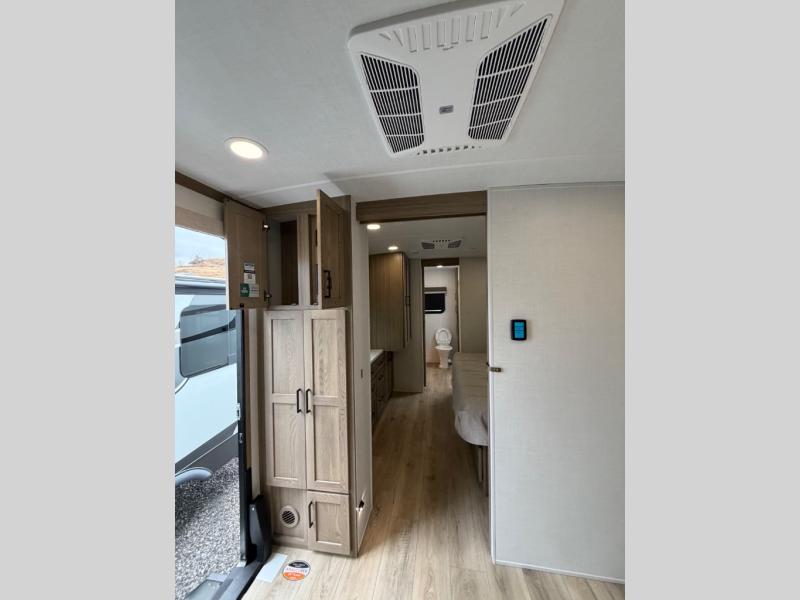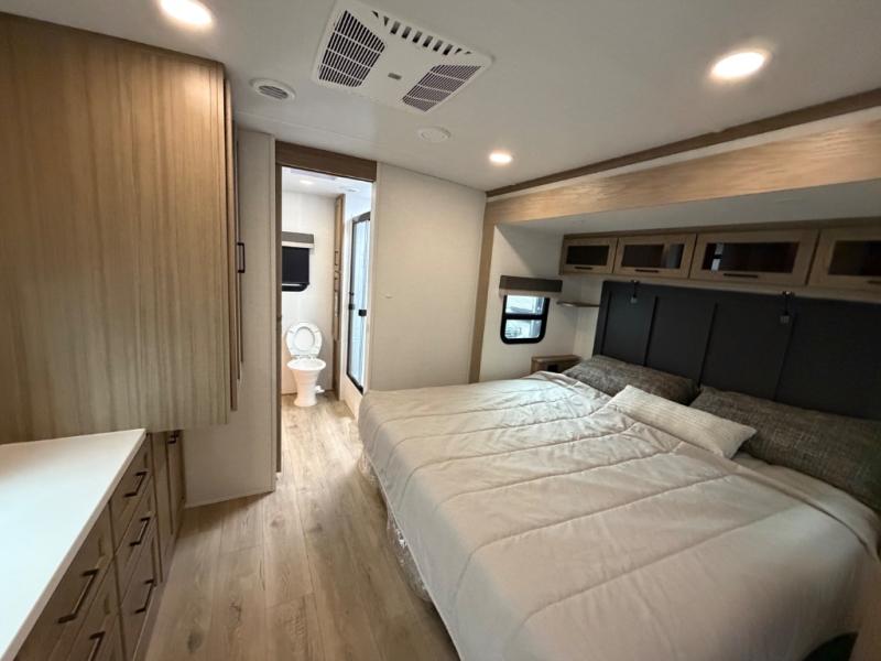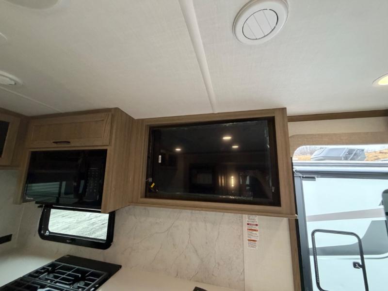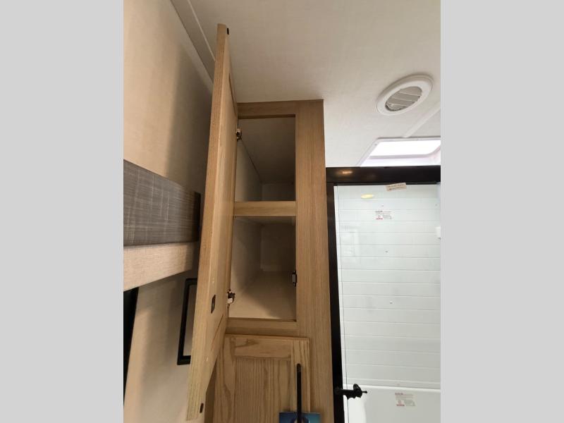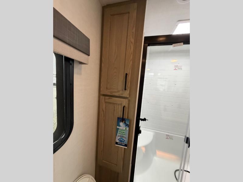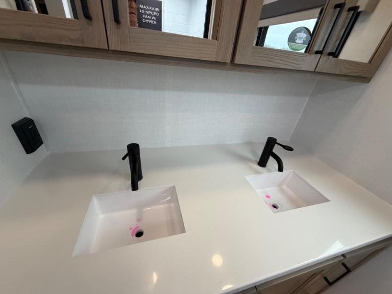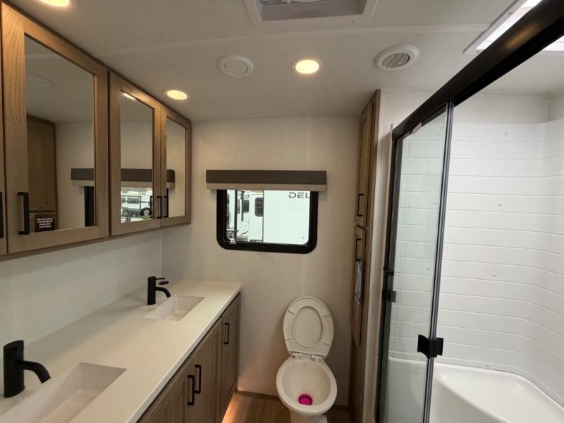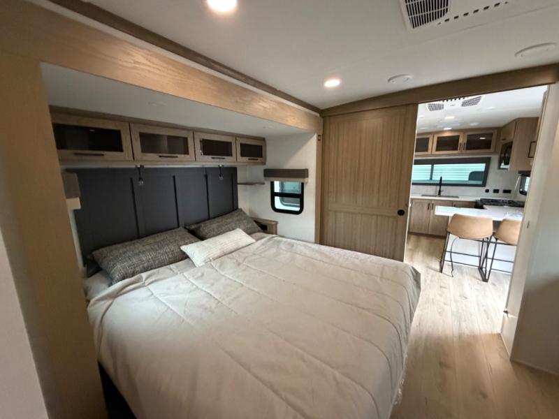 This front kitchen, couple's trailer is ready for adventure when you are! Once you arrive at your destination, prepare a quick lunch with the Griddle Prep, and enjoy the shade provided by the 19' power awning. You can eat outside, or inside at the counter with stools. The 67" theatre seat will make this travel trailer feel more like home, and the double slides provide more space to stretch out. Within the master bedroom you'll find a king bed, a large wardrobe and a dresser, plus an optional TV. And check out the full rear bath with dual bath sinks and a shower with a seat! Now, that's what I call comfort!