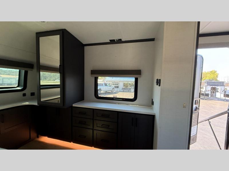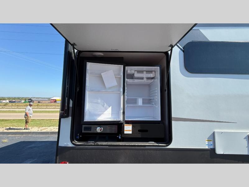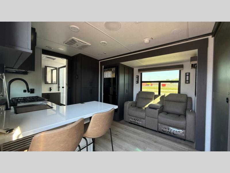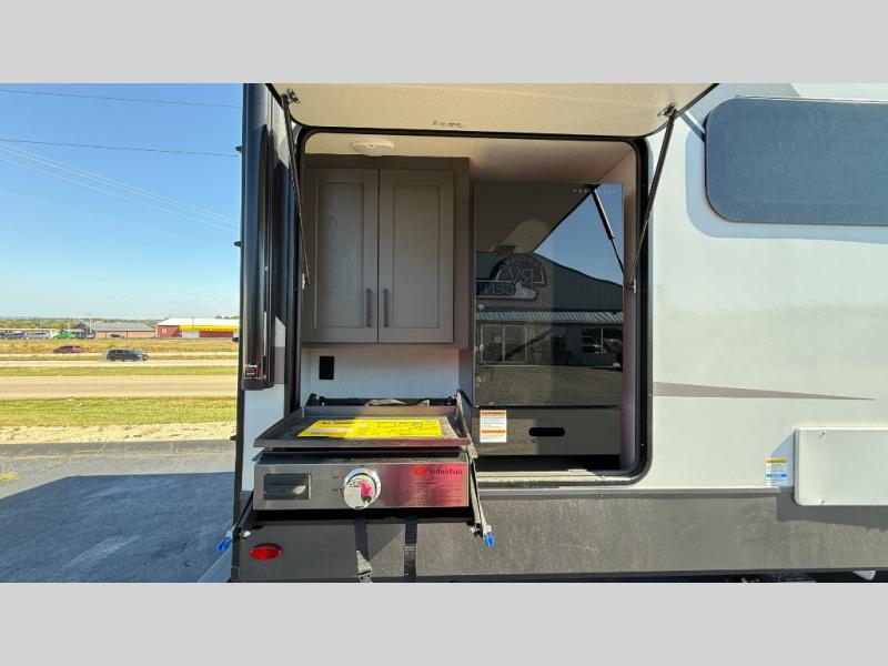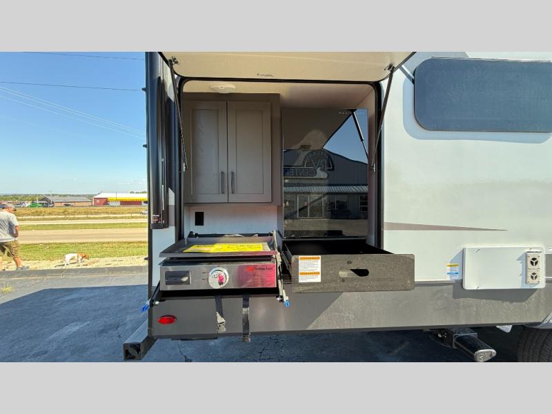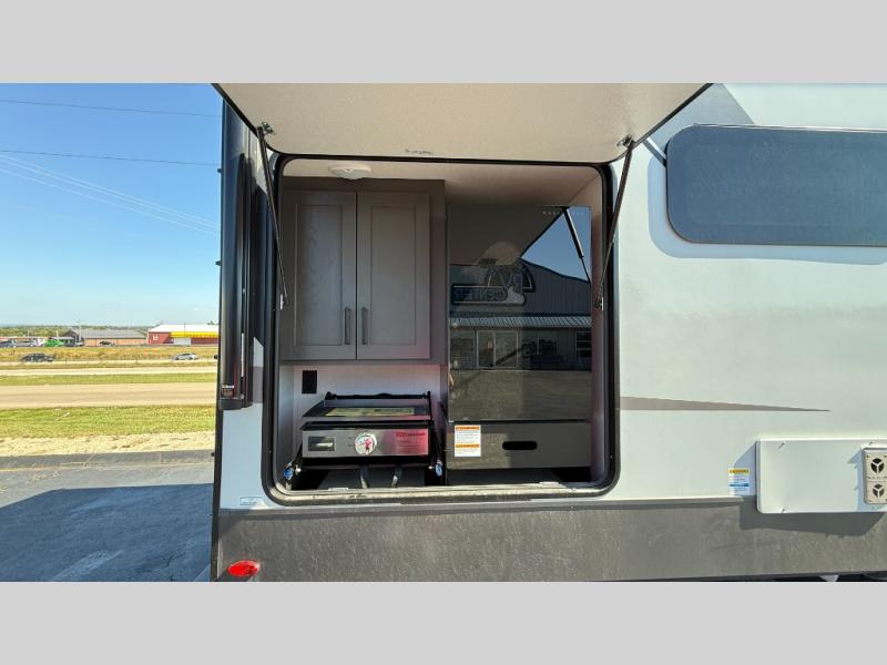 This couple's trailer is ready for adventure when you are! Once you arrive at your destination, prepare a quick lunch inside or outside with the outdoor kitchen and griddle, all while enjoying a bit of shade provided by the 22' power awning. You can eat outside, or inside at the counter with stools. The 67" theatre seat will make this travel trailer feel more like home, and the double slides provide more space to stretch out. Within the master bedroom you'll find a king bed slide, a wardrobe and a closet, plus countertop along the front wall with storage beneath, and a spot for an optional TV. Don't overlook the rear bath with linen storage, a vanity, and a shower with a seat! Now, that's what I call comfort!