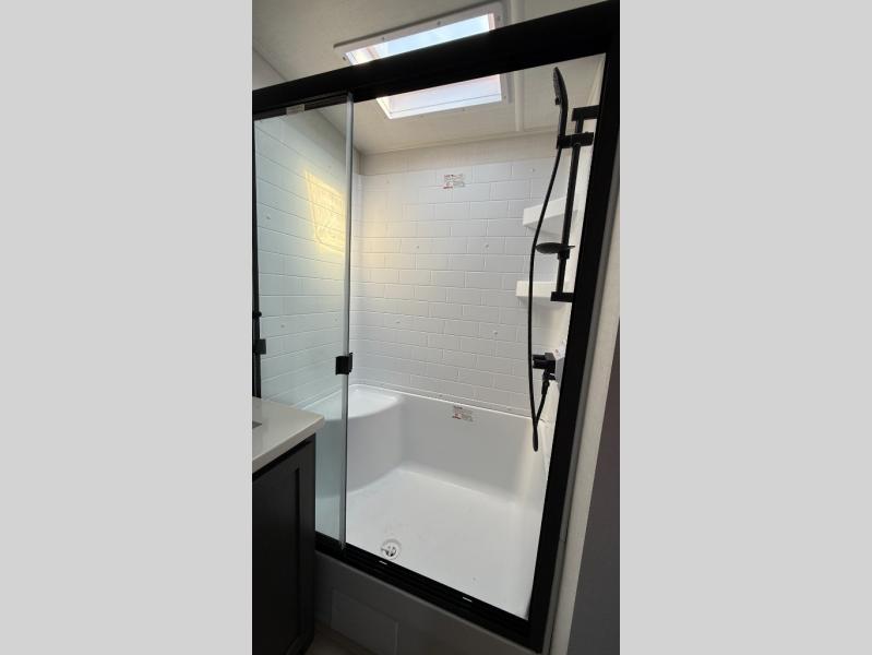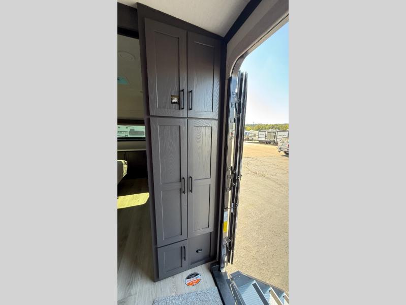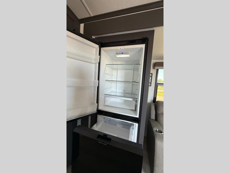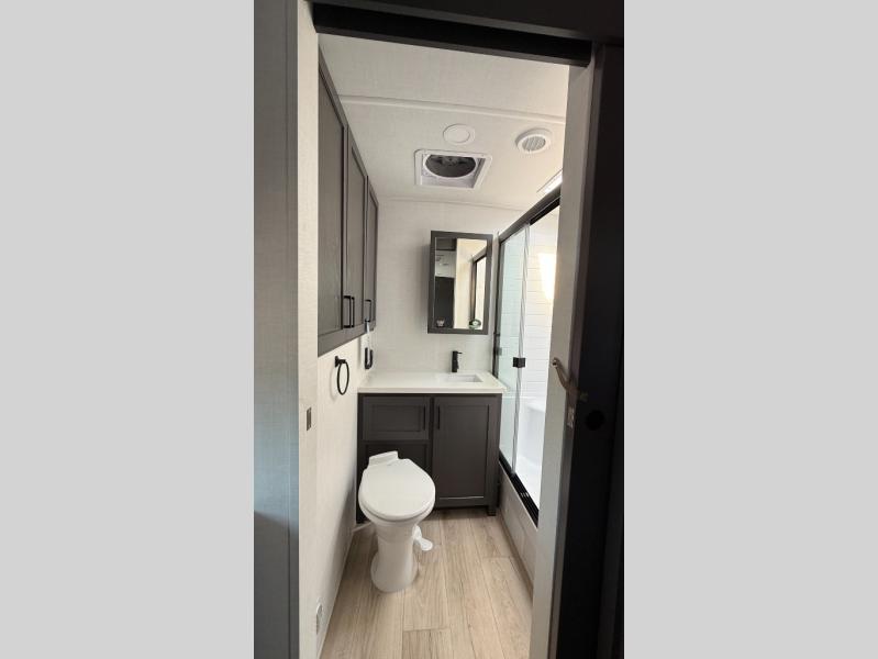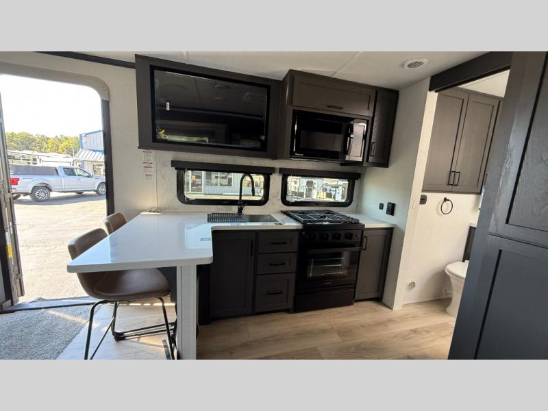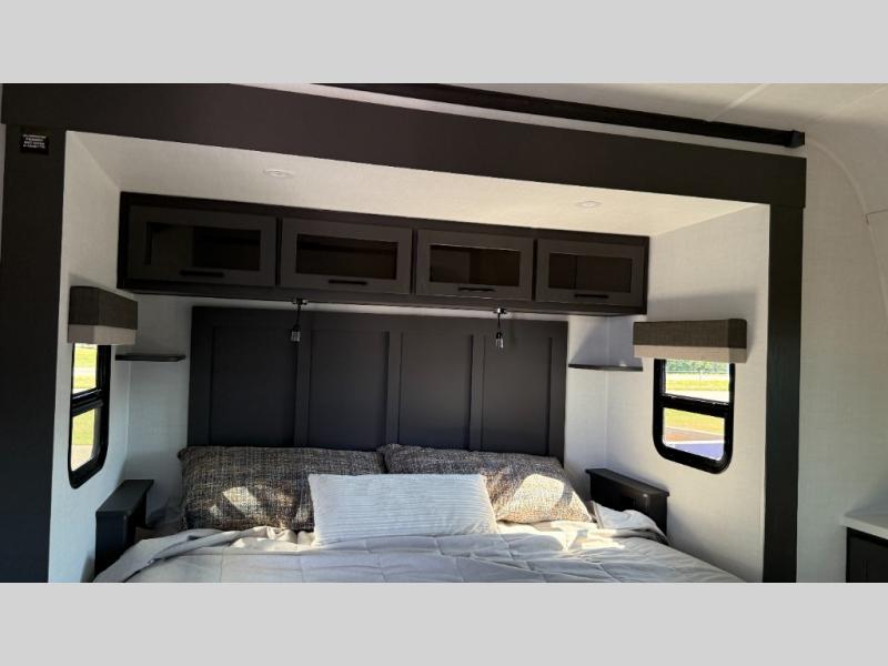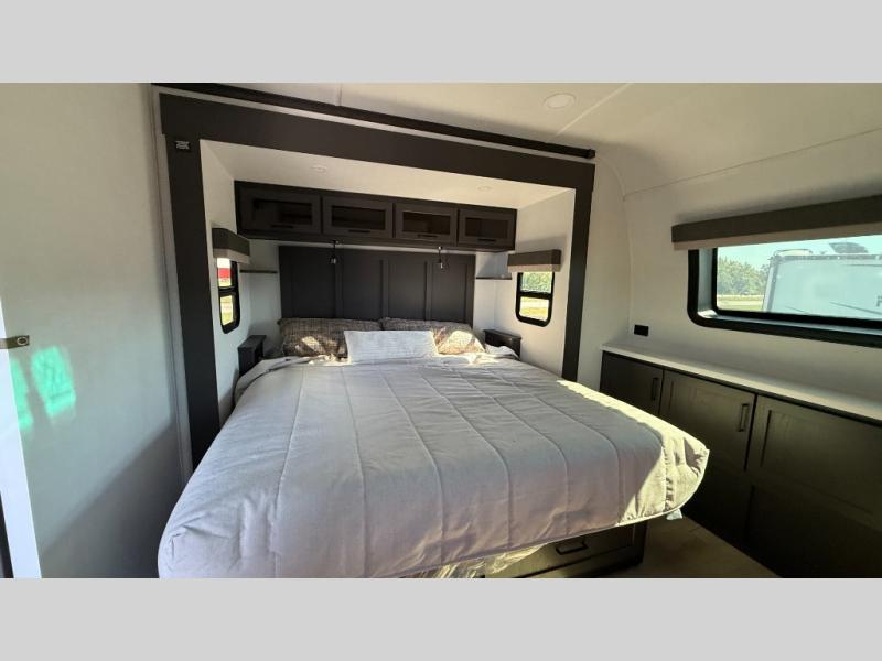 This couple's trailer is ready for adventure when you are! Once you arrive at your destination, prepare a quick lunch inside or outside with the outdoor kitchen and griddle, all while enjoying a bit of shade provided by the 22' power awning. You can eat outside, or inside at the counter with stools. The 67" theatre seat will make this travel trailer feel more like home, and the double slides provide more space to stretch out. Within the master bedroom you'll find a king bed slide, a wardrobe and a closet, plus countertop along the front wall with storage beneath, and a spot for an optional TV. Don't overlook the rear bath with linen storage, a vanity, and a shower with a seat! Now, that's what I call comfort!