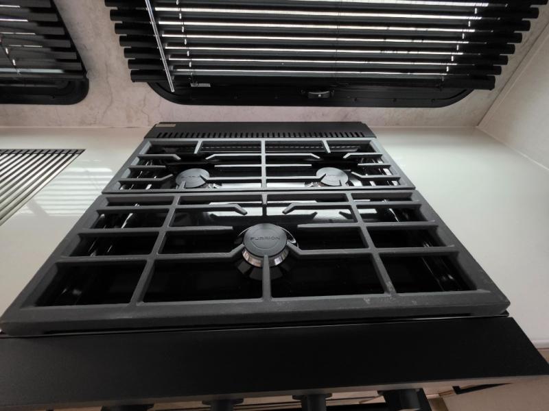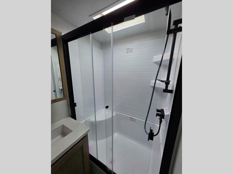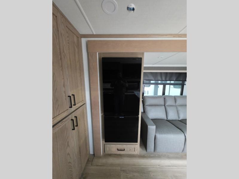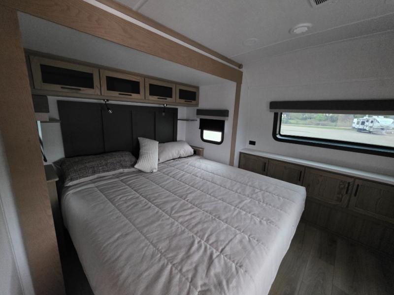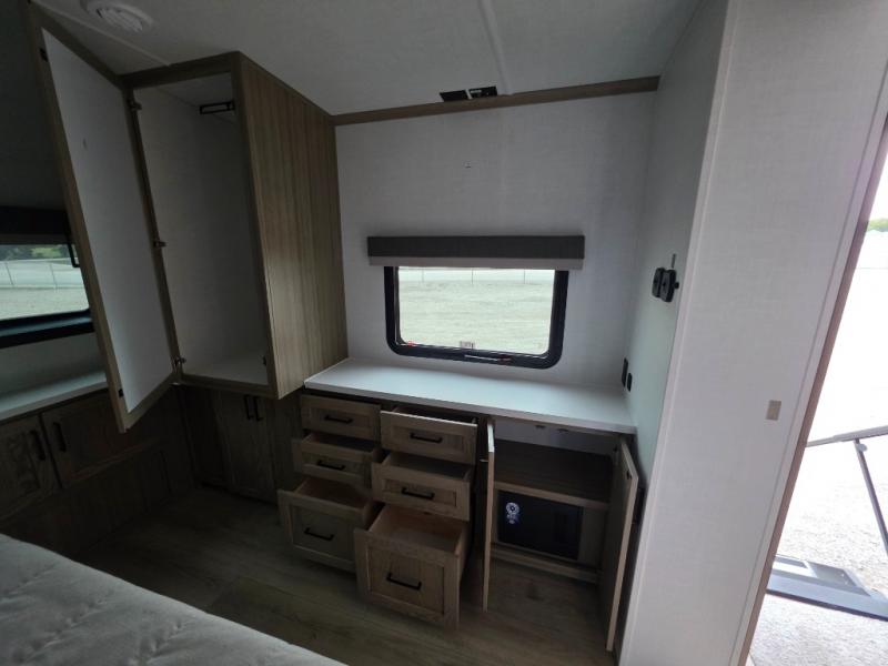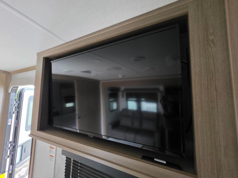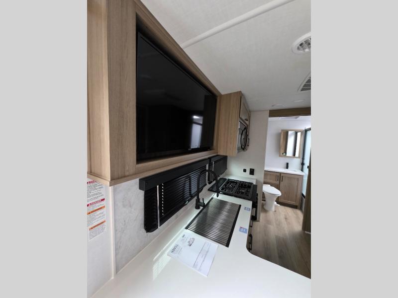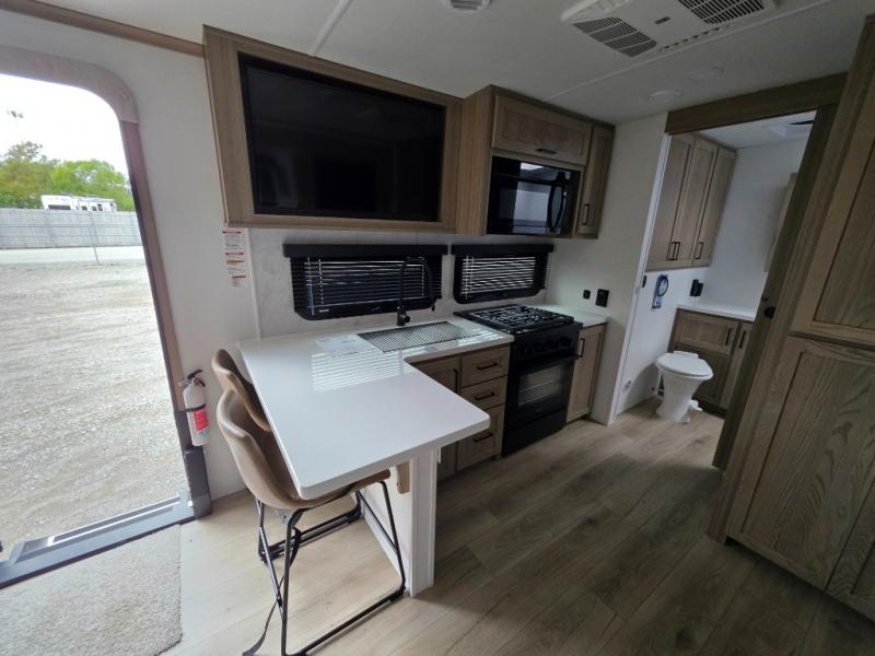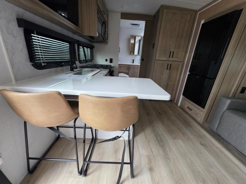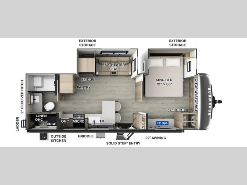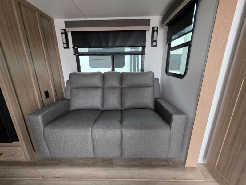 This couple's trailer is ready for adventure when you are! Once you arrive at your destination, prepare a quick lunch inside or outside with the outdoor kitchen and griddle, all while enjoying a bit of shade provided by the 22' power awning. You can eat outside, or inside at the counter with stools. The 67" theatre seat will make this travel trailer feel more like home, and the double slides provide more space to stretch out. Within the master bedroom you'll find a king bed slide, a wardrobe and a closet, plus countertop along the front wall with storage beneath, and a spot for an optional TV. Don't overlook the rear bath with linen storage, a vanity, and a shower with a seat! Now, that's what I call comfort!