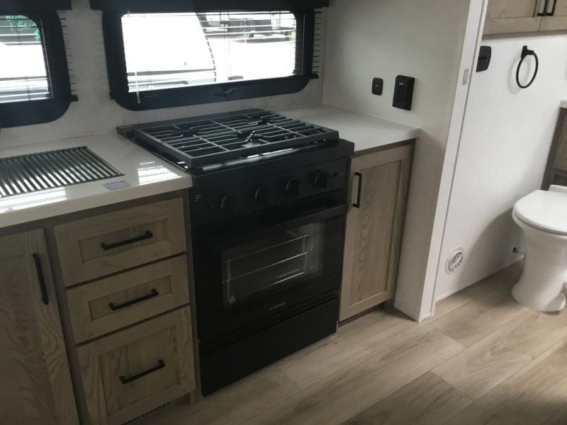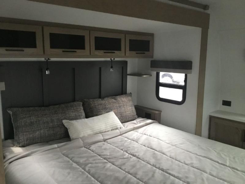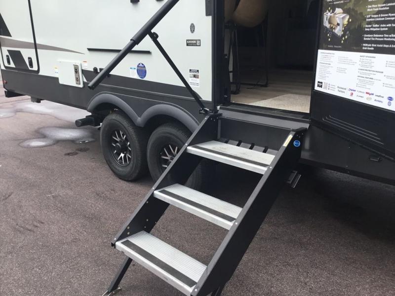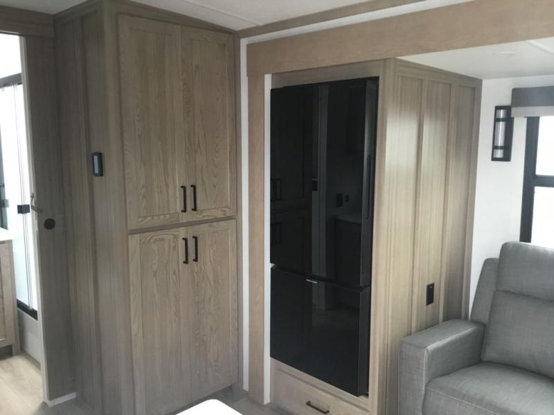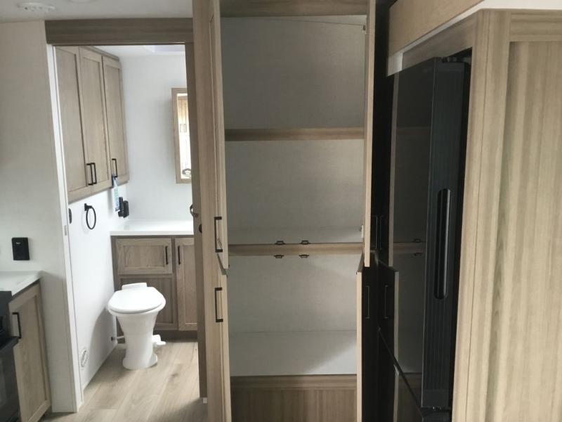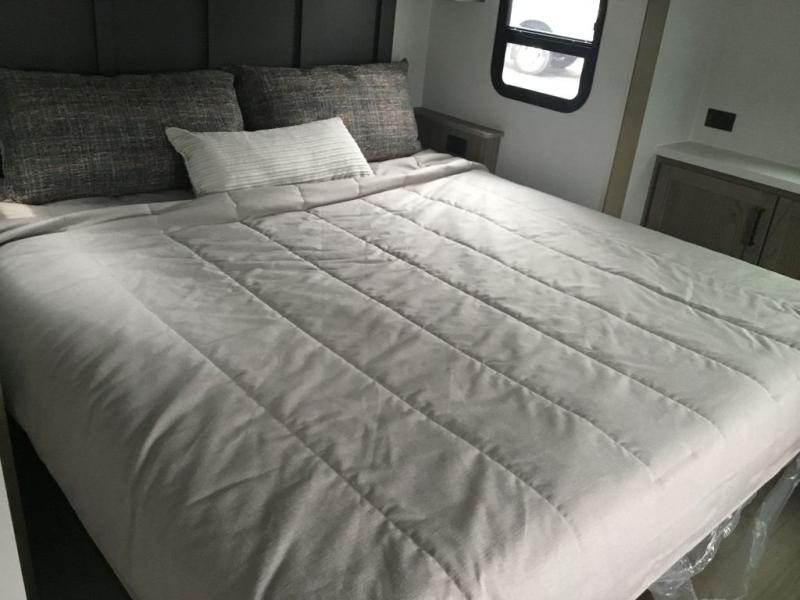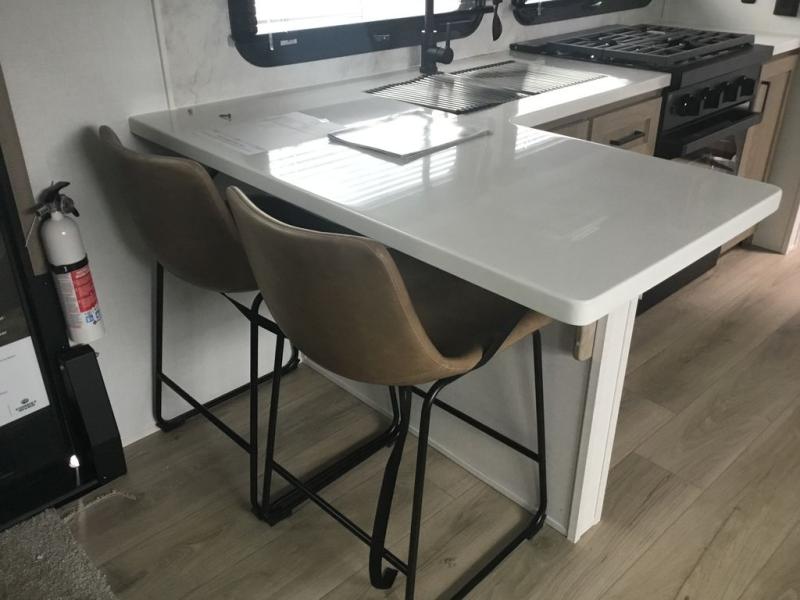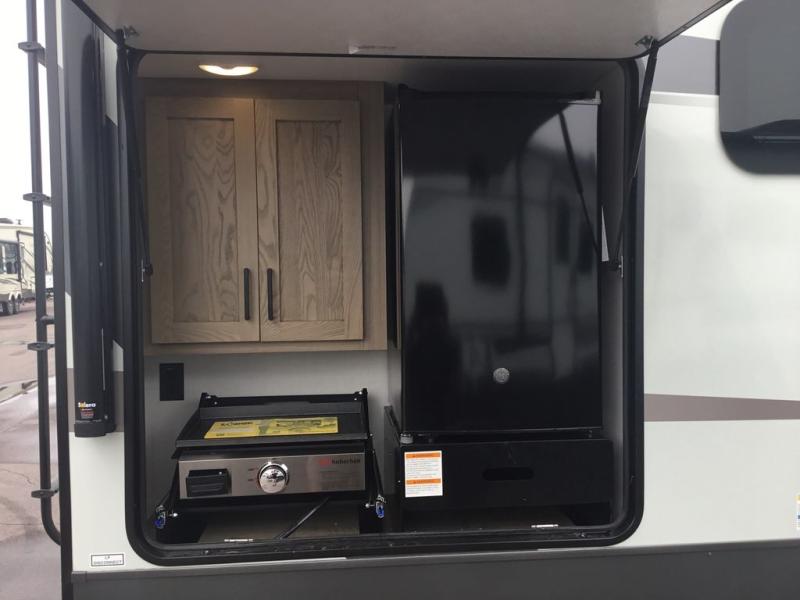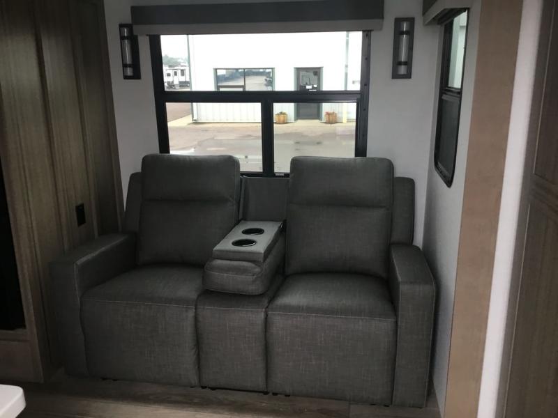 This couple's trailer is ready for adventure when you are! Once you arrive at your destination, prepare a quick lunch inside or outside with the outdoor kitchen and griddle, all while enjoying a bit of shade provided by the 22' power awning. You can eat outside, or inside at the counter with stools. The 67" theatre seat will make this travel trailer feel more like home, and the double slides provide more space to stretch out. Within the master bedroom you'll find a king bed slide, a wardrobe and a closet, plus countertop along the front wall with storage beneath, and a spot for an optional TV. Don't overlook the rear bath with linen storage, a vanity, and a shower with a seat! Now, that's what I call comfort!
