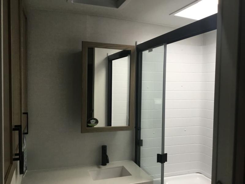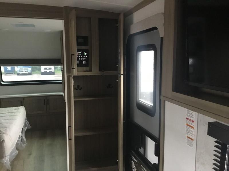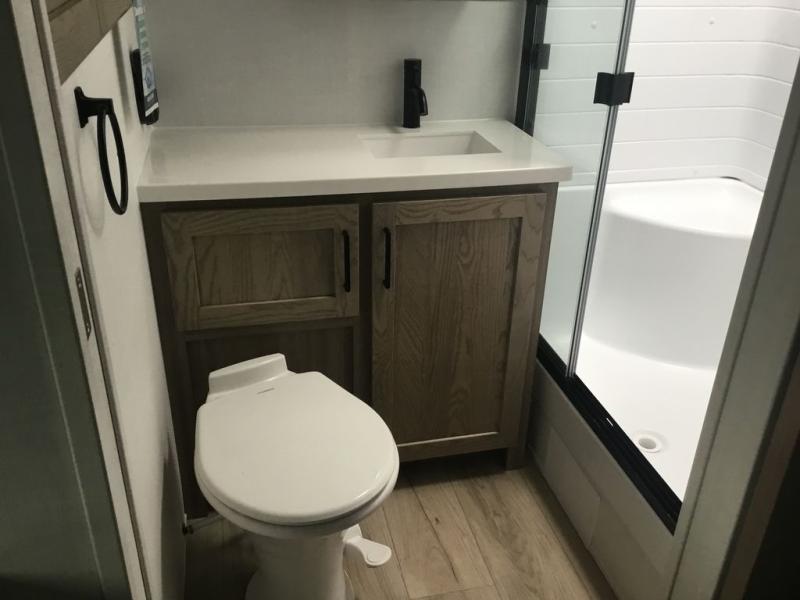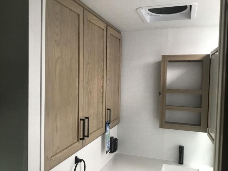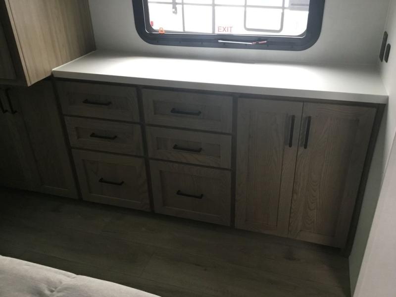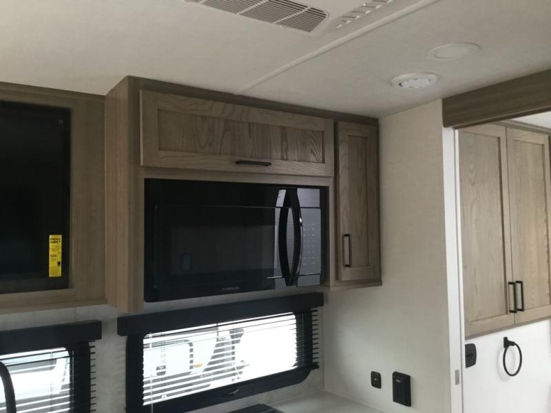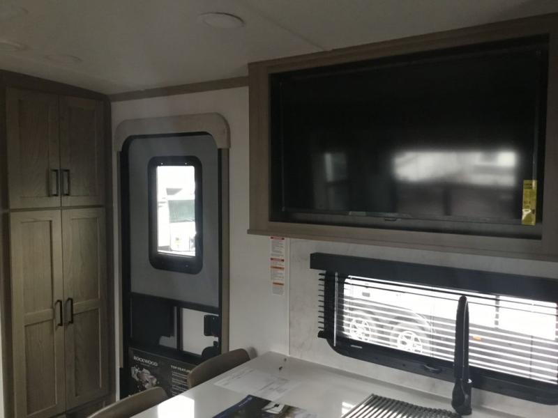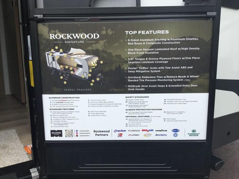 With any Rockwood Signature fifth wheel or travel trailer by Forest River RV, you will enjoy superior construction that includes laminated white fiberglass sidewalls, a radius roof with vaulted interior ceilings, plus radiant foil insulation and an enclosed underbelly for use in all types of weather. Some convenient exterior features include Keyed Alike locks, a rear ladder, a 200W solar panel, and a tire pressure monitor system with a monitor for added safety. The interior offers a One Touch OneControl panel with WeRV app control, for lights, awning, slides, water heater and more, and the Air 360+ omnidirectional antenna with WiFi prep lets you work while away from home if needed. You will also appreciate the interior vaulted ceilings, residential soft close doors and drawers, solid surface kitchen countertops, and designer kitchen backsplash!