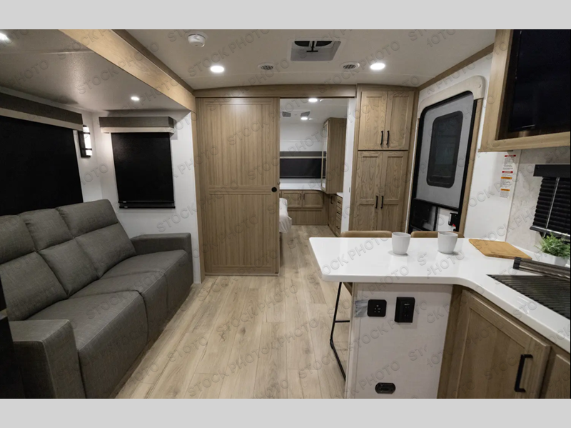 This couple's trailer is ready for adventure when you are! Once you arrive at your destination, prepare a quick lunch inside or outside with the outdoor kitchen and griddle, all while enjoying a bit of shade provided by the 22' power awning. You can eat outside, or inside at the counter with stools. The 67" theatre seat will make this travel trailer feel more like home, and the double slides provide more space to stretch out. Within the master bedroom you'll find a king bed slide, a wardrobe and a closet, plus countertop along the front wall with storage beneath, and a spot for an optional TV. Don't overlook the rear bath with linen storage, and a shower with a seat! Now, that's what I call comfort!