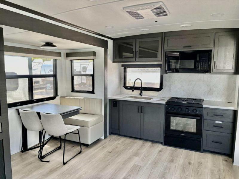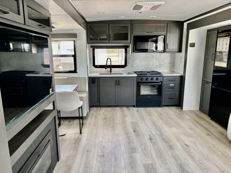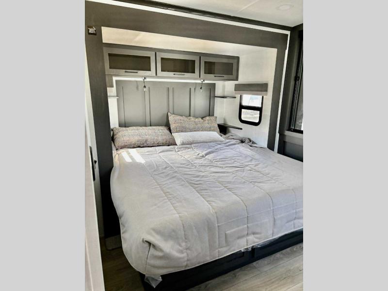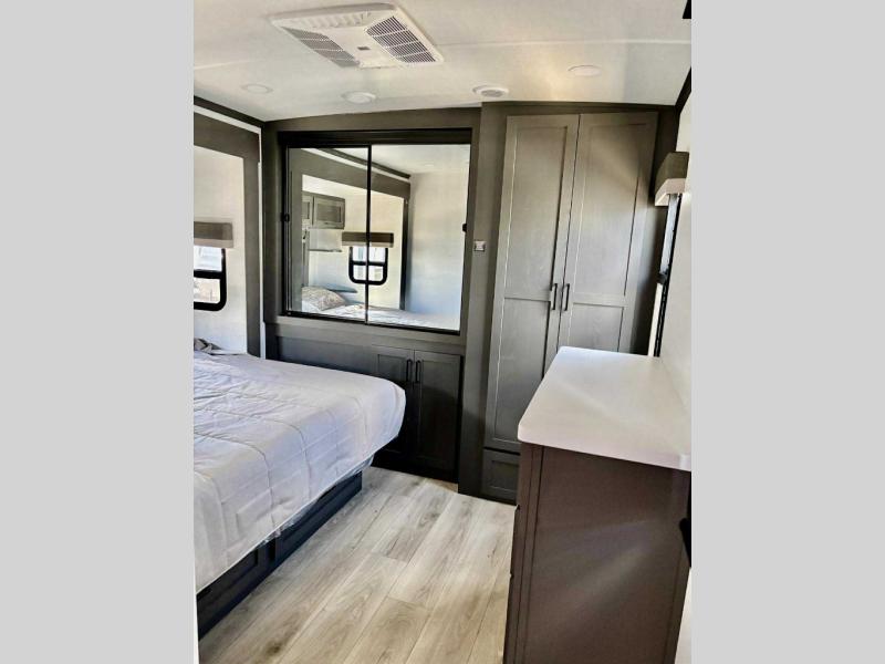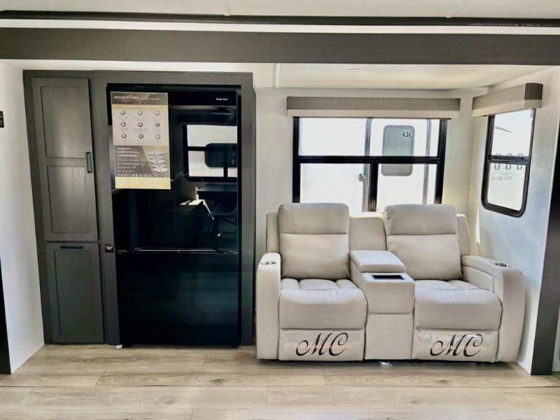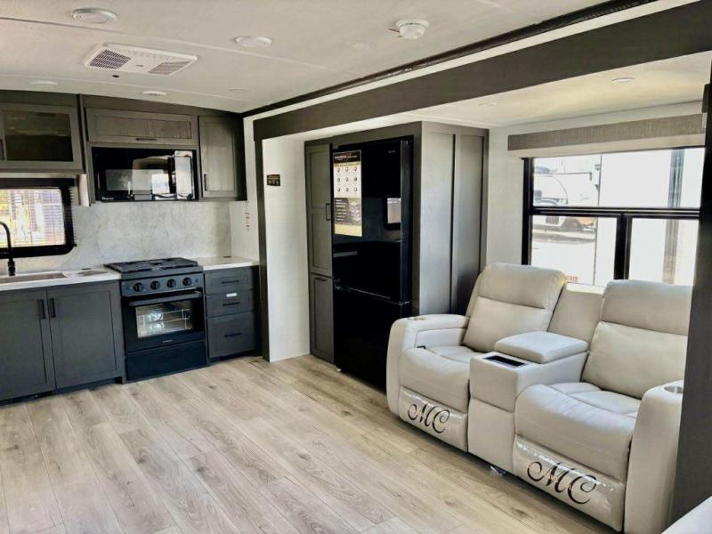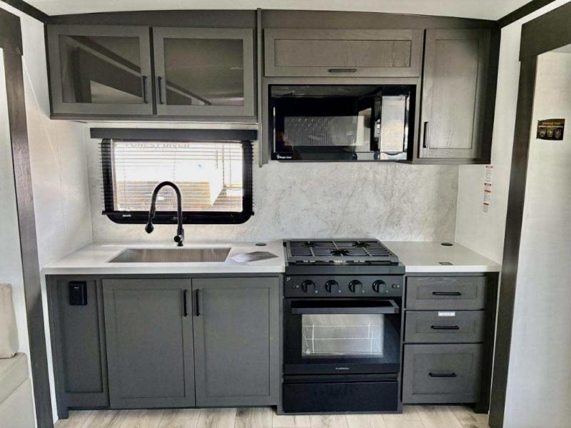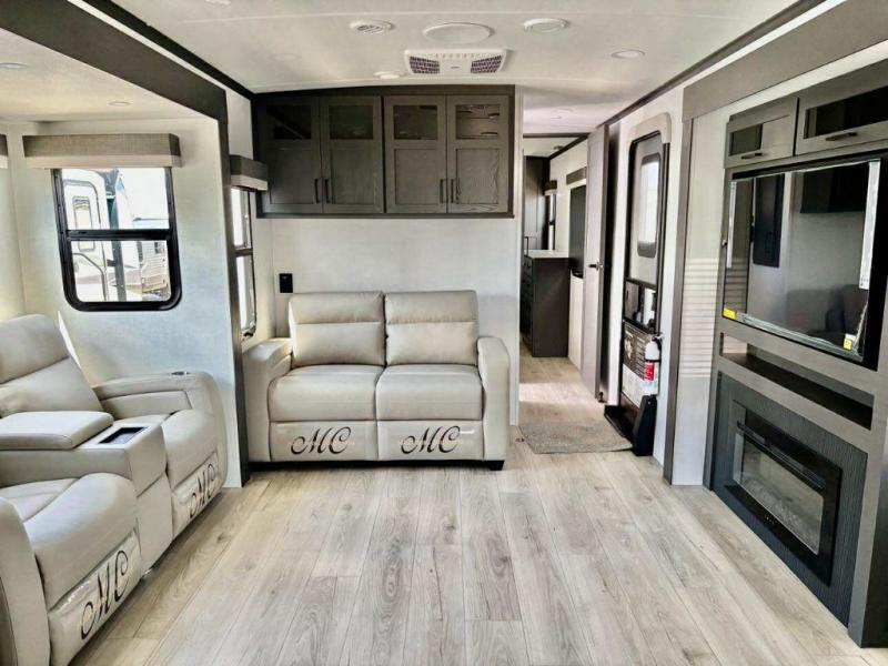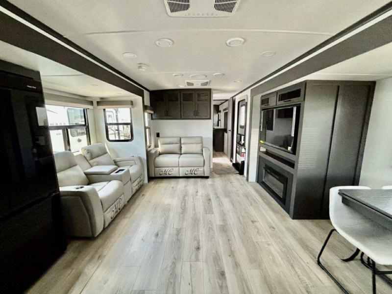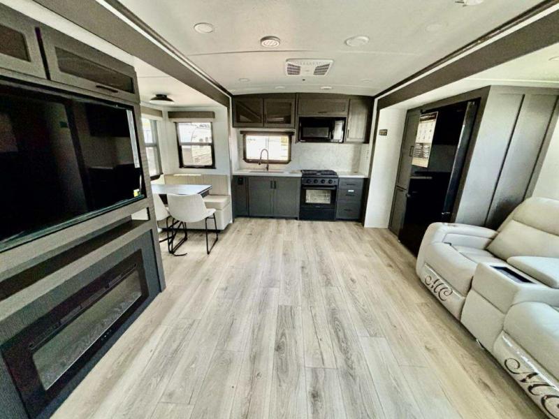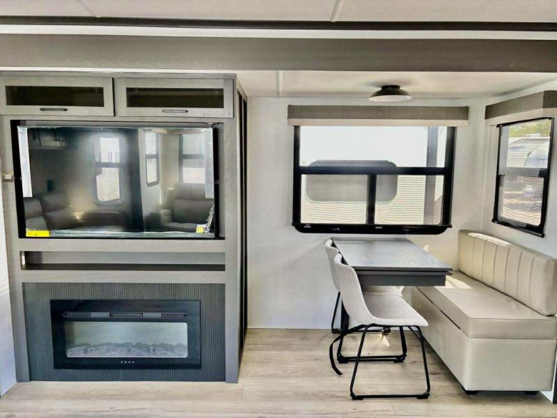 One step inside this rear kitchen travel trailer and you'll be sold! The dual opposing slides create an open floorplan you are sure to love, and you'll find plenty of seating spaces on the theater seat, the hide-a-bed sofa, and the table, chairs & bench. There is an entertainment center here with a Smart TV, plus a fireplace for those cooler nights. The full bath includes a shower with a seat, and the front private bedroom includes a queen bed slide out for more floor space. You can easily store your items in the large front wardrobe, plus there is a dresser and additional storage with washer and dryer prep. And check out the exterior with two power awnings, an outside kitchen, plus exterior storage for all your gear!