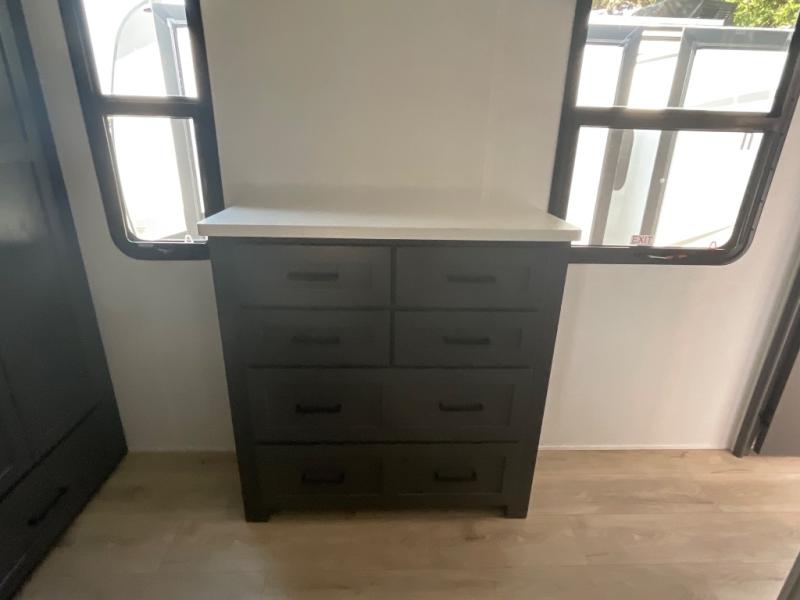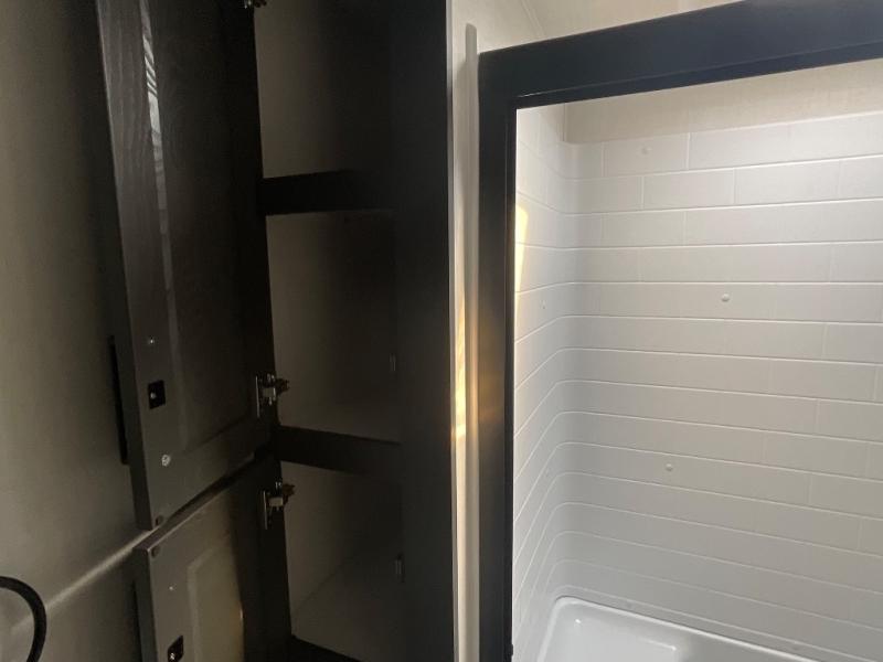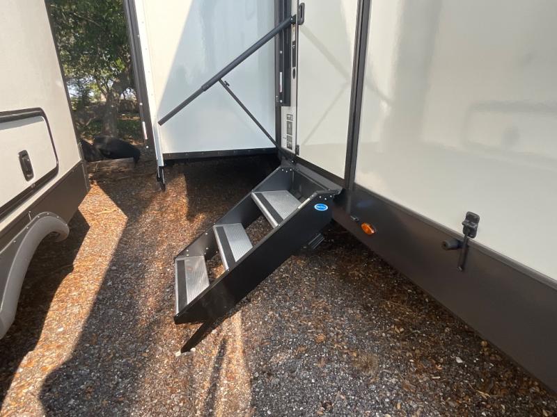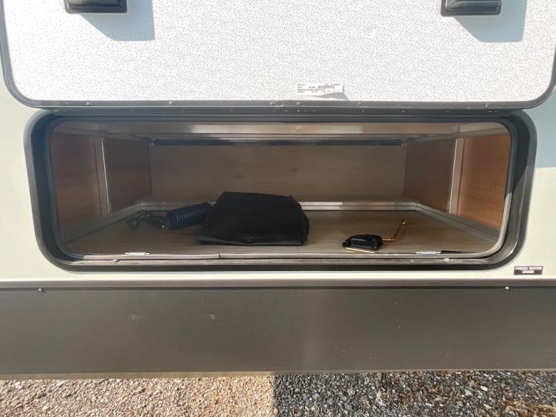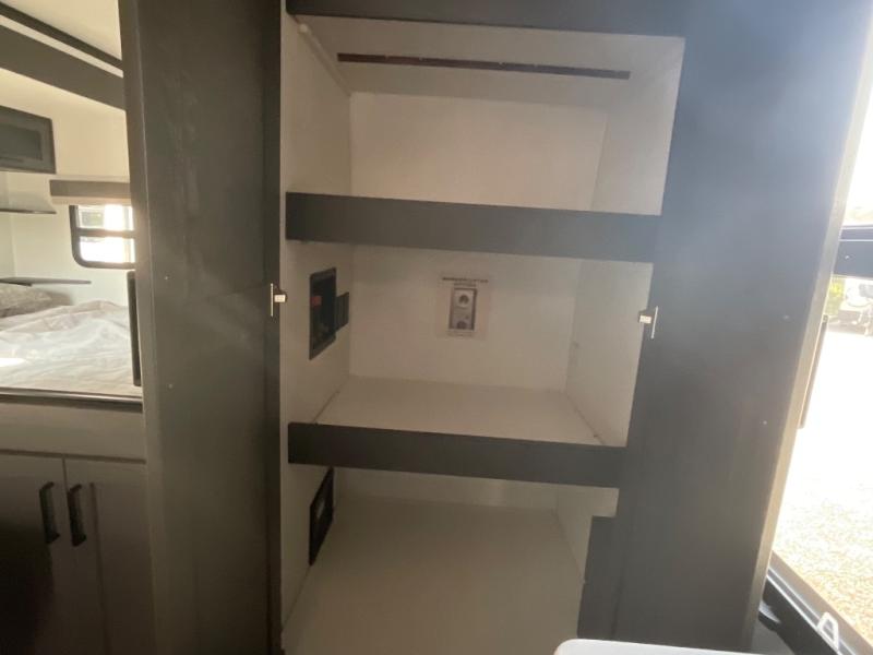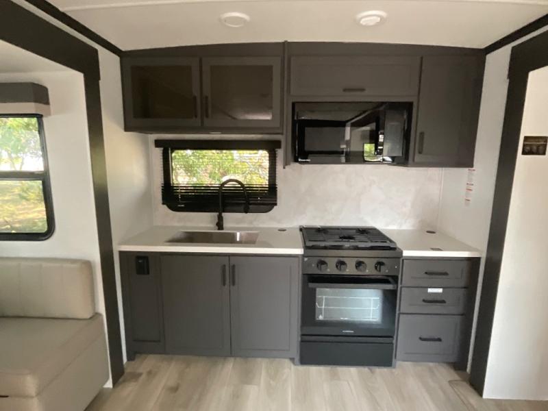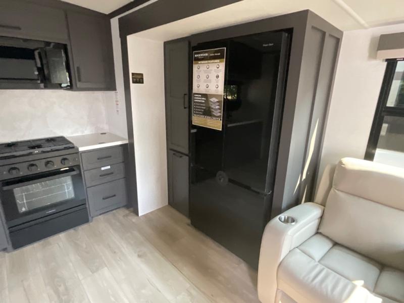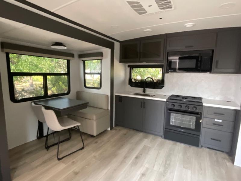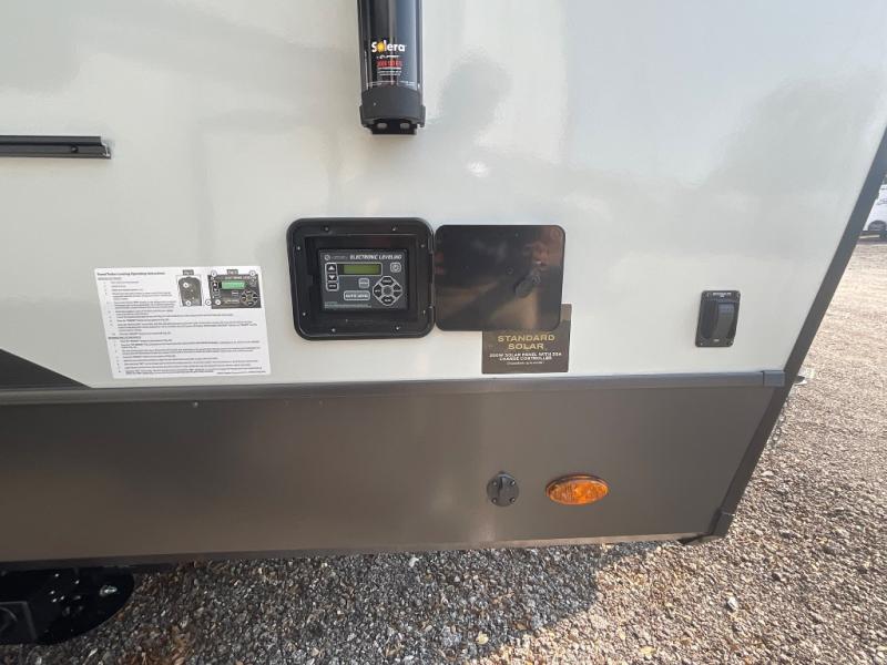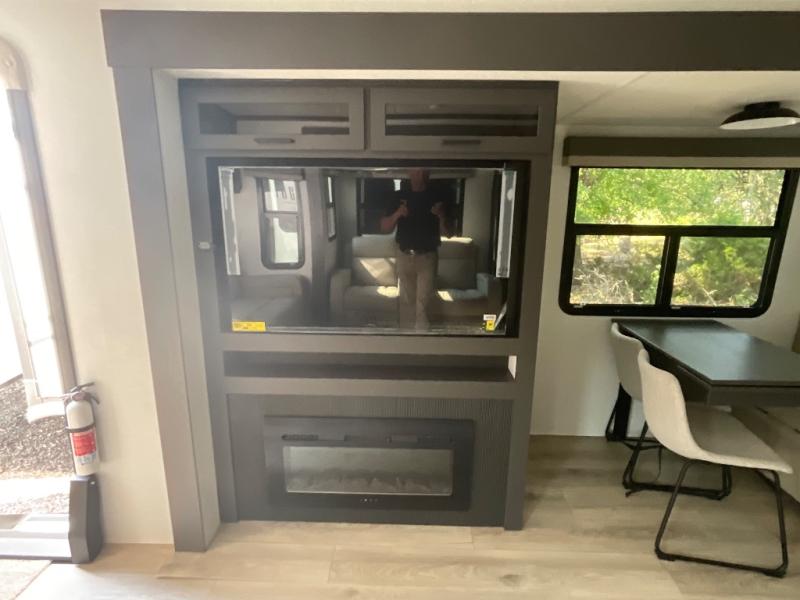 One step inside this rear kitchen travel trailer and you'll be sold! The dual opposing slides create an open floorplan you are sure to love, and you'll find plenty of seating spaces on the theater seat, the hide-a-bed sofa, and the table, chairs & bench. There is an entertainment center here with a Smart TV, plus a fireplace for those cooler nights. The full bath includes a shower with a seat, and the front private bedroom includes a queen bed slide out for more floor space. You can easily store your items in the large front wardrobe, plus there is a dresser and additional storage with washer and dryer prep. And check out the exterior with two power awnings, an outside kitchen, plus exterior storage for all your gear!