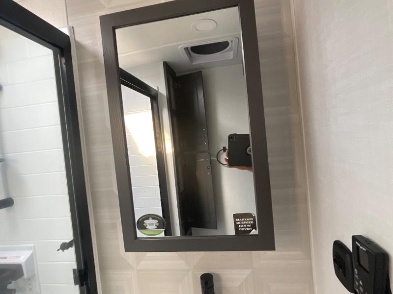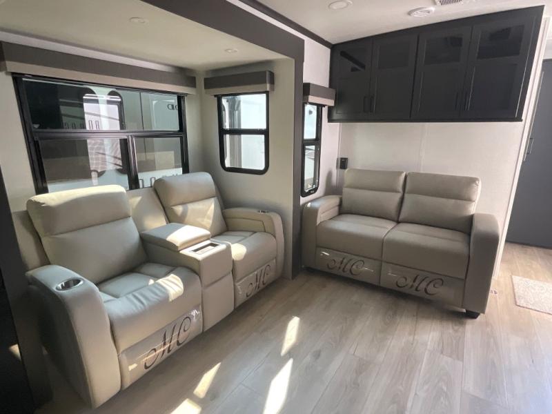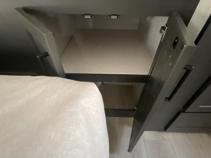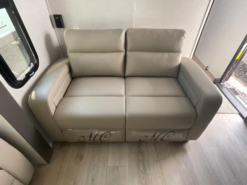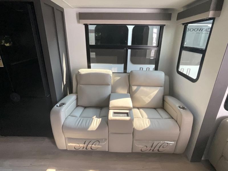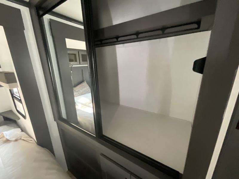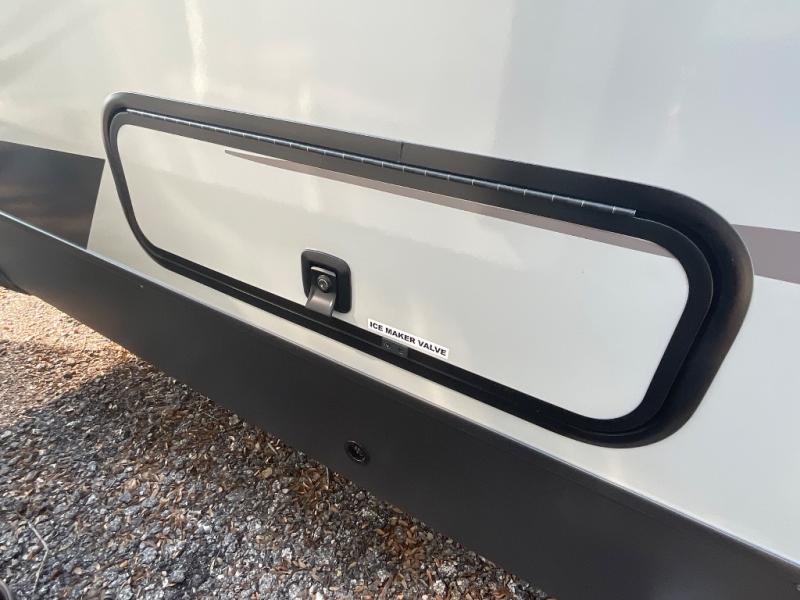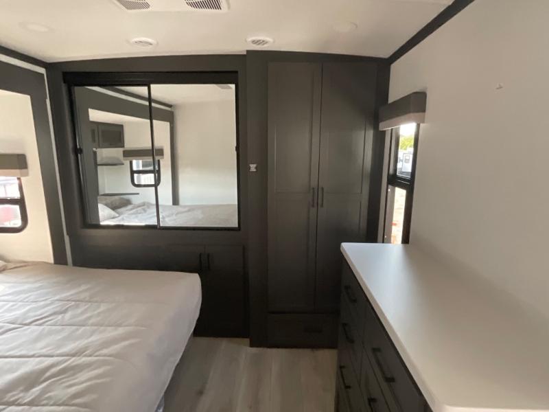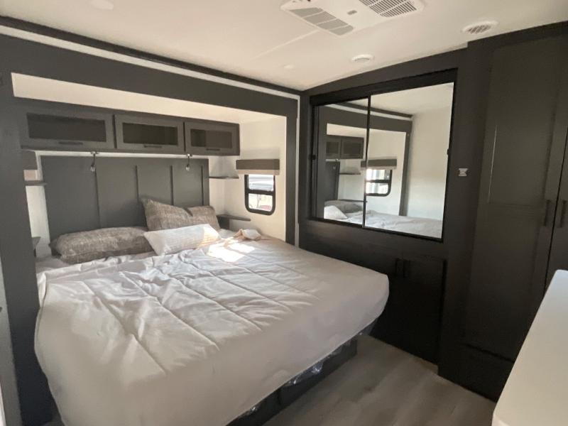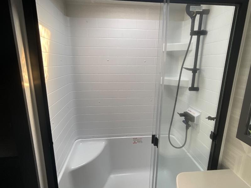 One step inside this rear kitchen travel trailer and you'll be sold! The dual opposing slides create an open floorplan you are sure to love, and you'll find plenty of seating spaces on the theater seat, the hide-a-bed sofa, and the table, chairs & bench. There is an entertainment center here with a Smart TV, plus a fireplace for those cooler nights. The full bath includes a shower with a seat, and the front private bedroom includes a queen bed slide out for more floor space. You can easily store your items in the large front wardrobe, plus there is a dresser and additional storage with washer and dryer prep. And check out the exterior with two power awnings, an outside kitchen, plus exterior storage for all your gear!