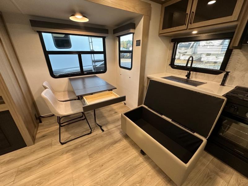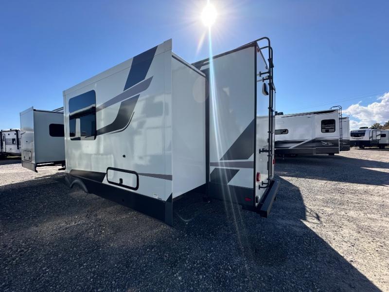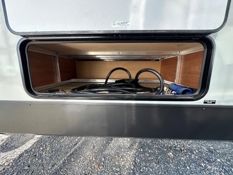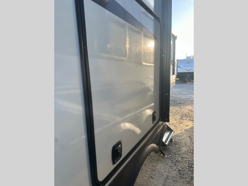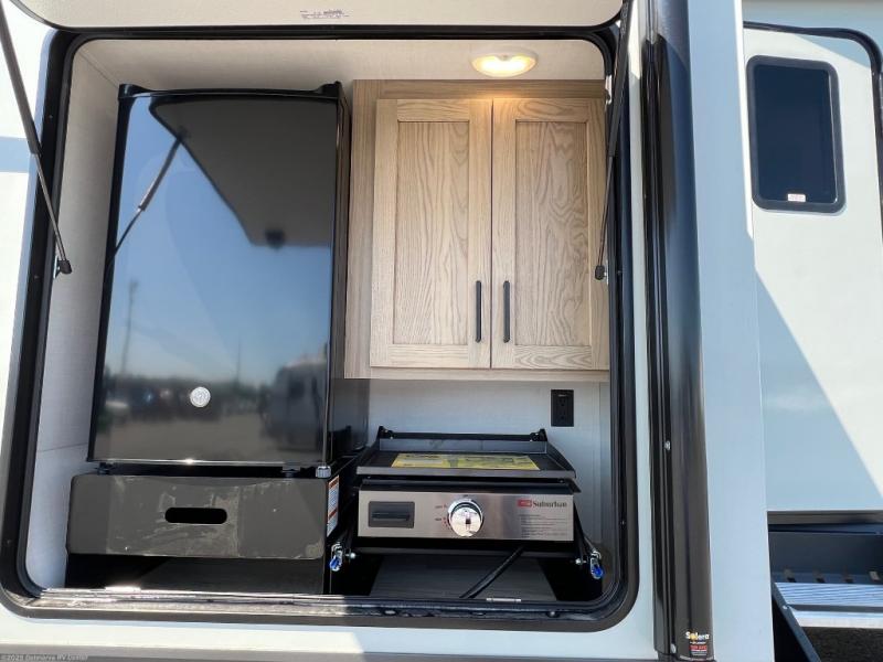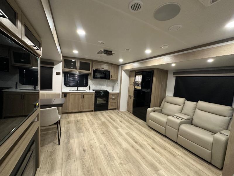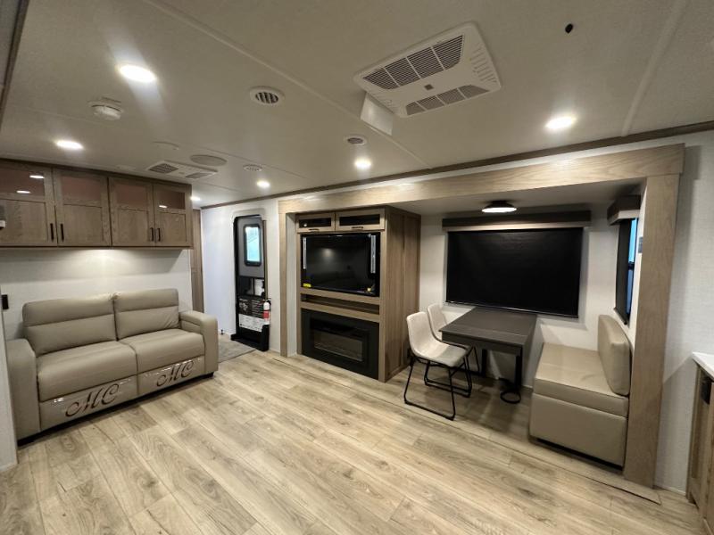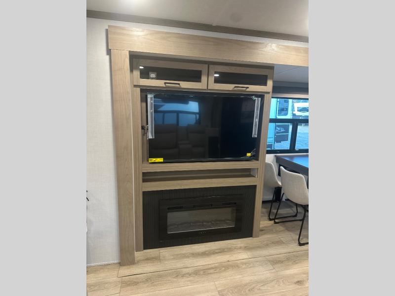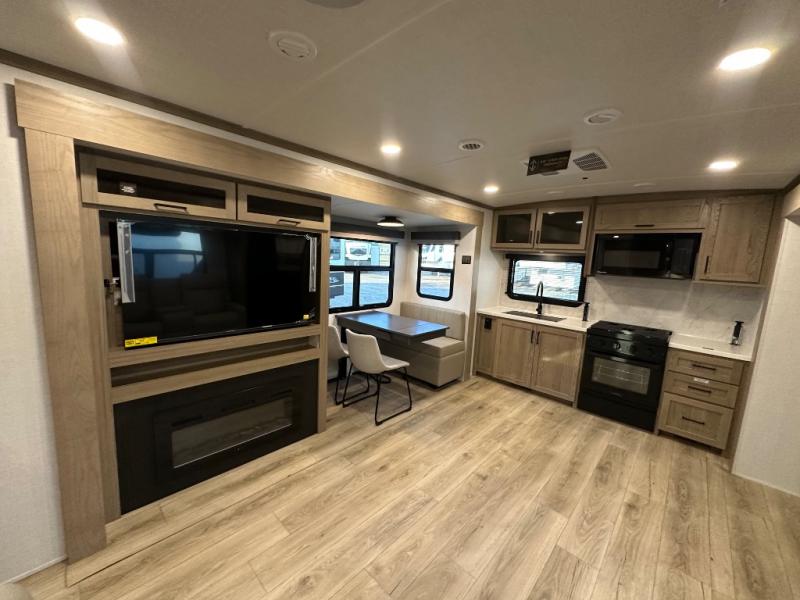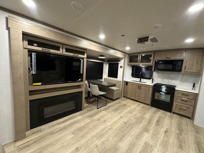 One step inside this rear kitchen travel trailer and you'll be sold! The dual opposing slides create an open floorplan you are sure to love, and you'll find plenty of seating spaces on the theater seat, the hide-a-bed sofa, and the table, chairs & bench. There is an entertainment center here with a Smart TV, plus a fireplace for those cooler nights. The full bath includes a shower with a seat, and the front private bedroom includes a queen bed slide out for more floor space. You can easily store your items in the large front wardrobe, plus there is a dresser and additional storage with washer and dryer prep. And check out the exterior with two power awnings, an outside kitchen, plus exterior storage for all your gear!