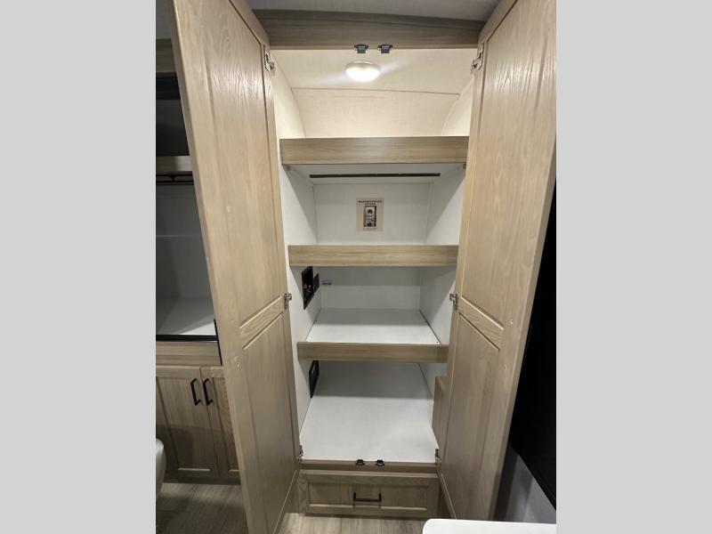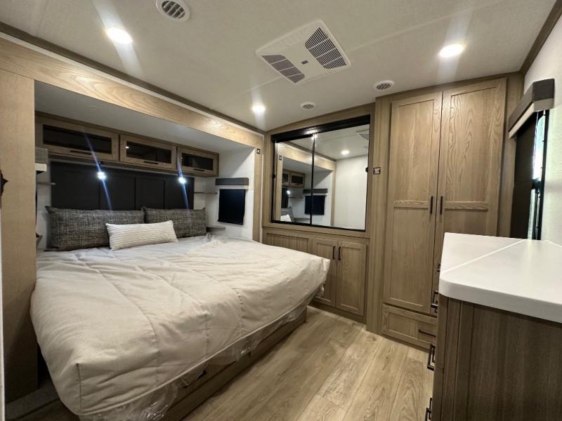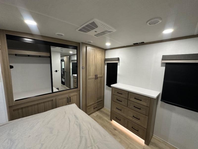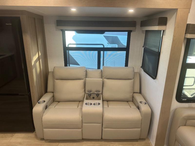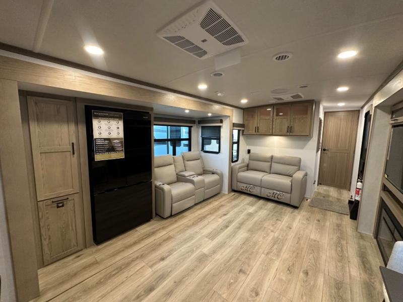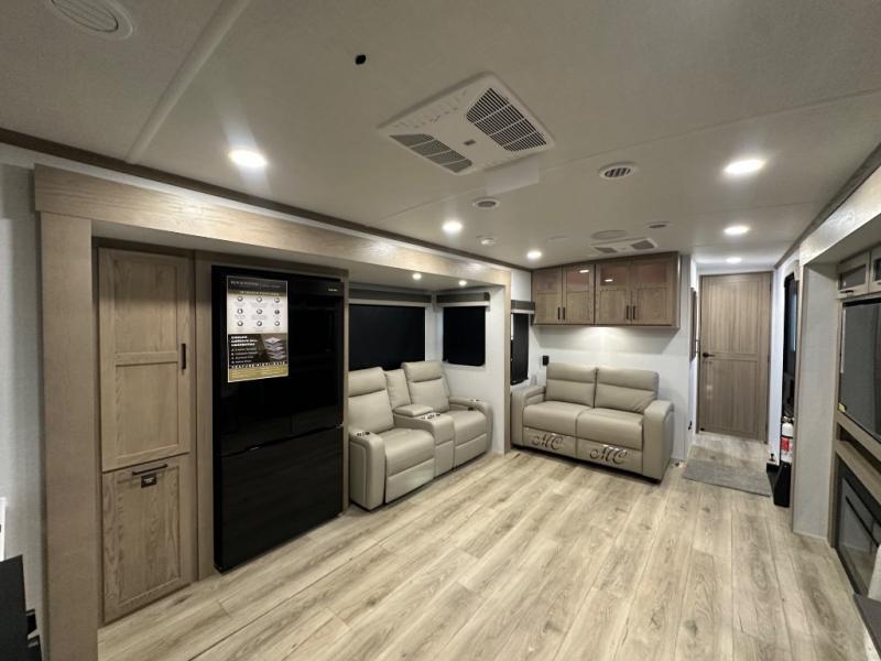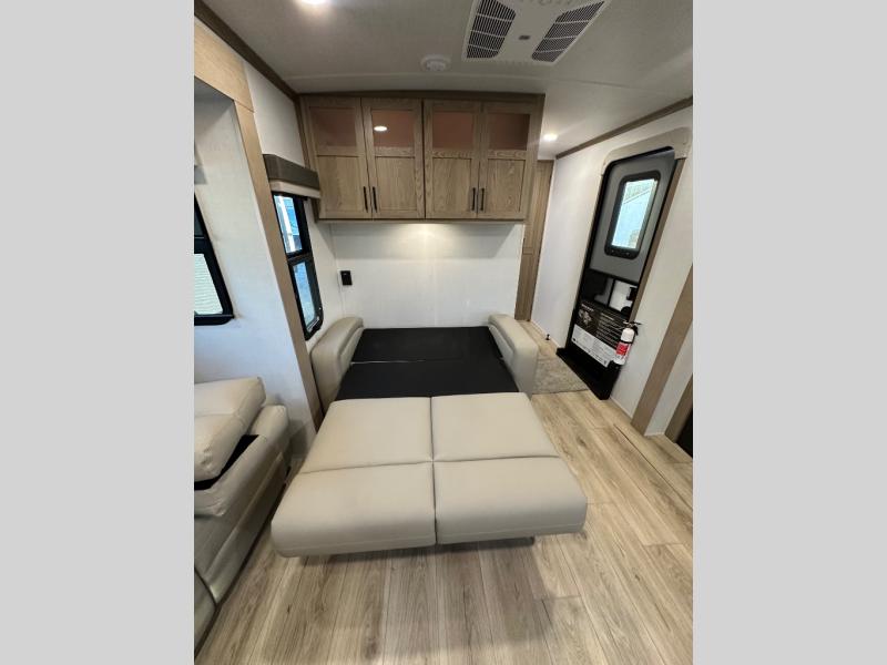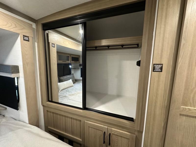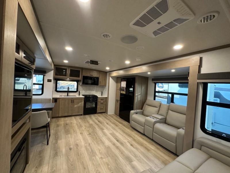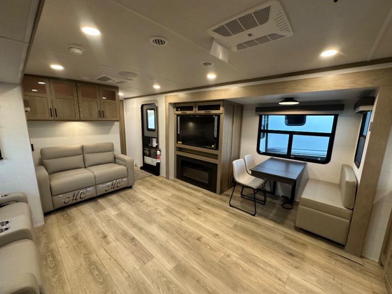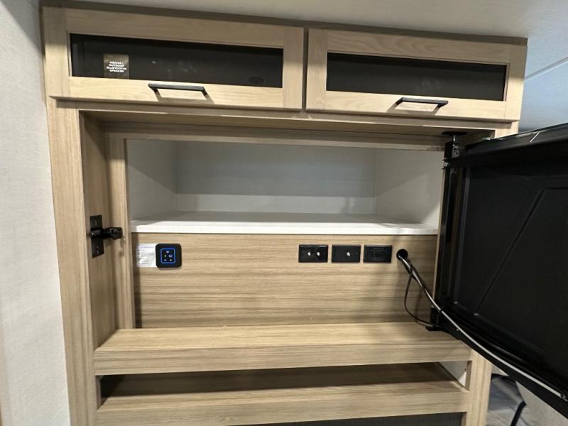 One step inside this rear kitchen travel trailer and you'll be sold! The dual opposing slides create an open floorplan you are sure to love, and you'll find plenty of seating spaces on the theater seat, the hide-a-bed sofa, and the table, chairs & bench. There is an entertainment center here with a Smart TV, plus a fireplace for those cooler nights. The full bath includes a shower with a seat, and the front private bedroom includes a queen bed slide out for more floor space. You can easily store your items in the large front wardrobe, plus there is a dresser and additional storage with washer and dryer prep. And check out the exterior with two power awnings, an outside kitchen, plus exterior storage for all your gear!