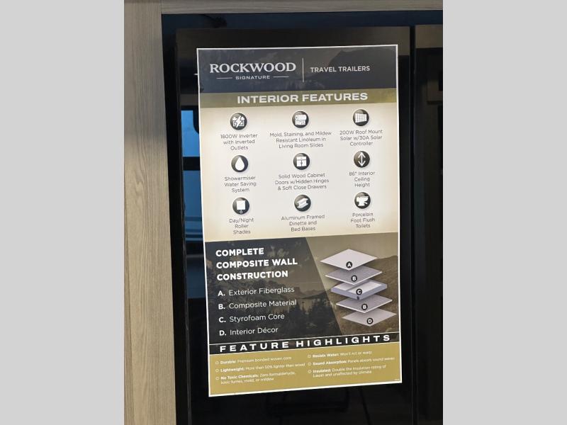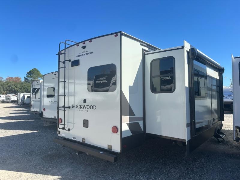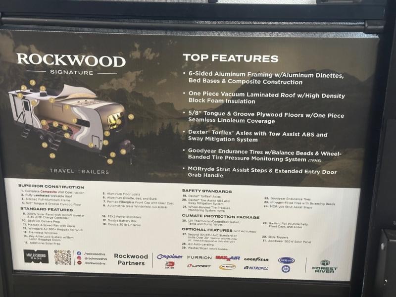 With any Rockwood Signature fifth wheel or travel trailer by Forest River RV, you will enjoy superior construction that includes a fully laminated walkable roof, 6-sided full-aluminum frame, and a painted fiberglass front cap with Clear Coat for added durability. Outside, you'll find a 200W solar panel for off-grid capabilities, slam baggage doors, and Key-Alike lock system for added convenience. Head inside to find soft close roller bearing drawers, roller shades, and residential style gas range. These travel trailer and fifth wheels also feature Goodyear Endurance tires with a tire pressure monitoring system plus Dexter Torflex torsion axles for smooth towing!
