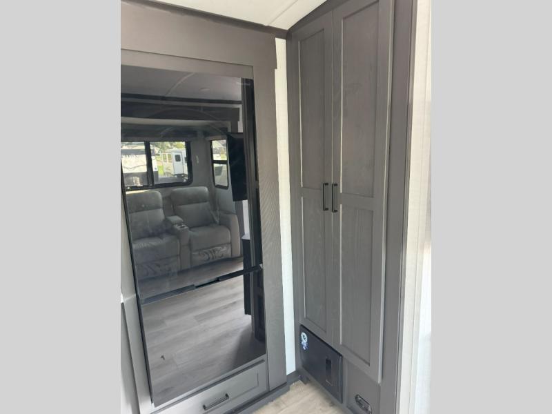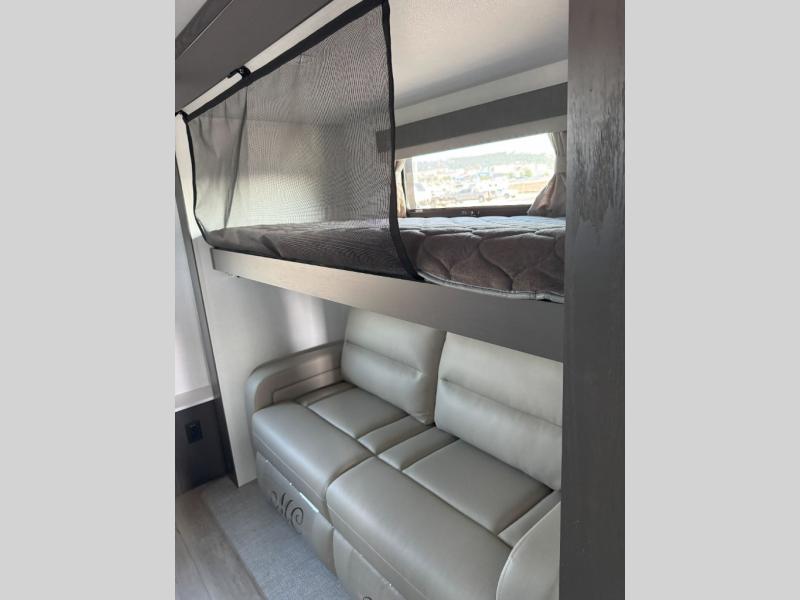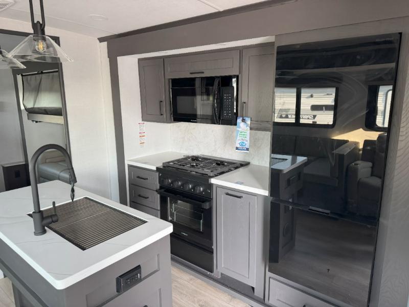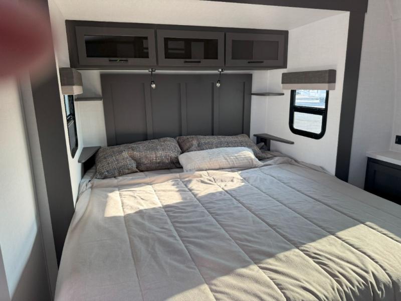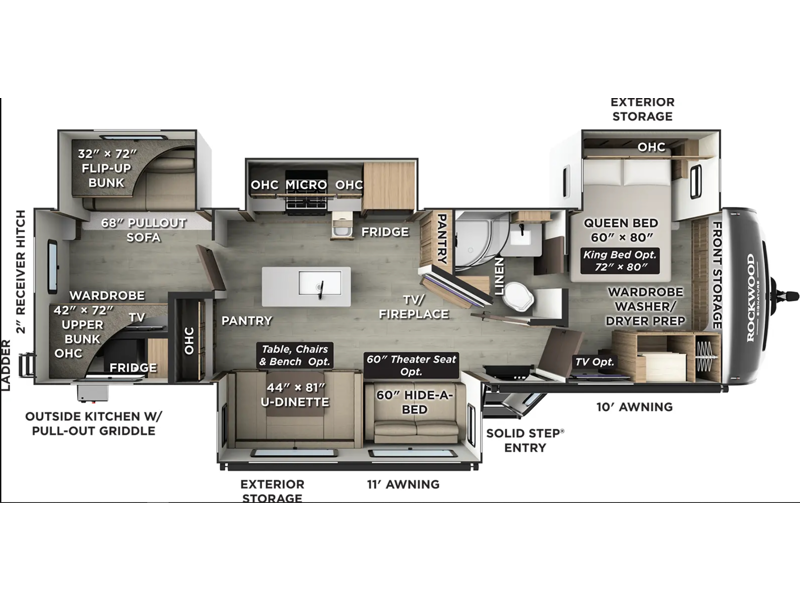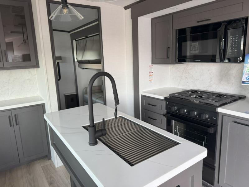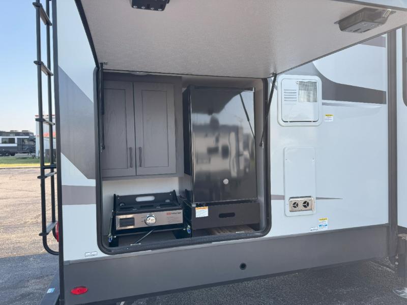 Family vacations and weekend excursions with friends just got sweeter with this travel trailer in tow. The rear private bunkhouse includes a slide out for more space, two bunks, a pull-out sofa, and a wardrobe for clothes. Head to the main living area to relax on the hide-a-bed sofa by the fireplace, or prepare lunch at the kitchen island. If the weather is nice, you may just want to go outdoors to cook on the outside kitchen. There are two power awnings here, and Solid Step entry steps for a sturdy entrance into the trailer. When it's time to call it a night, head to the front master bedroom to enjoy your queen bed slide out, large wardrobe, plus a large front counter with cabinets for more storage. There is even a second wardrobe with washer and dryer prep if you choose to add those appliances!
