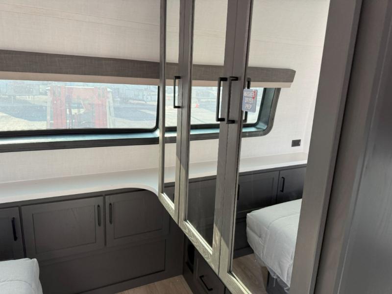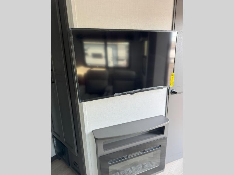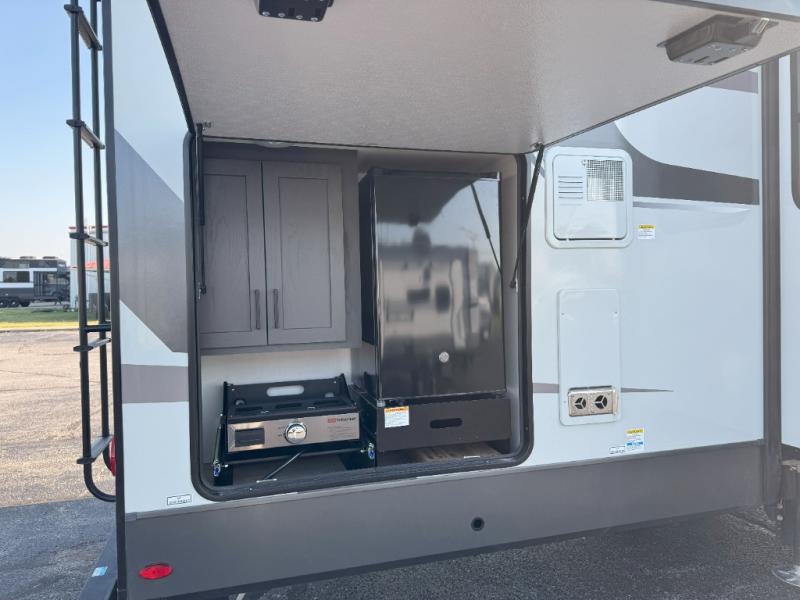 Family vacations and weekend excursions with friends just got sweeter with this travel trailer in tow. The rear private bunkhouse includes a slide out for more space, two bunks, a pull-out sofa, and a wardrobe for clothes. Head to the main living area to relax on the hide-a-bed sofa by the fireplace, or prepare lunch at the kitchen island. If the weather is nice, you may just want to go outdoors to cook on the outside kitchen. There are two power awnings here, and Solid Step entry steps for a sturdy entrance into the trailer. When it's time to call it a night, head to the front master bedroom to enjoy your queen bed slide out, large wardrobe, plus a large front counter with cabinets for more storage. There is even a second wardrobe with washer and dryer prep if you choose to add those appliances!