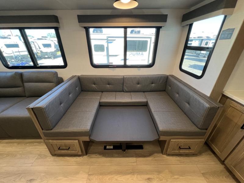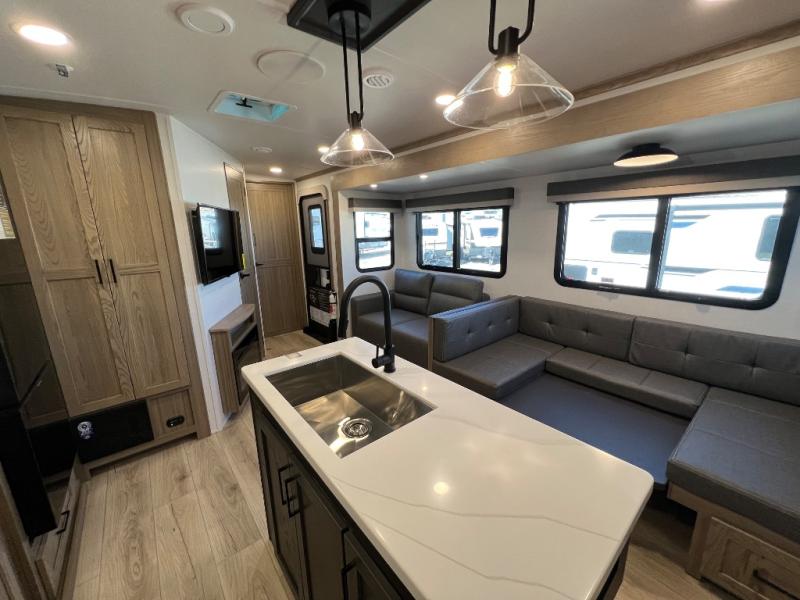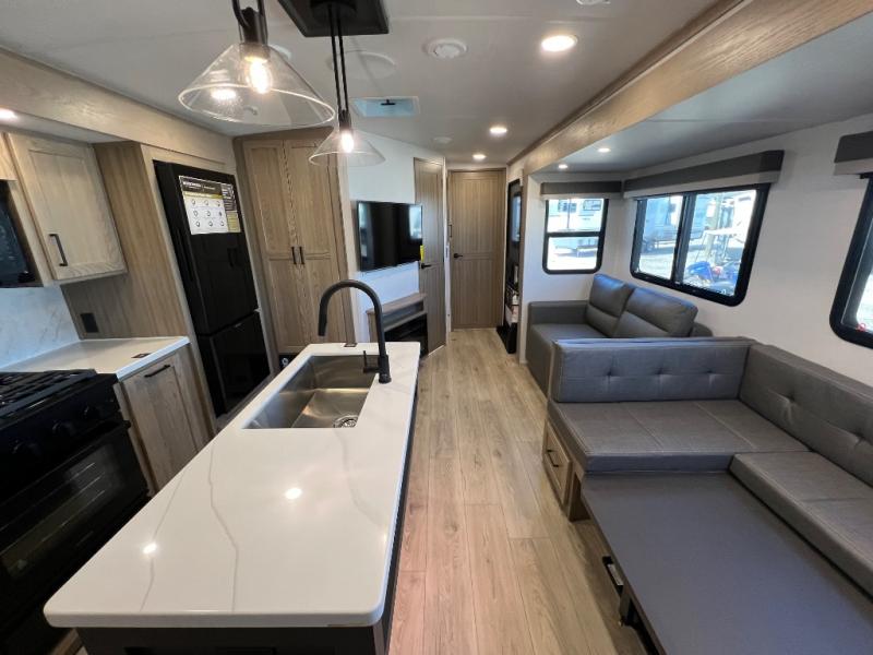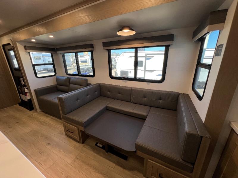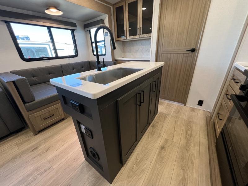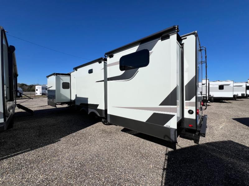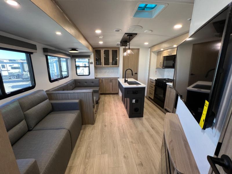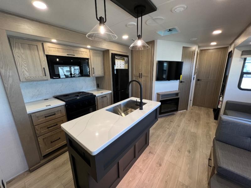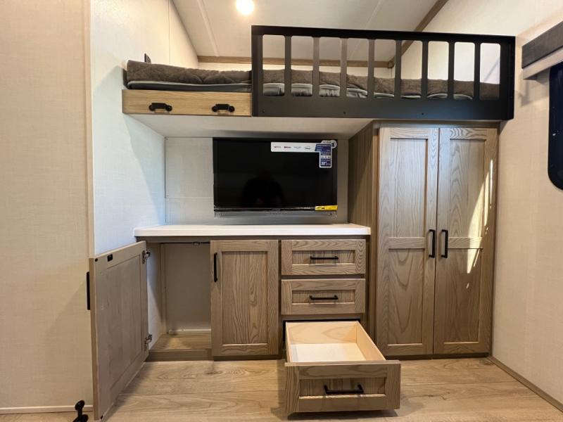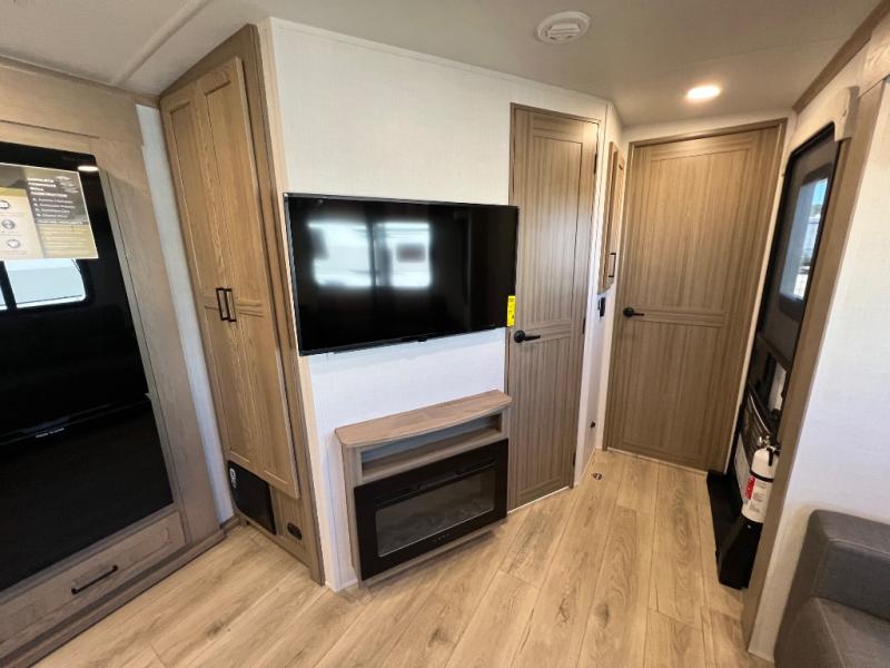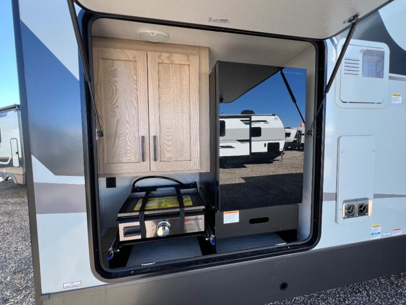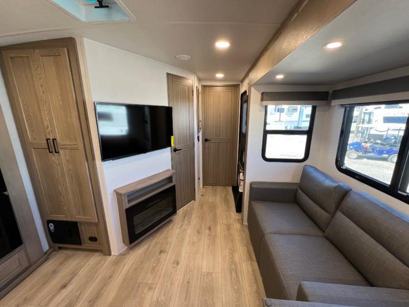Family vacations and weekend excursions with friends just got sweeter with this travel trailer in tow. The rear private bunkhouse includes a slide out for more space, two bunks, a pull-out sofa, and a wardrobe for clothes. Head to the main living area to relax on the hide-a-bed sofa by the fireplace, or prepare lunch at the kitchen island. If the weather is nice, you may just want to go outdoors to cook on the outside kitchen. There are two power awnings here, and Solid Step entry steps for a sturdy entrance into the trailer. When it's time to call it a night, head to the front master bedroom to enjoy your queen bed slide out, large wardrobe, plus a large front counter with cabinets for more storage. There is even washer and dryer prep if you choose to add those appliances!