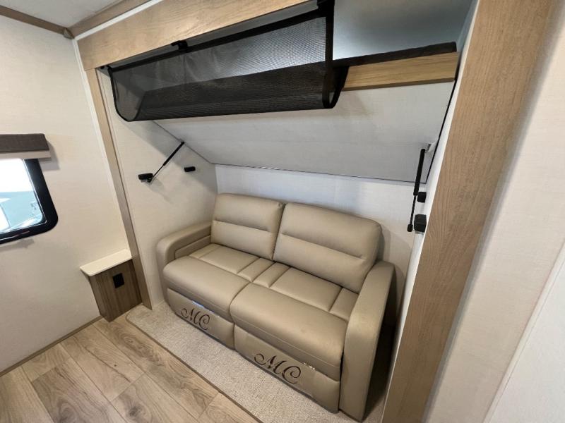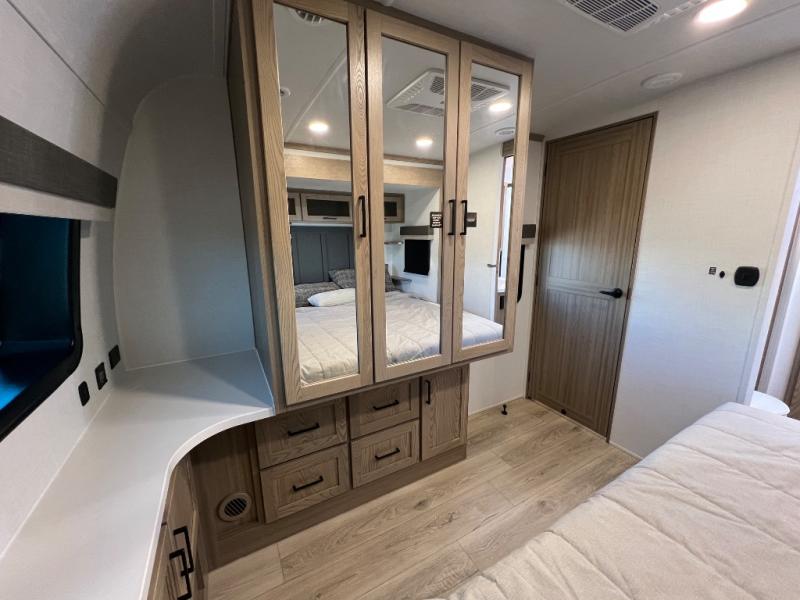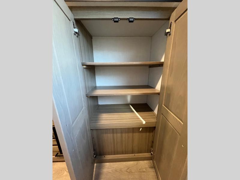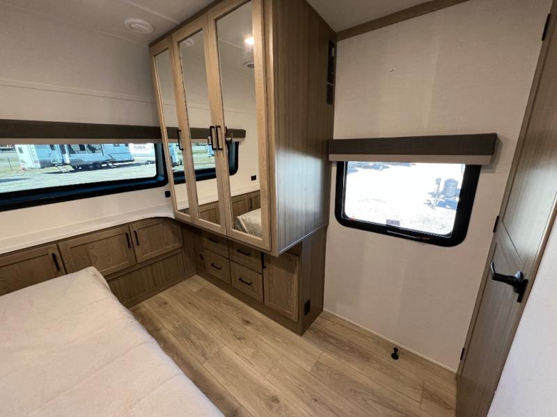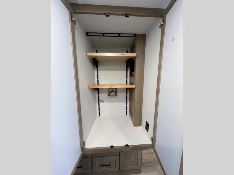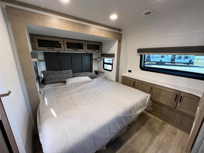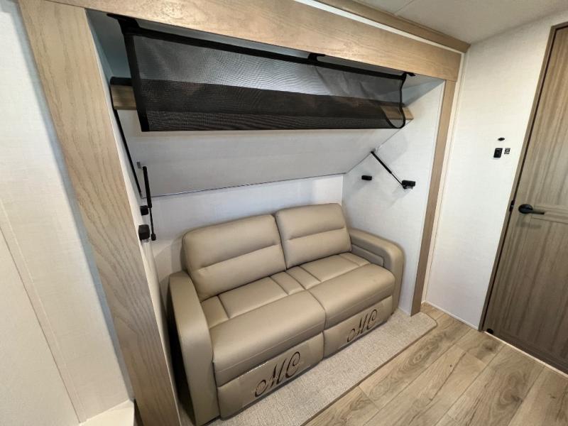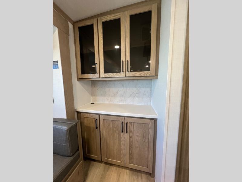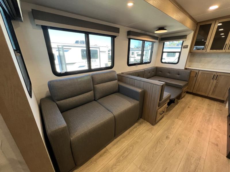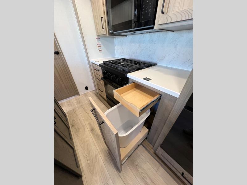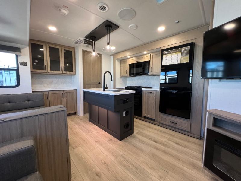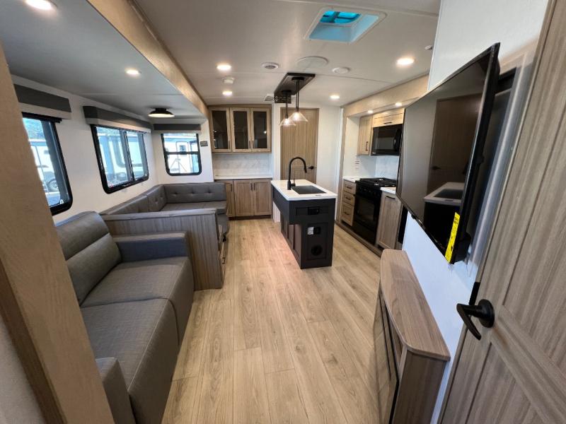 Family vacations and weekend excursions with friends just got sweeter with this travel trailer in tow. The rear private bunkhouse includes a slide out for more space, two bunks, a pull-out sofa, and a wardrobe for clothes. Head to the main living area to relax on the hide-a-bed sofa by the fireplace, or prepare lunch at the kitchen island. If the weather is nice, you may just want to go outdoors to cook on the outside kitchen. There are two power awnings here, and Solid Step entry steps for a sturdy entrance into the trailer. When it's time to call it a night, head to the front master bedroom to enjoy your queen bed slide out, large wardrobe, plus a large front counter with cabinets for more storage. There is even washer and dryer prep if you choose to add those appliances!