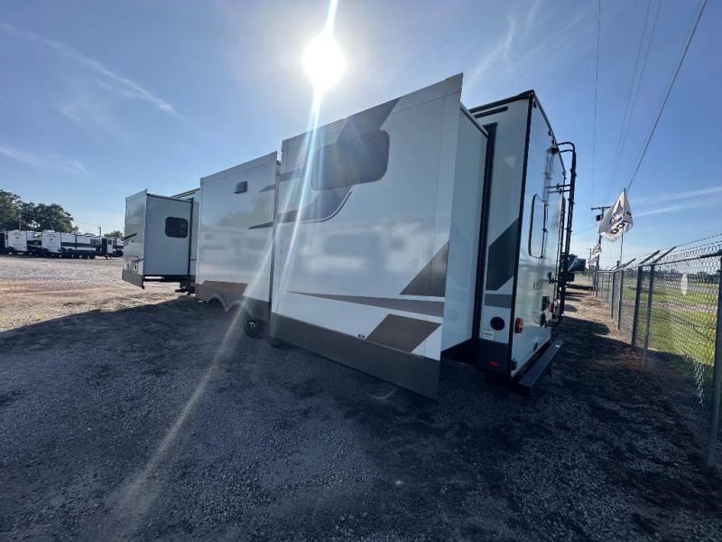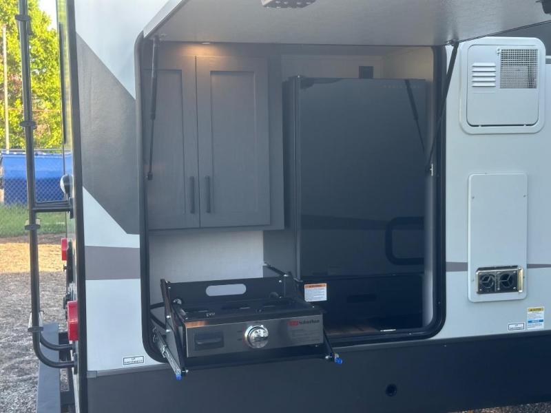 Family vacations and weekend excursions with friends just got sweeter with this travel trailer in tow. The rear private bunkhouse includes a slide out for more space, two bunks, a pull-out sofa, and a wardrobe for clothes. Head to the main living area to relax on the hide-a-bed sofa by the fireplace, or prepare lunch at the kitchen island. If the weather is nice, you may just want to go outdoors to cook on the outside kitchen. There are two power awnings here, and Solid Step entry steps for a sturdy entrance into the trailer. When it's time to call it a night, head to the front master bedroom to enjoy your queen bed slide out, large wardrobe, plus a large front counter with cabinets for more storage. There is even washer and dryer prep if you choose to add those appliances!