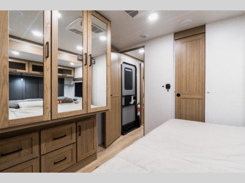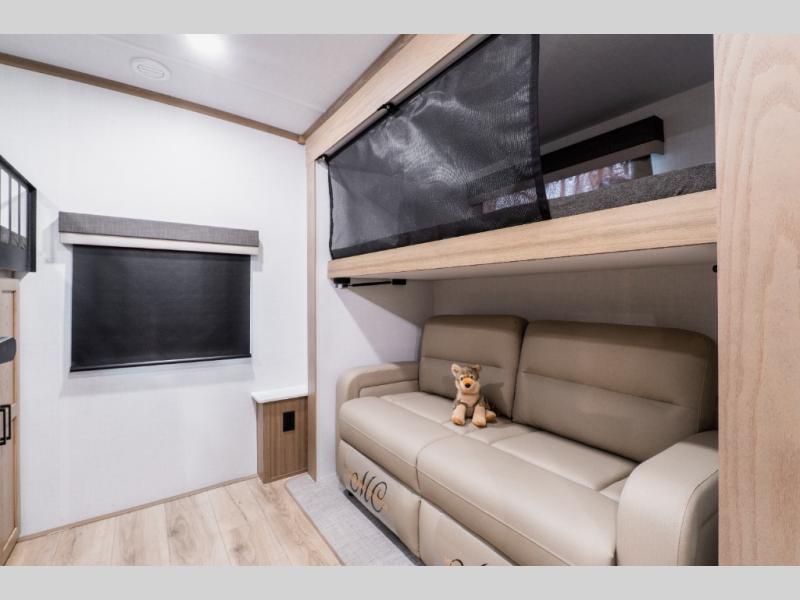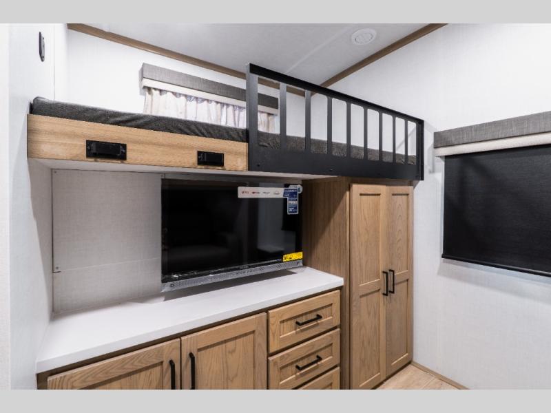 The rear private bunkhouse creates a space that works well for kids or guests, featuring two bunks, a pull-out sofa, a slide-out for extra room, and a wardrobe for clothing and gear. It’s a setup that keeps sleeping and living spaces comfortably separated.