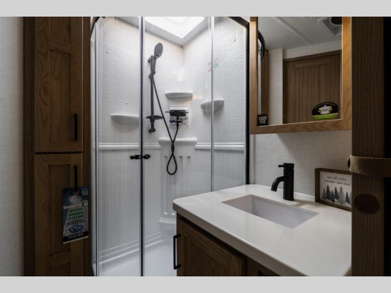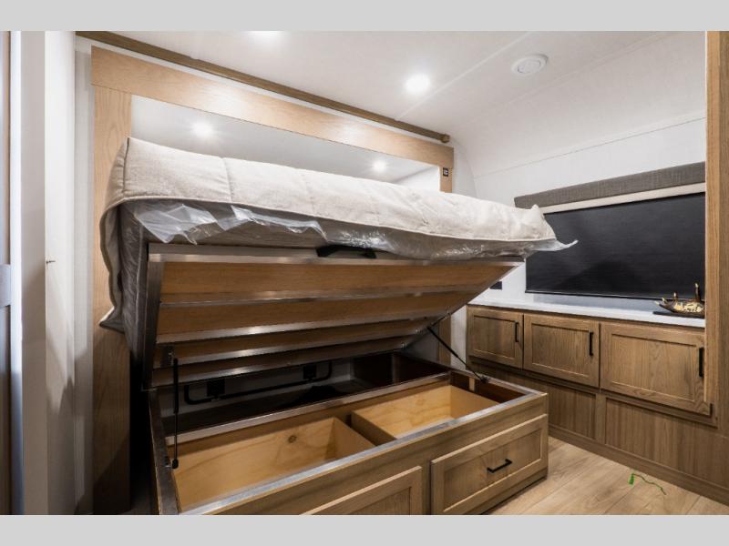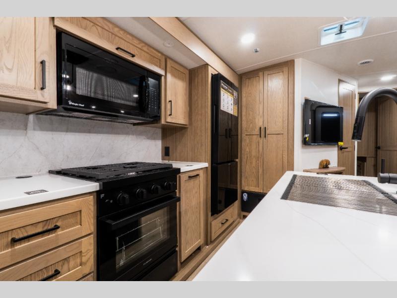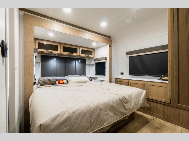 Up front, the master bedroom features a queen bed slide-out, a large wardrobe, and an extended front counter with cabinets for added storage. Washer and dryer prep is also included for those planning longer trips.