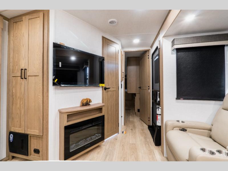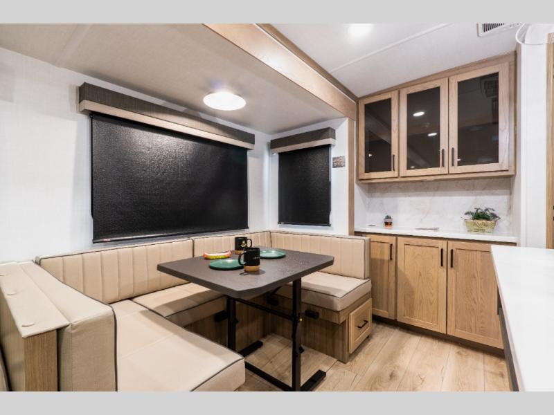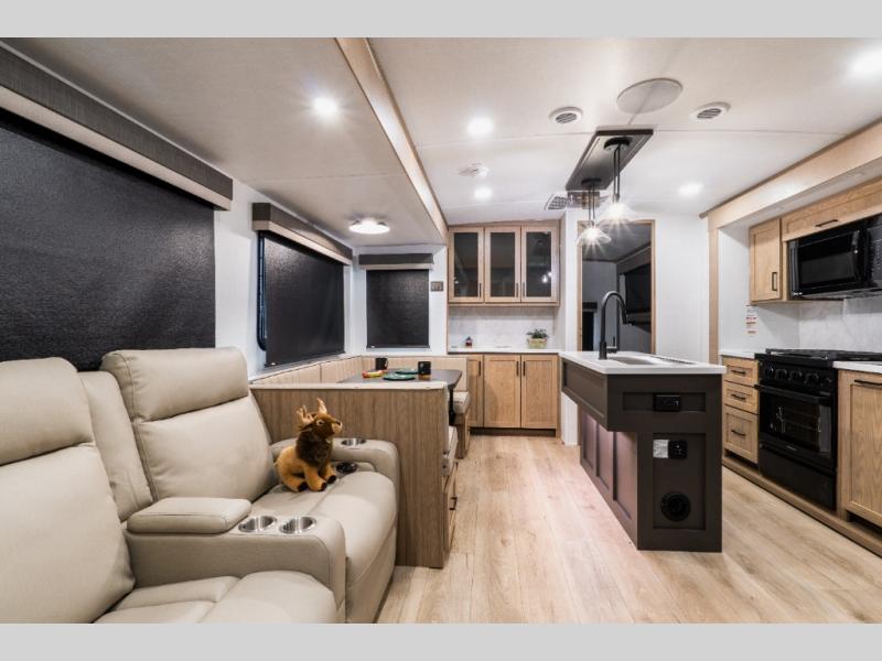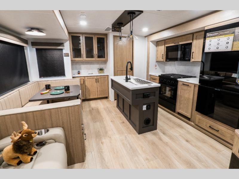 In the main living area, the hide-a-bed sofa sits across from the fireplace, making it an inviting place to unwind at the end of the day. The kitchen island adds counter space for meal prep, while the U-shaped dinette provides a roomy spot for meals, games, or planning the next day’s adventure.