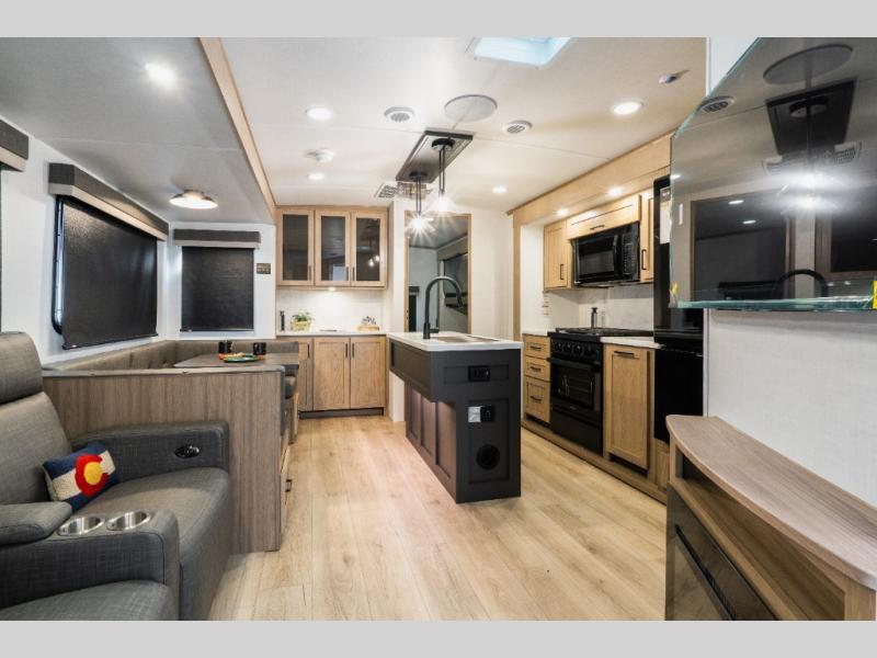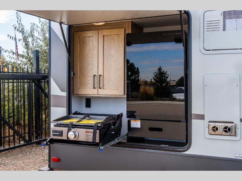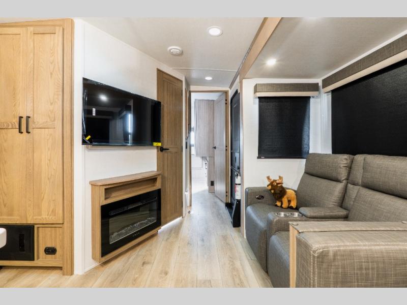 Family vacations and weekend excursions with friends just got sweeter with this travel trailer in tow. The rear private bunkhouse includes a slide out for more space, two bunks, a pull-out sofa, and a wardrobe for clothes. Head to the main living area to relax on the hide-a-bed sofa by the fireplace, or prepare lunch at the kitchen island. If the weather is nice, you may just want to go outdoors to cook on the outside kitchen. There are two power awnings here, and Solid Step entry steps for a sturdy entrance into the trailer. When it's time to call it a night, head to the front master bedroom to enjoy your queen bed slide out, large wardrobe, plus a large front counter with cabinets for more storage. There is even washer and dryer prep if you choose to add those appliances!