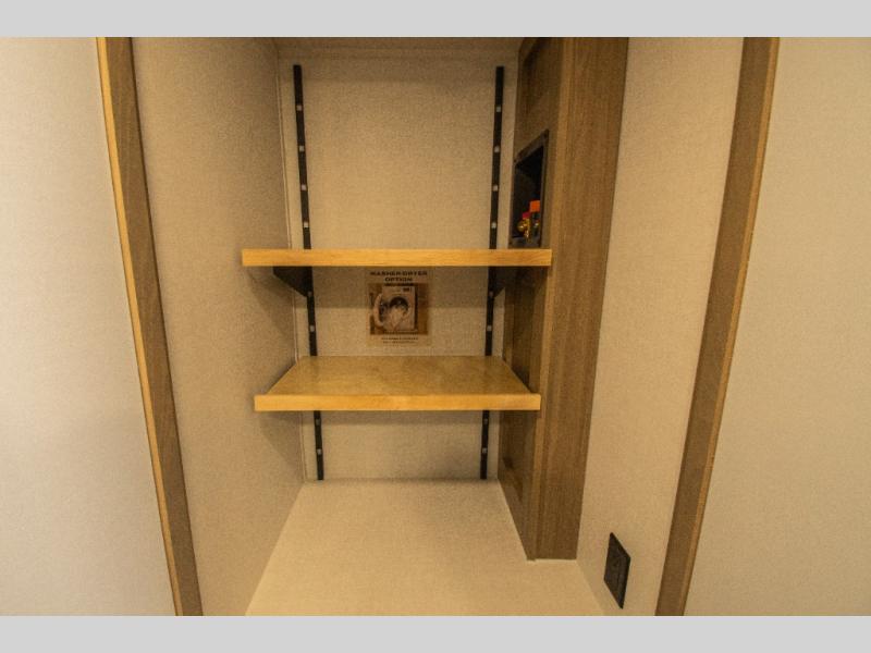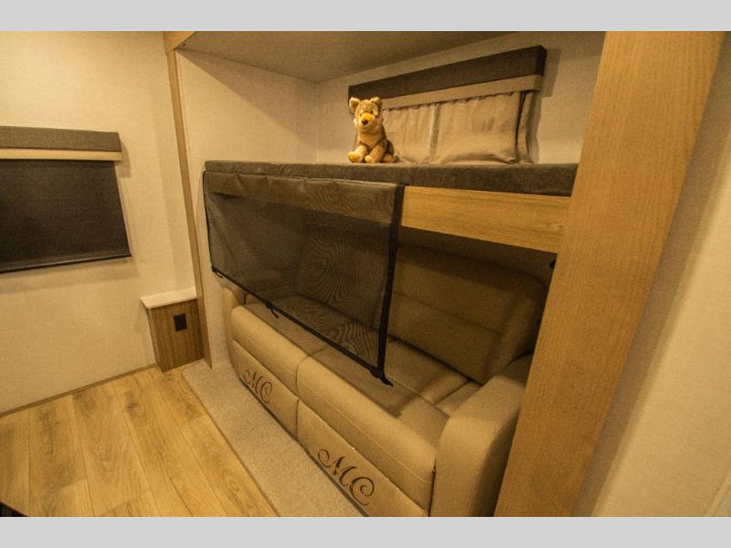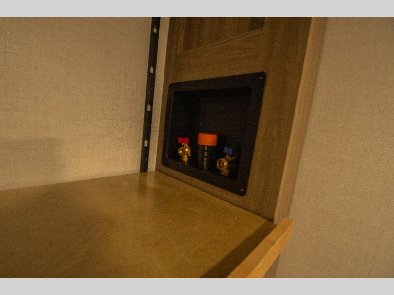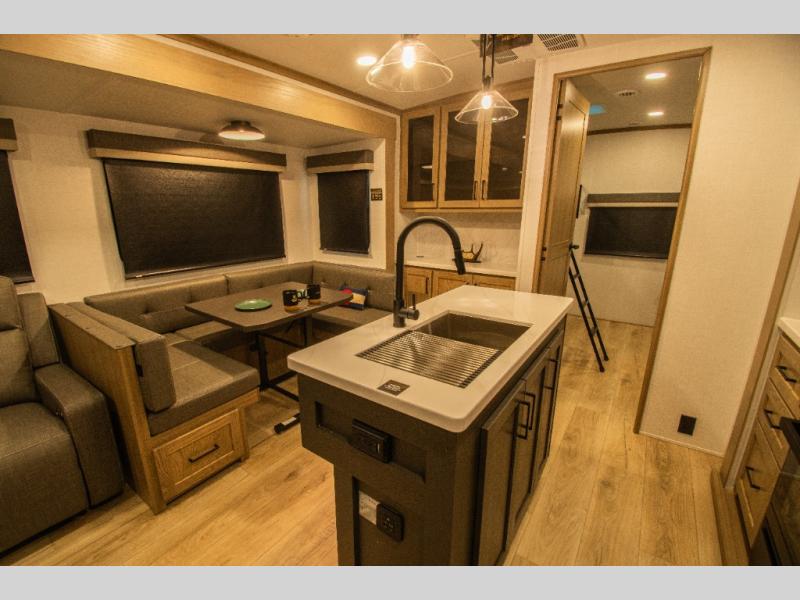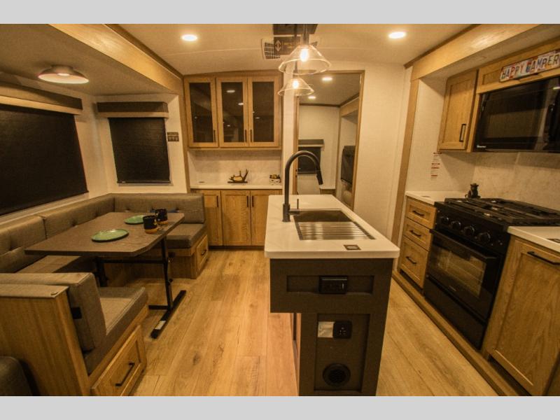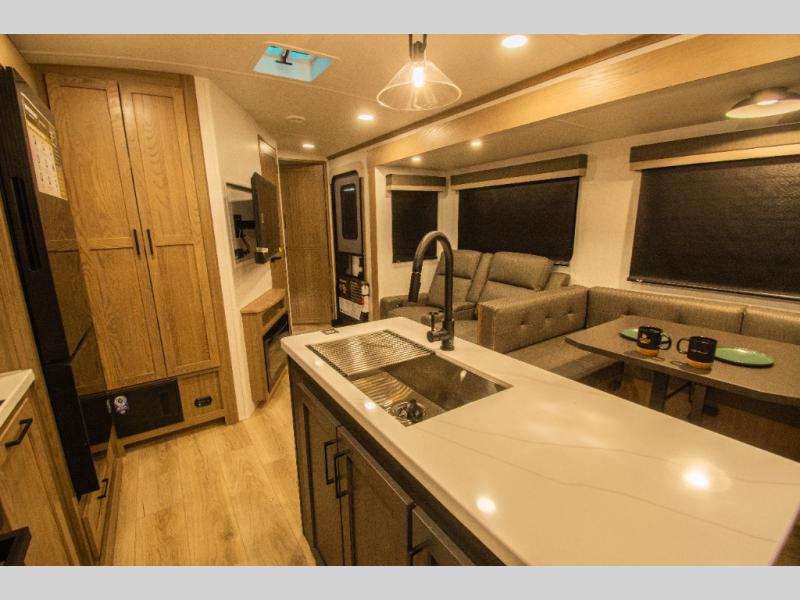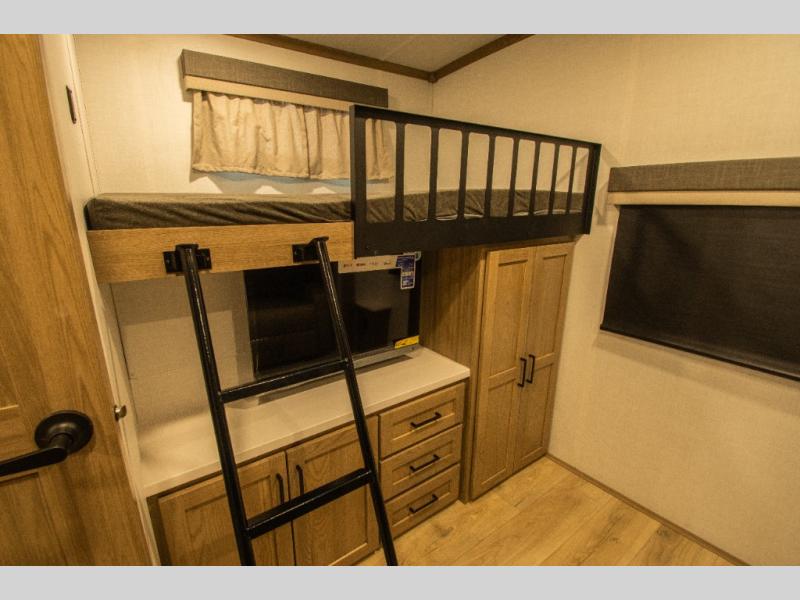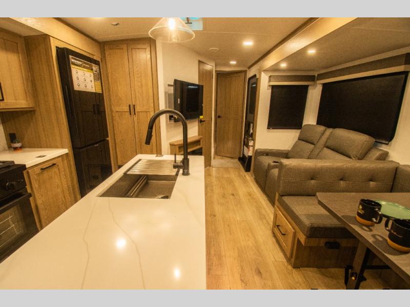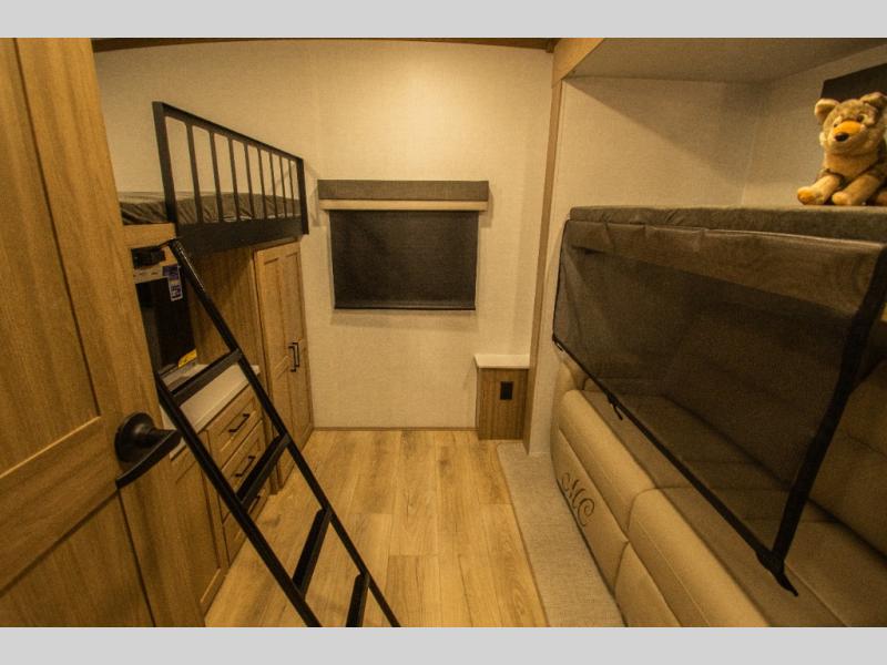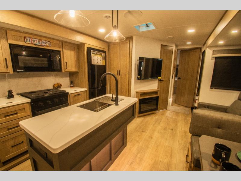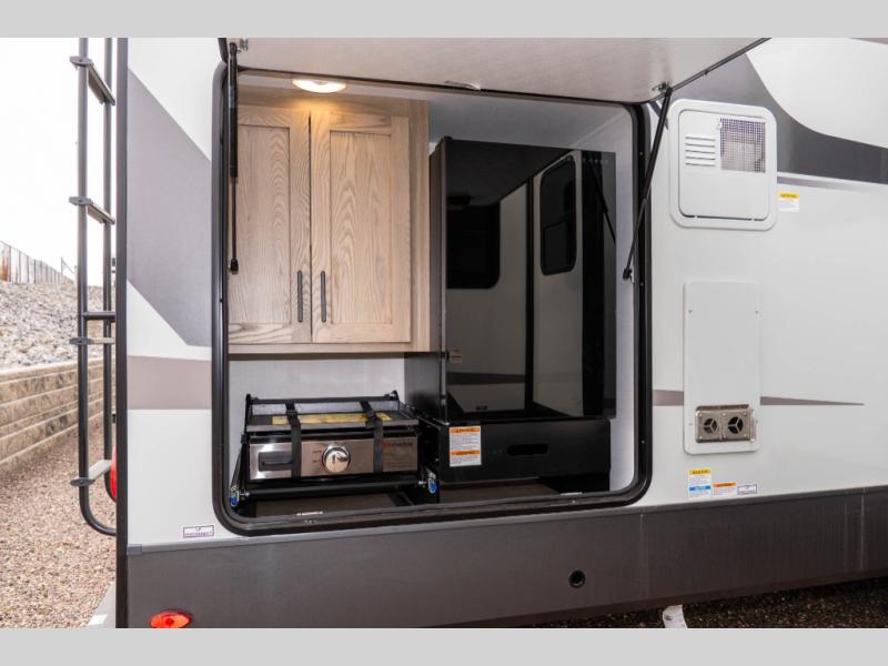 Family vacations and weekend excursions with friends just got sweeter with this travel trailer in tow. The rear private bunkhouse includes a slide out for more space, two bunks, a pull-out sofa, and a wardrobe for clothes. Head to the main living area to relax on the hide-a-bed sofa by the fireplace, or prepare lunch at the kitchen island. If the weather is nice, you may just want to go outdoors to cook on the outside kitchen. There are two power awnings here, and Solid Step entry steps for a sturdy entrance into the trailer. When it's time to call it a night, head to the front master bedroom to enjoy your queen bed slide out, large wardrobe, plus a large front counter with cabinets for more storage. There is even washer and dryer prep if you choose to add those appliances!