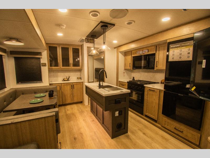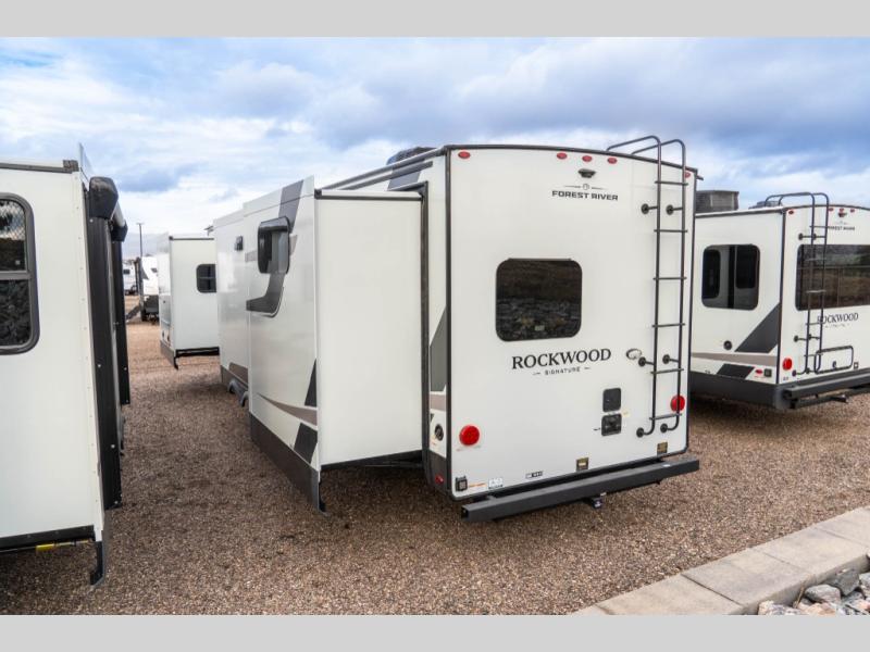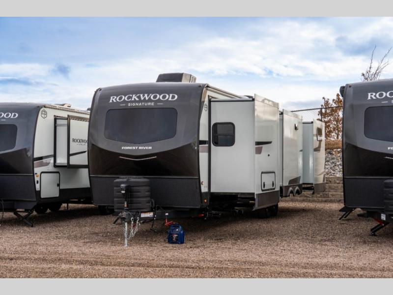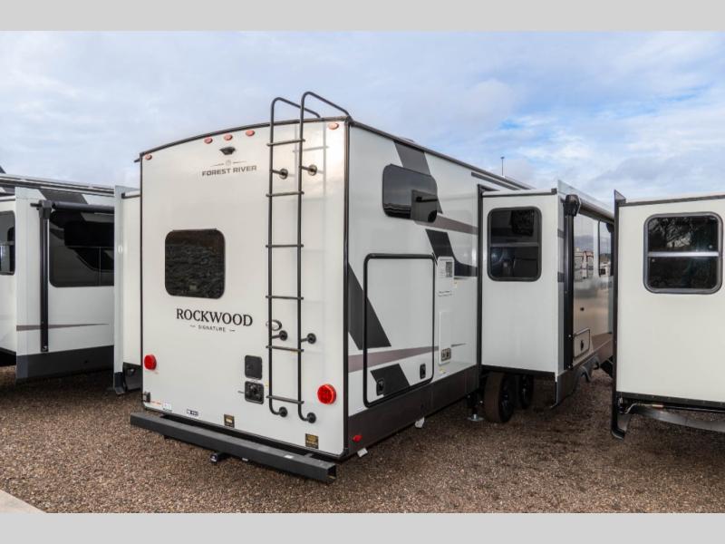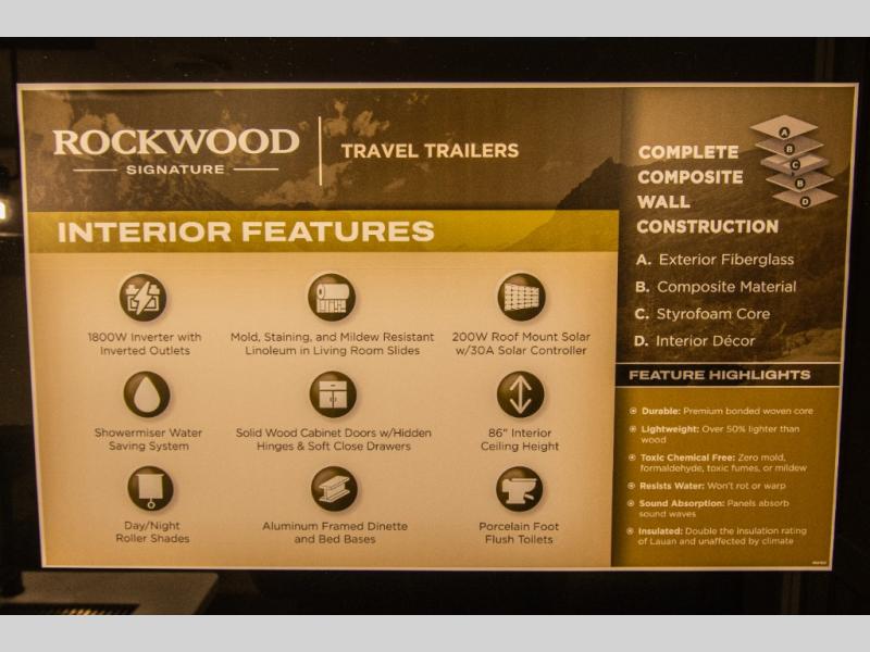 With any Rockwood Signature fifth wheel or travel trailer by Forest River RV, you will enjoy superior construction that includes a fully laminated walkable roof, 6-sided full-aluminum frame, and a painted fiberglass front cap with Clear Coat for added durability. Outside, you'll find a 200W solar panel for off-grid capabilities, slam baggage doors, and Key-Alike lock system for added convenience. Head inside to find soft close roller bearing drawers, roller shades, and residential style gas range. These travel trailer and fifth wheels also feature Goodyear Endurance tires with a tire pressure monitoring system plus Dexter Torflex torsion axles for smooth towing!