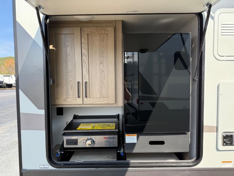 Family vacations and weekend excursions with friends just got sweeter with this travel trailer in tow. The rear private bunkhouse includes a slide out for more space, two bunks, a pull-out sofa, and a wardrobe for clothes. Head to the main living area to relax on the hide-a-bed sofa by the fireplace, or prepare lunch at the kitchen island. If the weather is nice, you may just want to go outdoors to cook on the outside kitchen. There are two power awnings here, and Solid Step entry steps for a sturdy entrance into the trailer. When it's time to call it a night, head to the front master bedroom to enjoy your queen bed slide out, large wardrobe, plus a large front counter with cabinets for more storage. There is even washer and dryer prep if you choose to add those appliances!