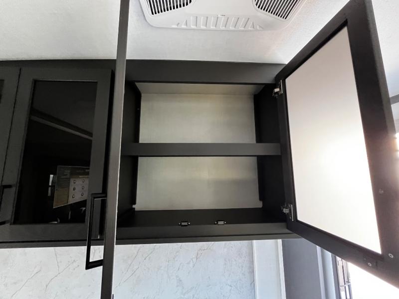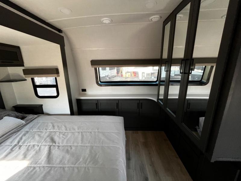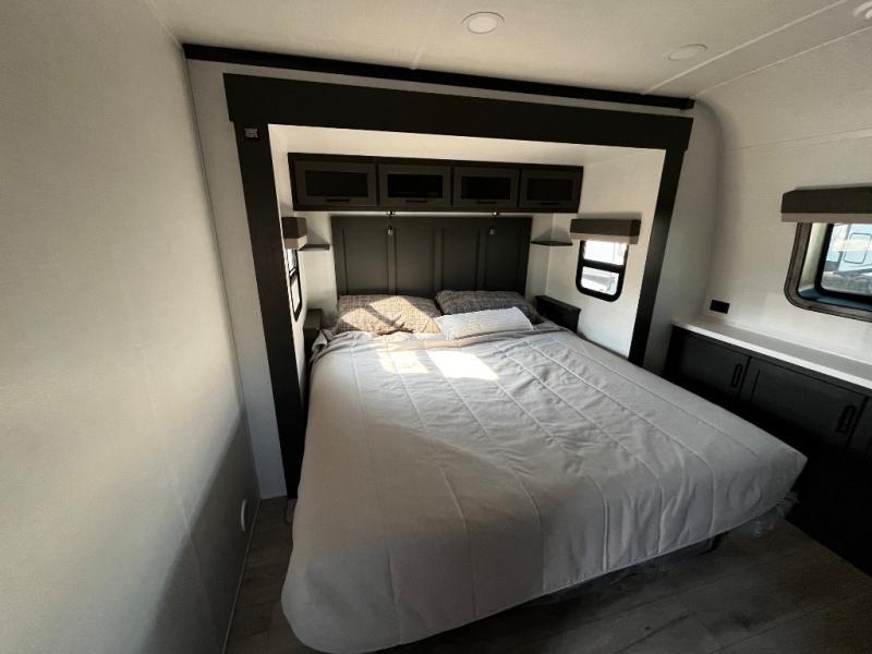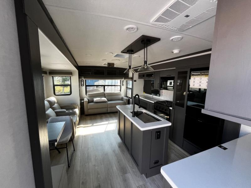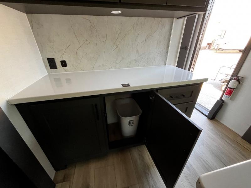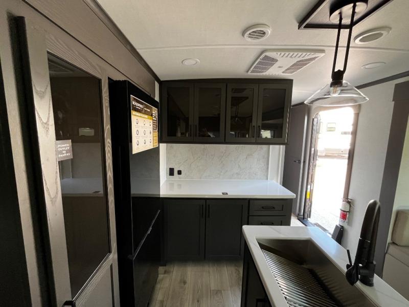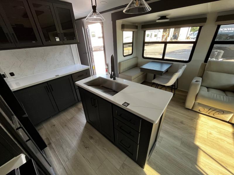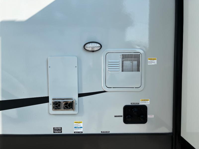 You're going to love the amount of natural light in this model with large windows in the back and the door side. The chef of the group will love the kitchen island, and there is tons of storage space for dishes, food, and knickknacks. The entertainment center with a Smart TV will allow you to watch movies at night, or you may just find yourselves outside under the two power awnings with LED lights. There is also an outside griddle prep here to cook pancakes in the morning. The king bed is sure to bring comfort, and you'll appreciate the large wardrobe to keep your clothes tidy. There is even washer and dryer prep if you choose to go full-time!