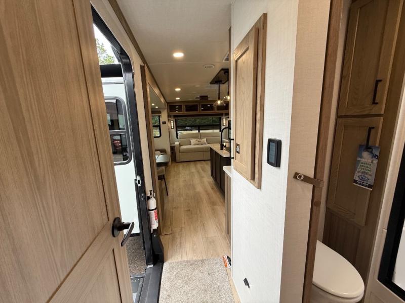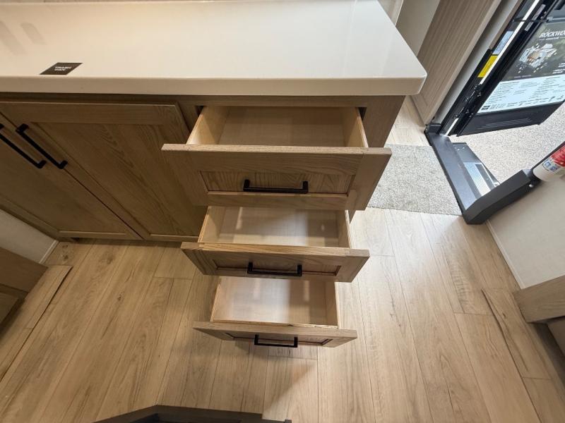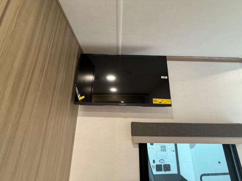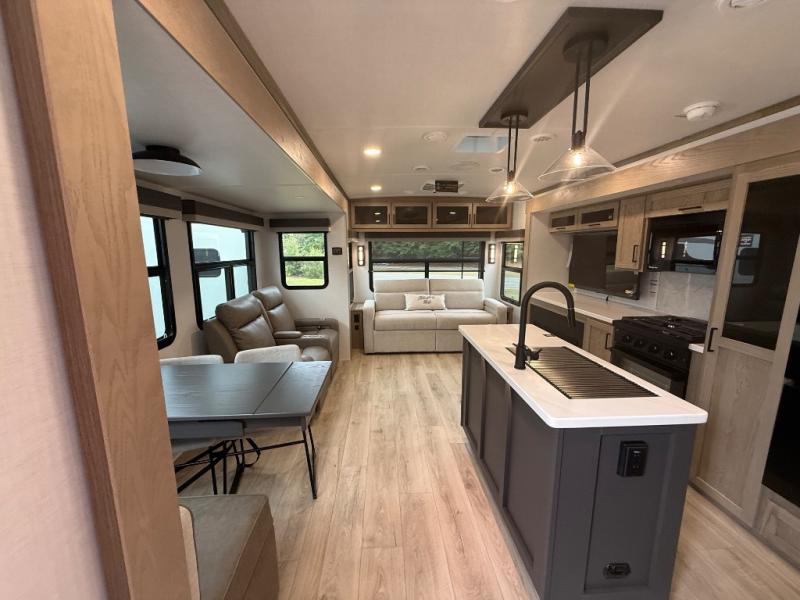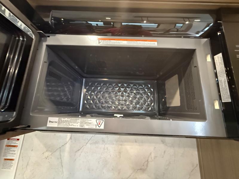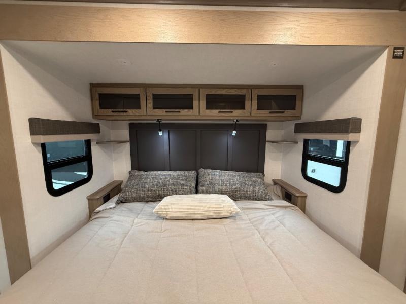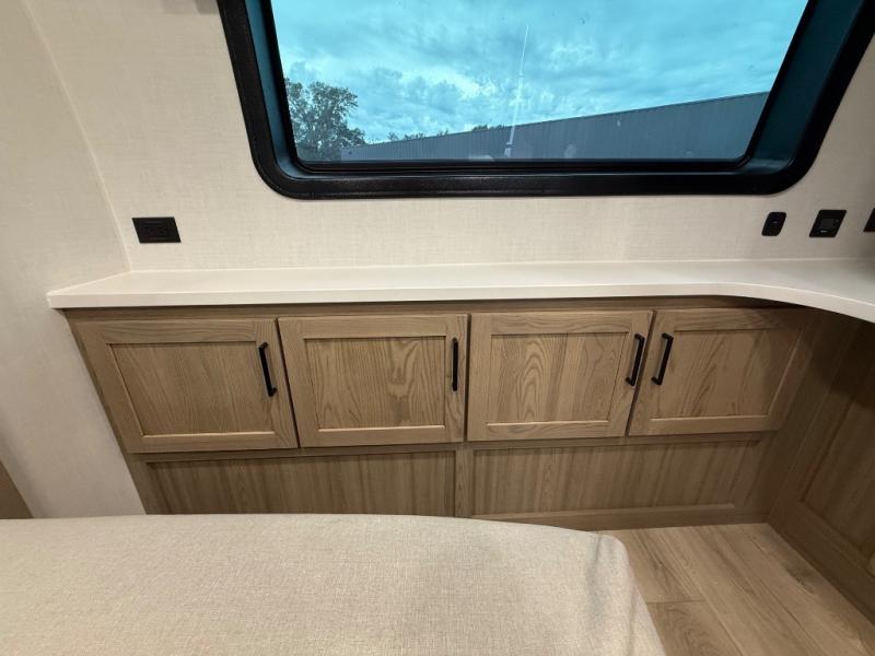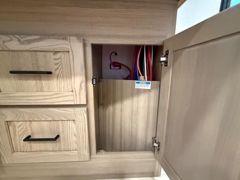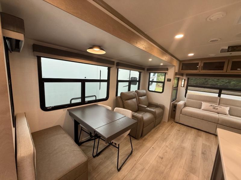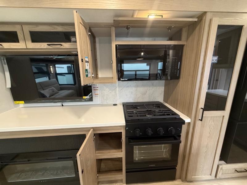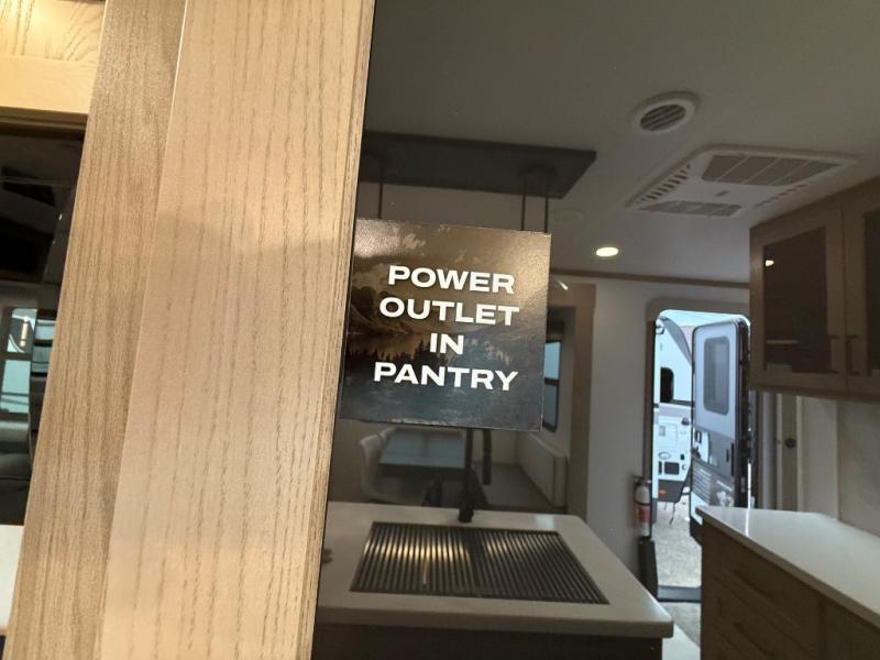 You're going to love the amount of natural light in this model with large windows in the back and the door side. The chef of the group will love the kitchen island, and there is tons of storage space for dishes, food, and knickknacks. The entertainment center with a Smart TV will allow you to watch movies at night, or you may just find yourselves outside under the two power awnings with LED lights. There is also an outside griddle prep here to cook pancakes in the morning. The king bed is sure to bring comfort, and you'll appreciate the large wardrobe to keep your clothes tidy. There is even washer and dryer prep if you choose to go full-time!