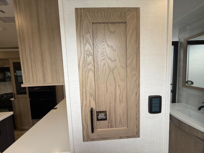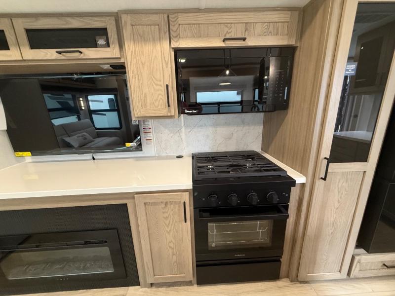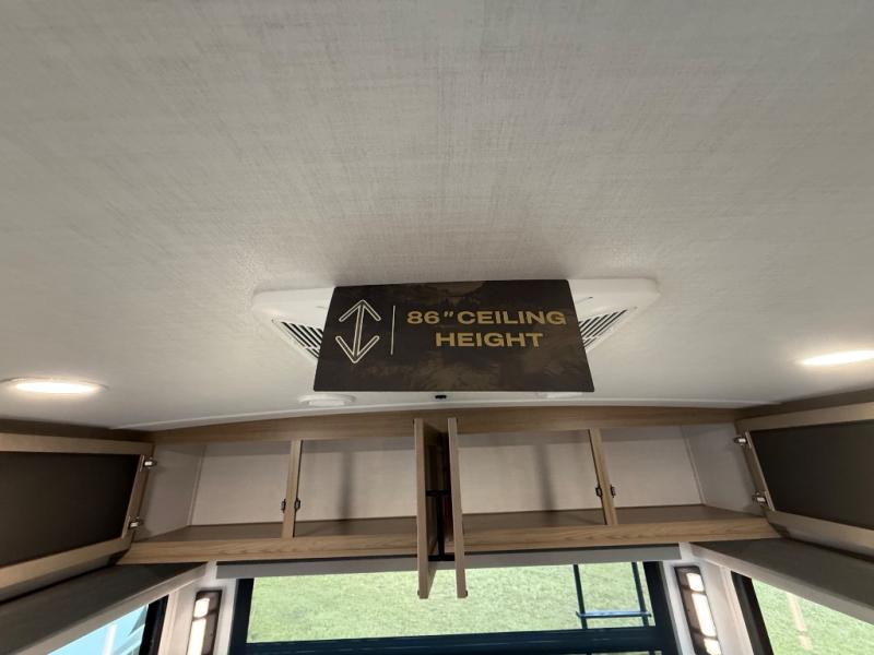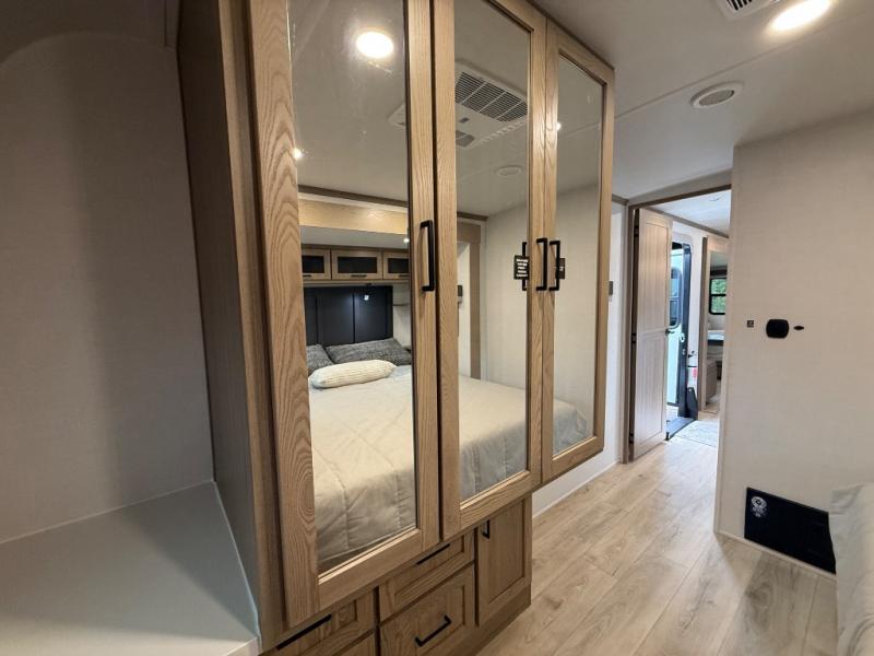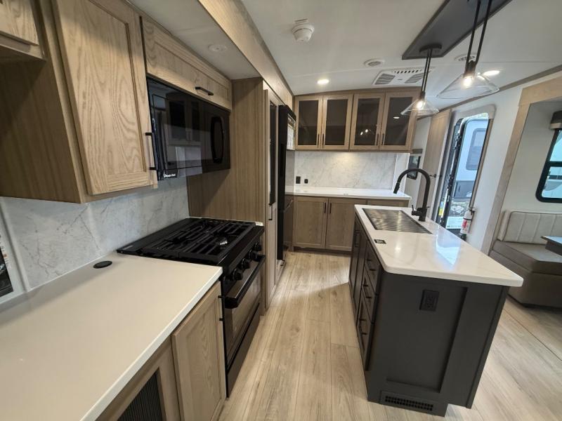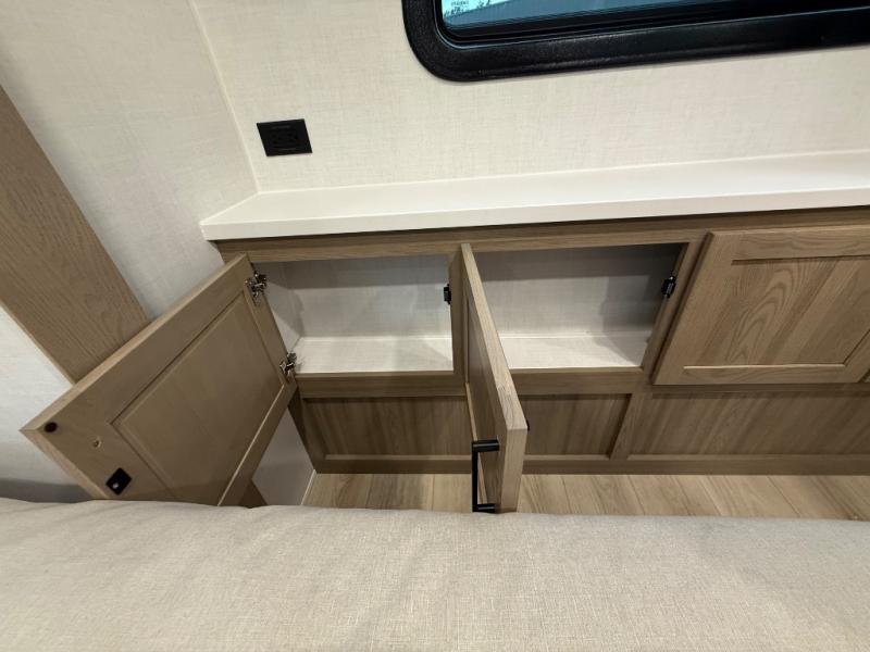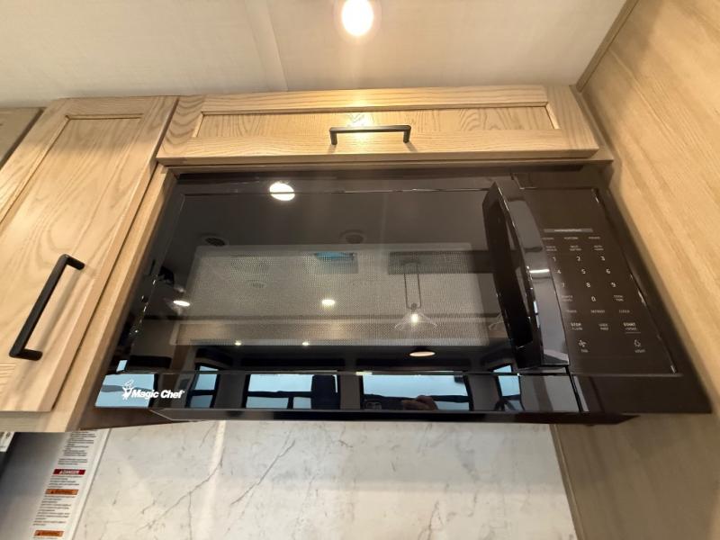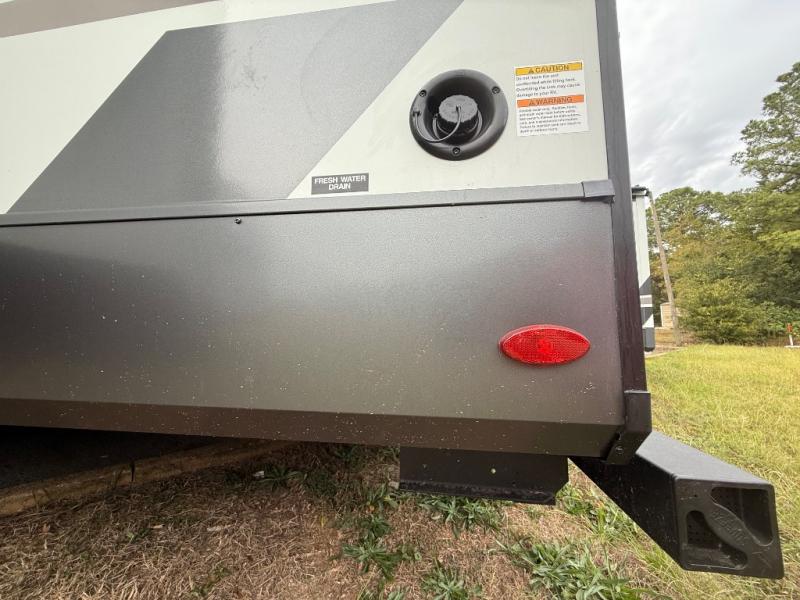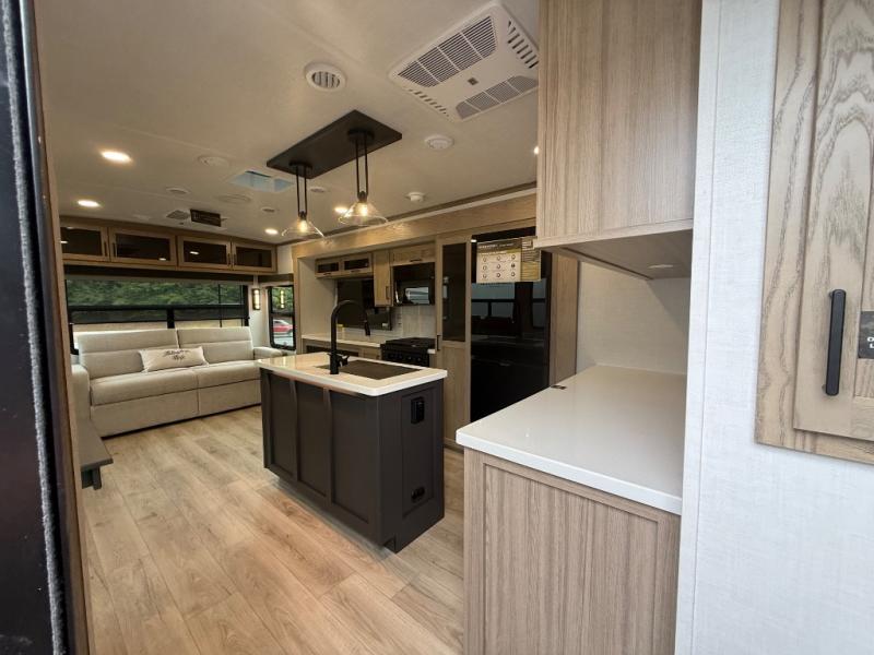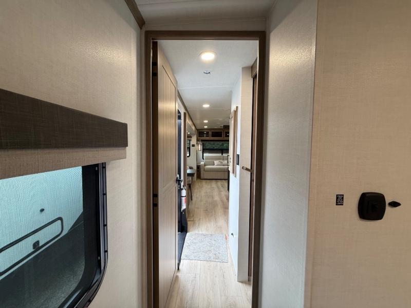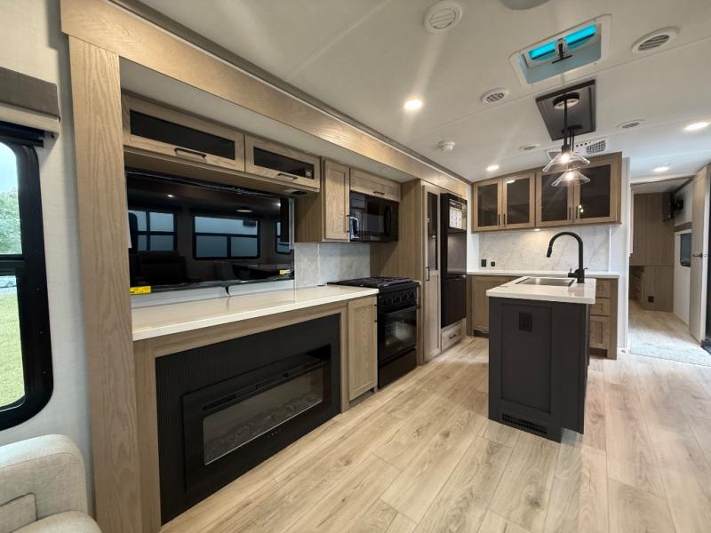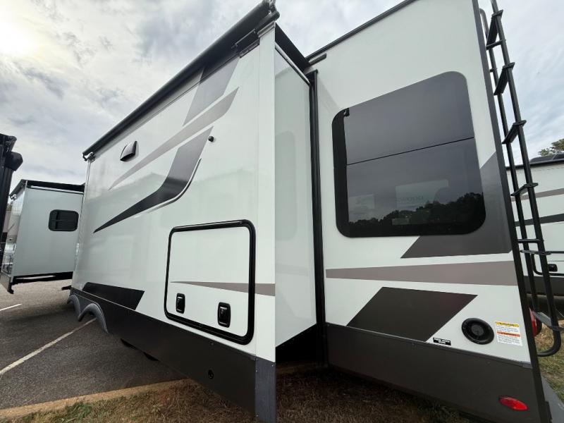 You're going to love the amount of natural light in this model with large windows in the back and the door side. The chef of the group will love the kitchen island, and there is tons of storage space for dishes, food, and knickknacks. The entertainment center with a Smart TV will allow you to watch movies at night, or you may just find yourselves outside under the two power awnings with LED lights. There is also an outside griddle prep here to cook pancakes in the morning. The king bed is sure to bring comfort, and you'll appreciate the large wardrobe to keep your clothes tidy. There is even washer and dryer prep if you choose to go full-time!