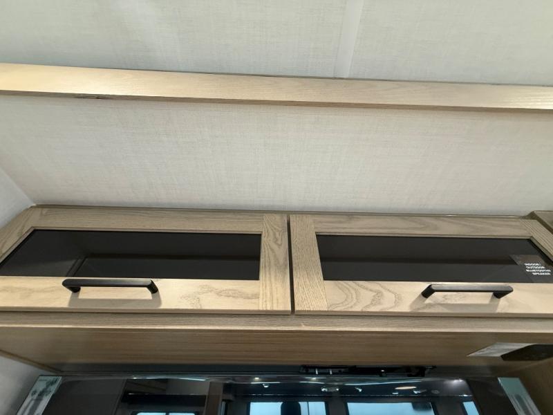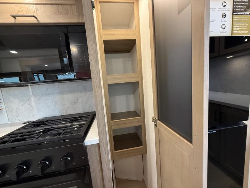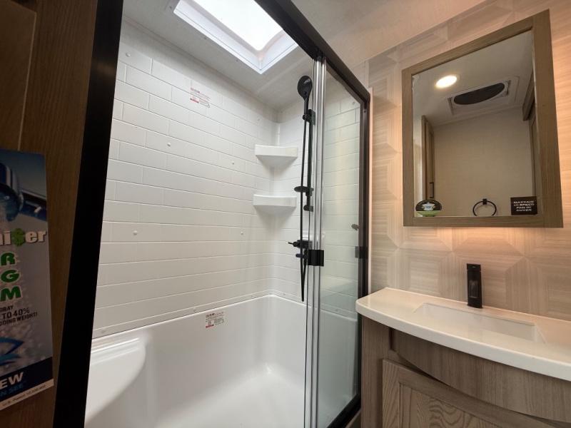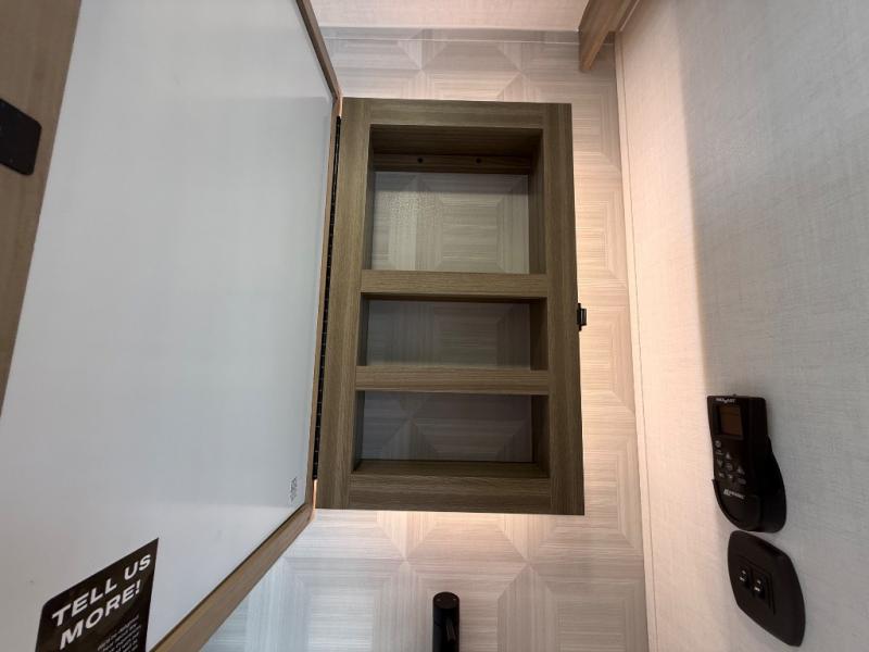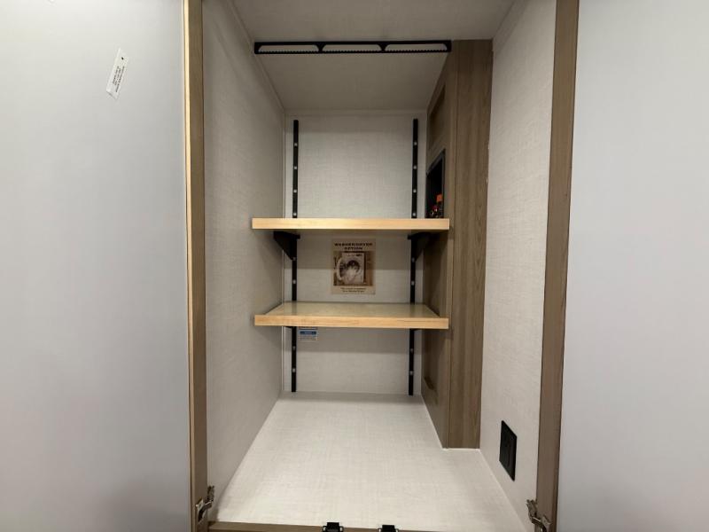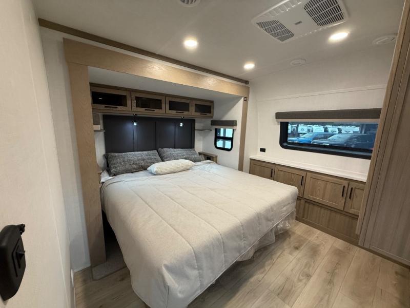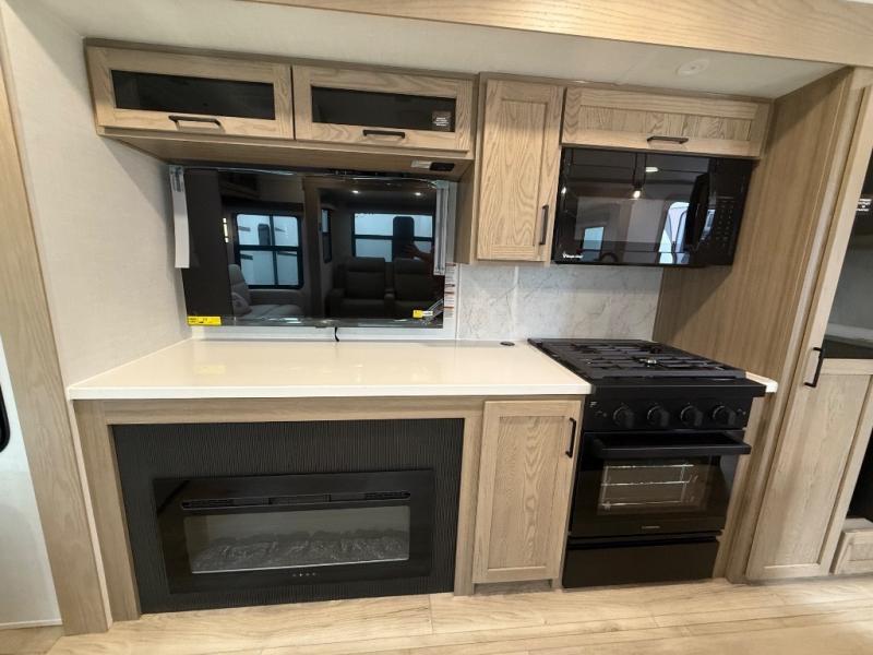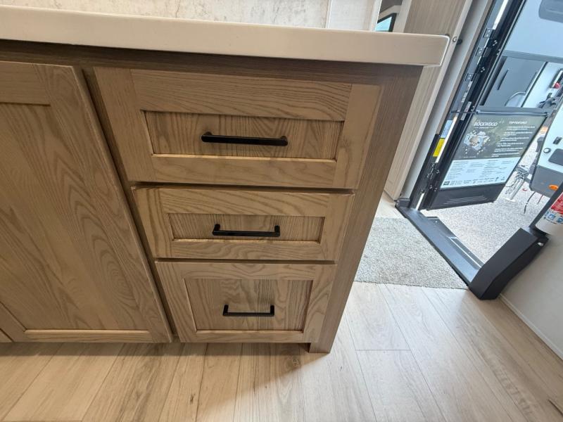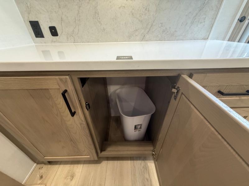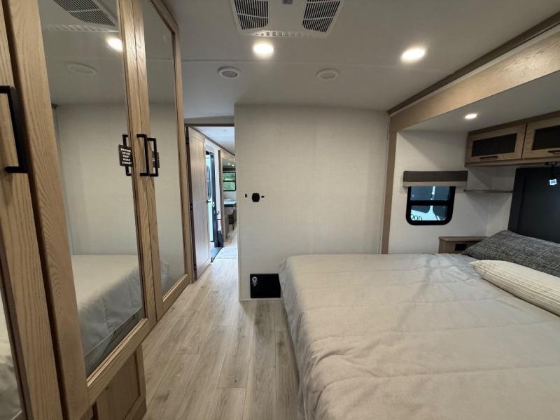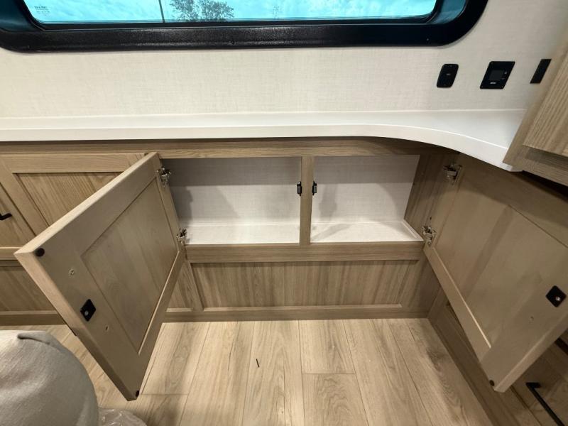 You're going to love the amount of natural light in this model with large windows in the back and the door side. The chef of the group will love the kitchen island, and there is tons of storage space for dishes, food, and knickknacks. The entertainment center with a Smart TV will allow you to watch movies at night, or you may just find yourselves outside under the two power awnings with LED lights. There is also an outside griddle prep here to cook pancakes in the morning. The king bed is sure to bring comfort, and you'll appreciate the large wardrobe to keep your clothes tidy. There is even washer and dryer prep if you choose to go full-time!