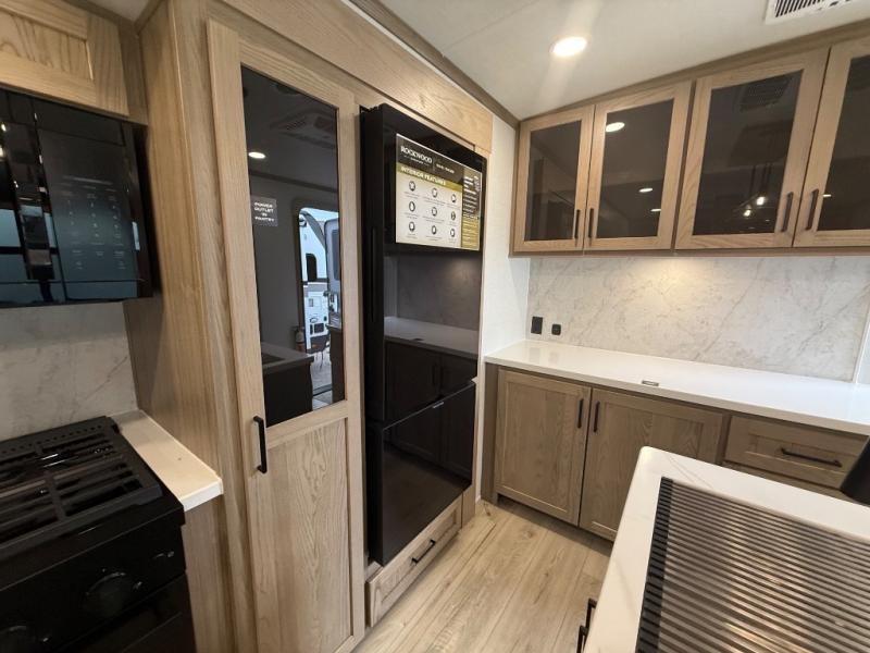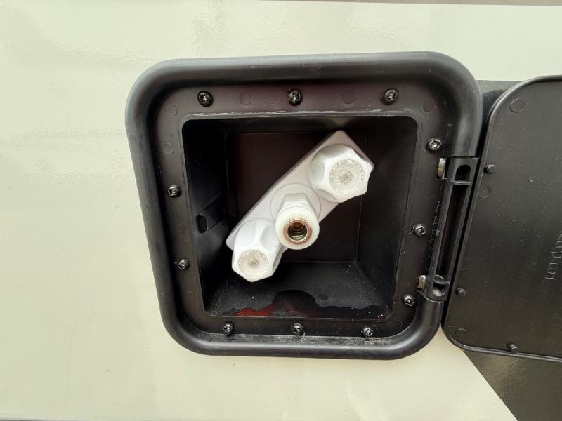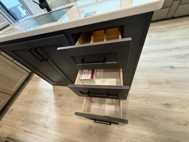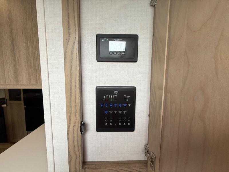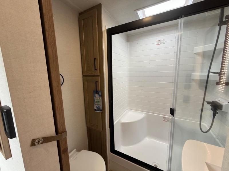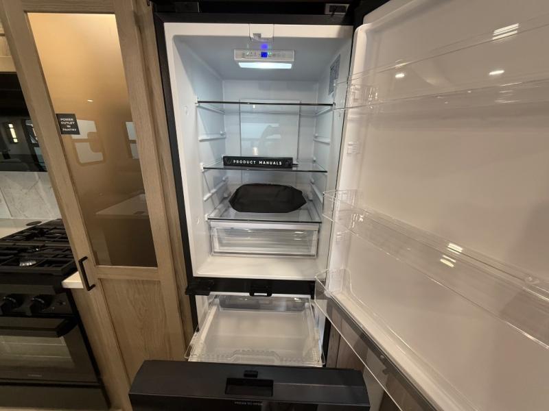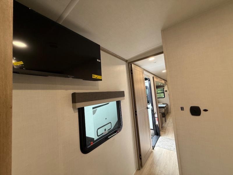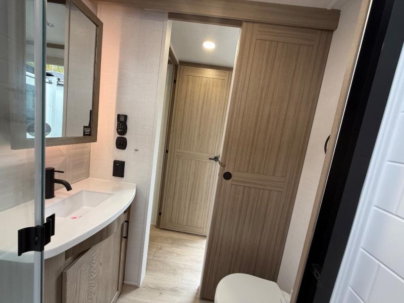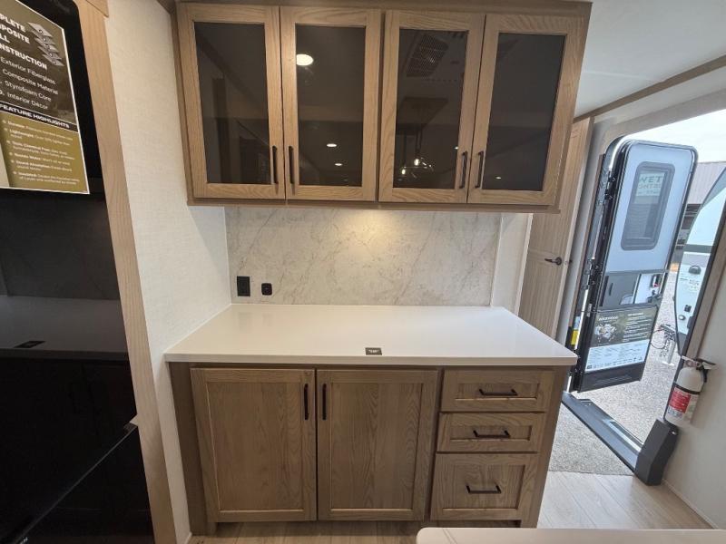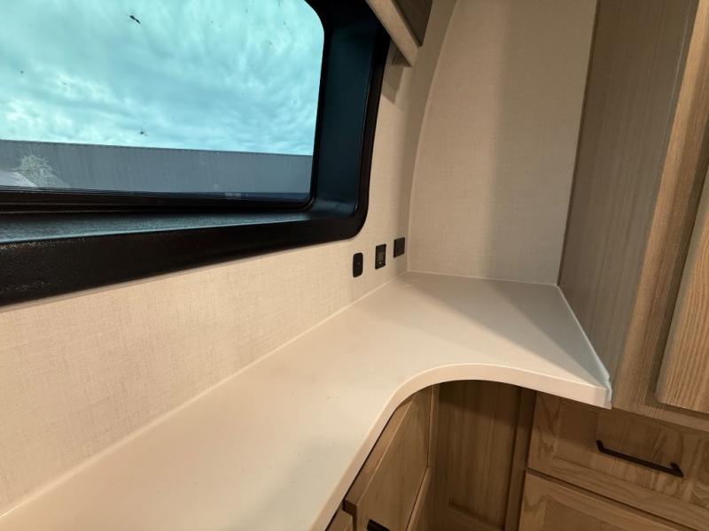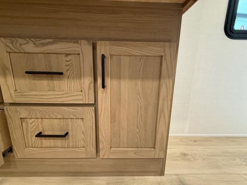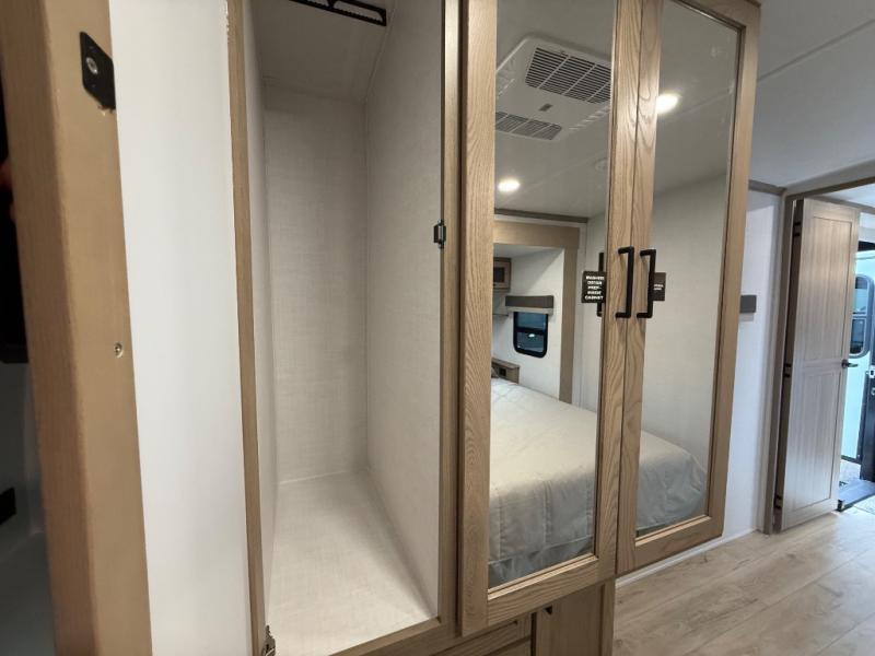 You're going to love the amount of natural light in this model with large windows in the back and the door side. The chef of the group will love the kitchen island, and there is tons of storage space for dishes, food, and knickknacks. The entertainment center with a Smart TV will allow you to watch movies at night, or you may just find yourselves outside under the two power awnings with LED lights. There is also an outside griddle prep here to cook pancakes in the morning. The king bed is sure to bring comfort, and you'll appreciate the large wardrobe to keep your clothes tidy. There is even washer and dryer prep if you choose to go full-time!