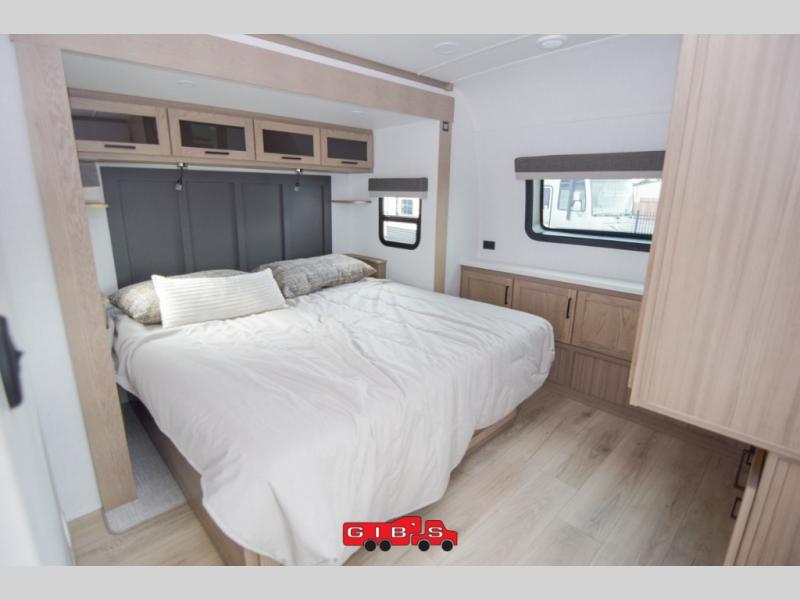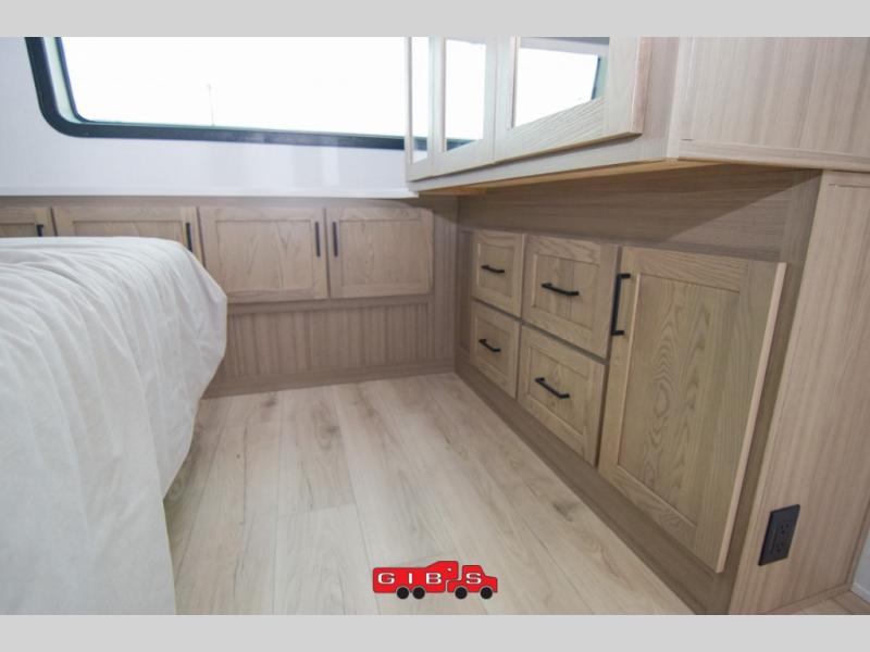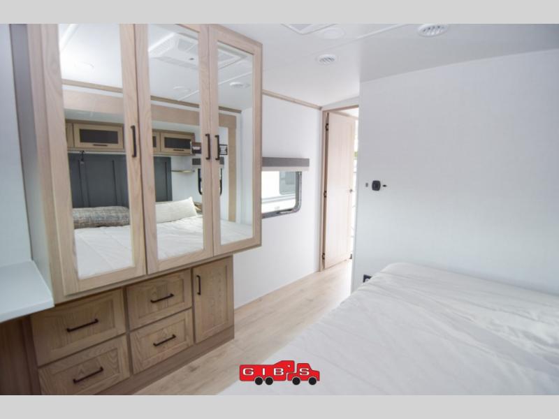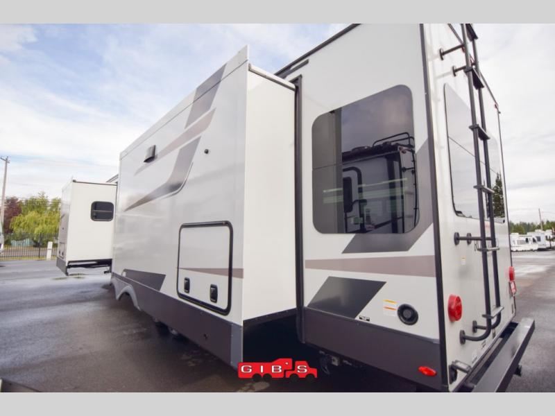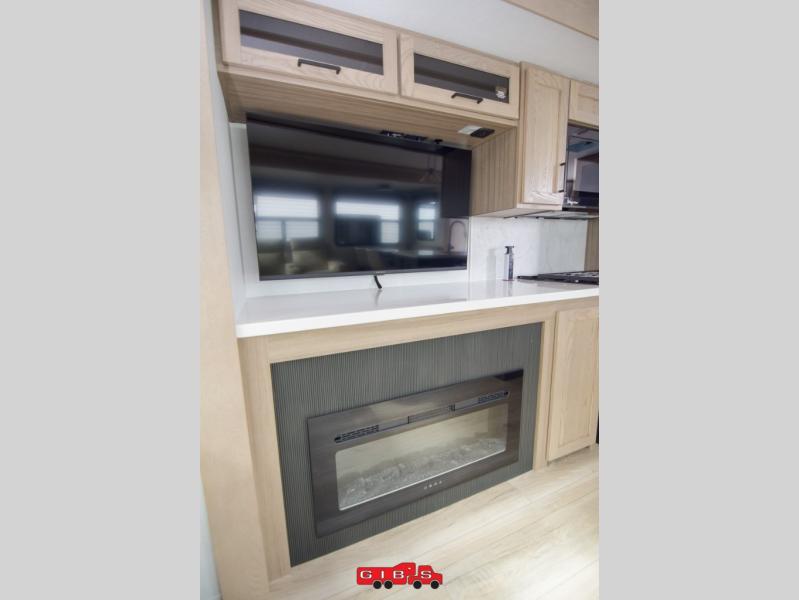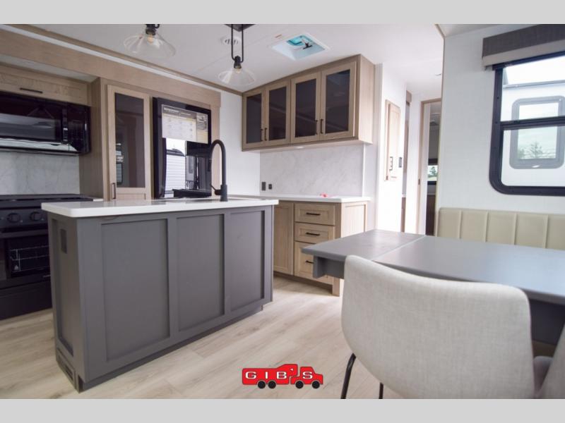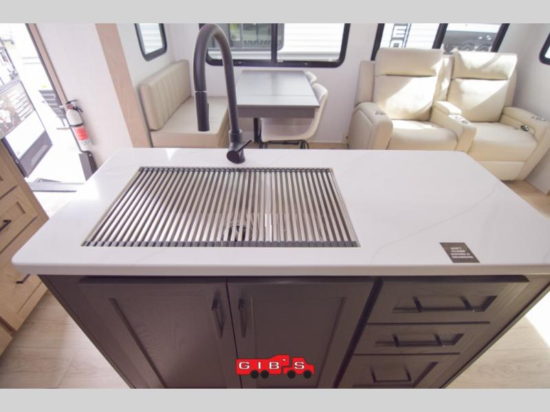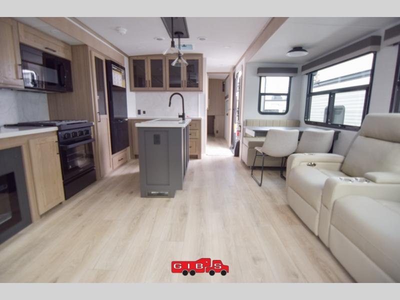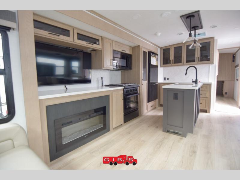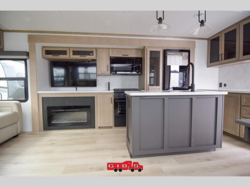 You're going to love the amount of natural light in this model with large windows in the back and the door side. The chef of the group will love the kitchen island, and there is tons of storage space for dishes, food, and knickknacks. The entertainment center with a Smart TV will allow you to watch movies at night, or you may just find yourselves outside under the two power awnings with LED lights. There is also an outside griddle prep here to cook pancakes in the morning. The king bed is sure to bring comfort, and you'll appreciate the large wardrobe to keep your clothes tidy. There is even washer and dryer prep if you choose to go full-time!
