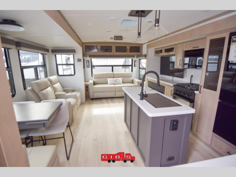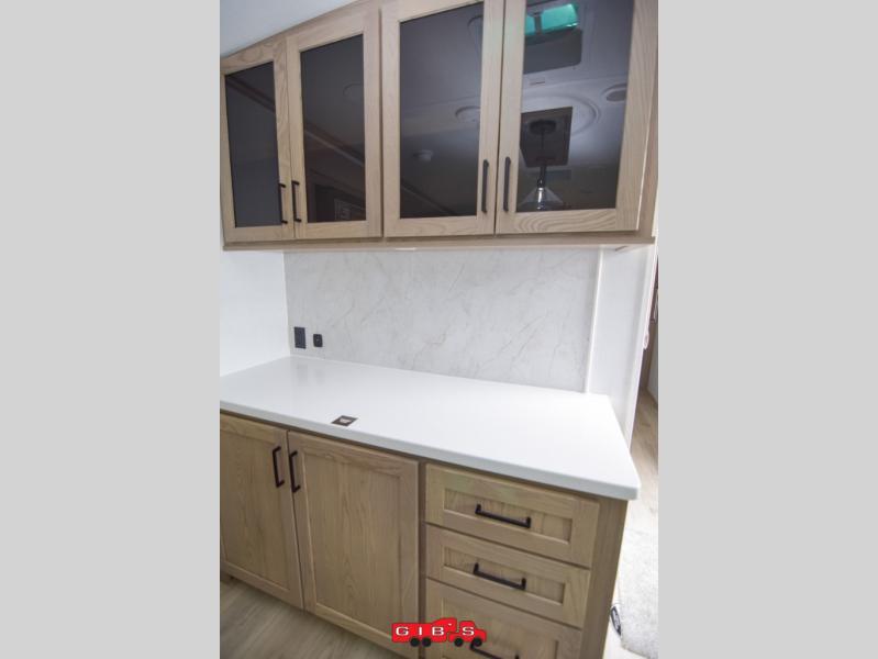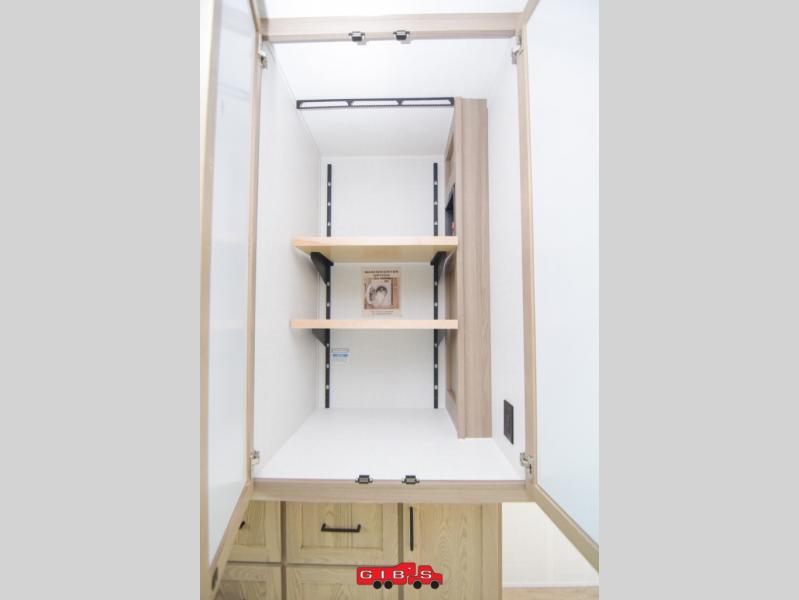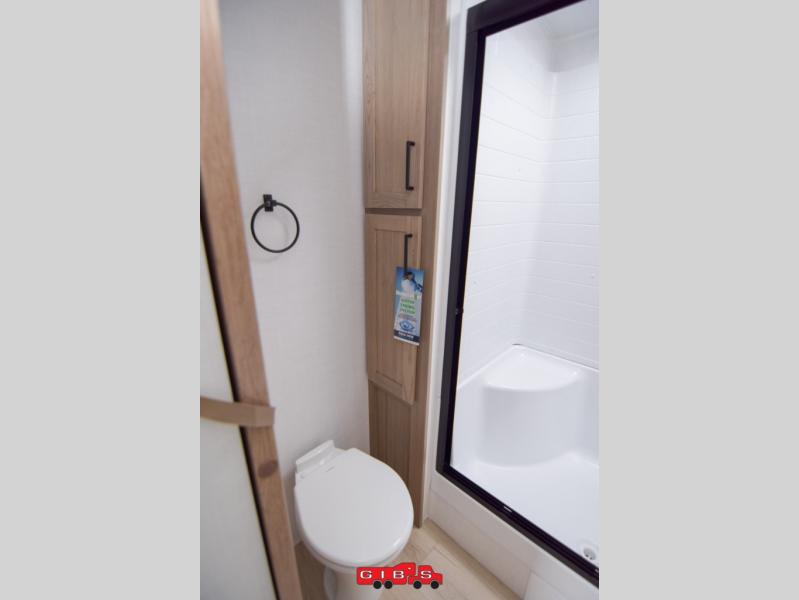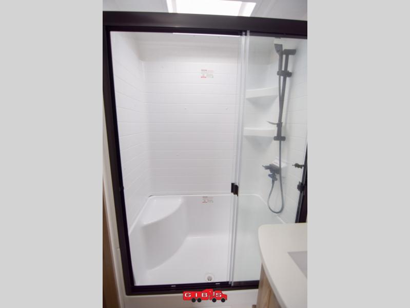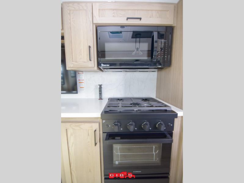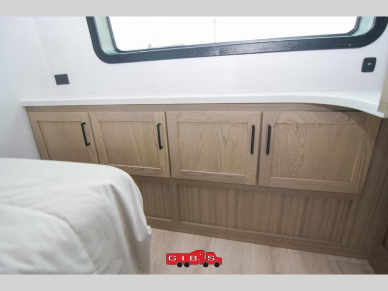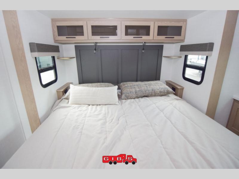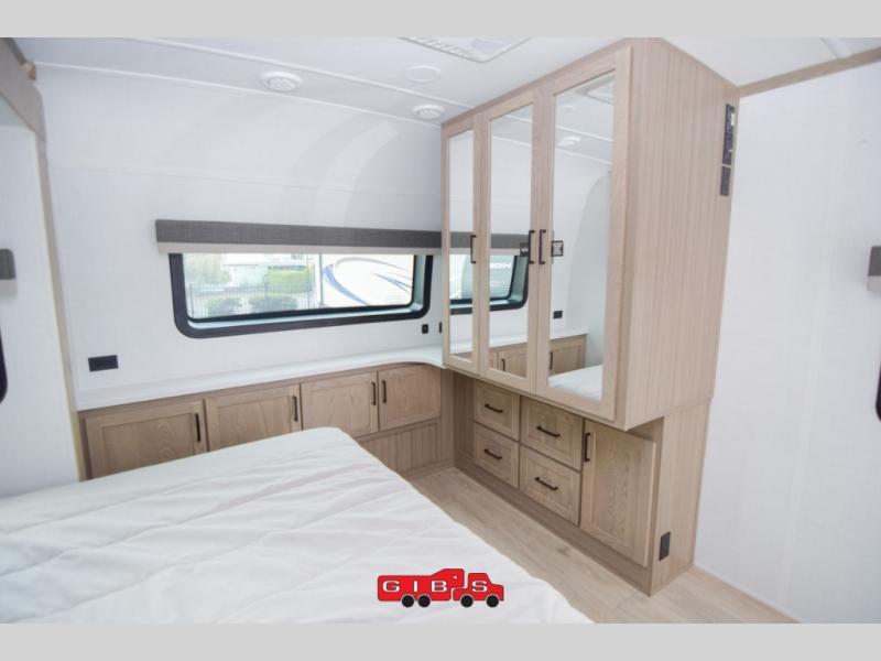 You're going to love the amount of natural light in this model with large windows in the back and the door side. The chef of the group will love the kitchen island, and there is tons of storage space for dishes, food, and knickknacks. The entertainment center with a Smart TV will allow you to watch movies at night, or you may just find yourselves outside under the two power awnings with LED lights. There is also an outside griddle prep here to cook pancakes in the morning. The king bed is sure to bring comfort, and you'll appreciate the large wardrobe to keep your clothes tidy. There is even washer and dryer prep if you choose to go full-time!