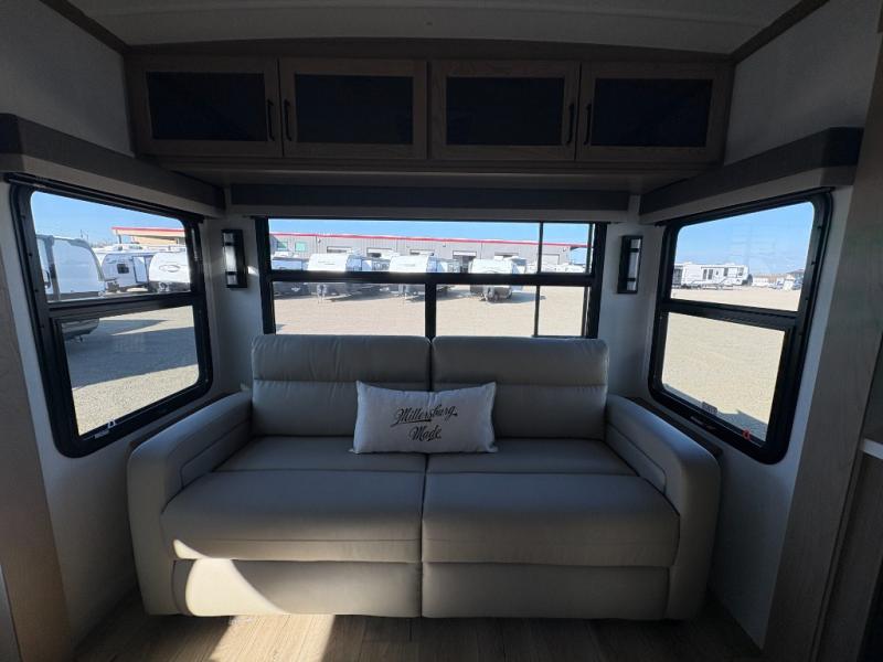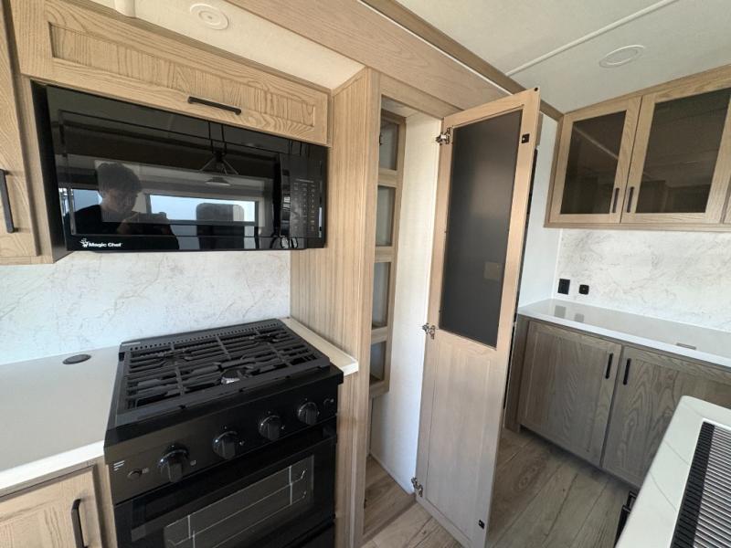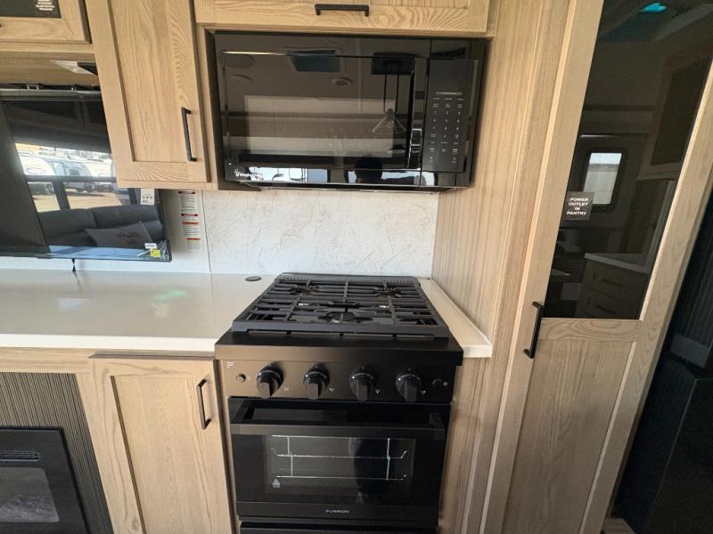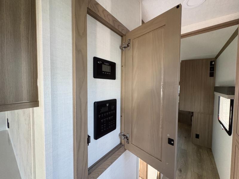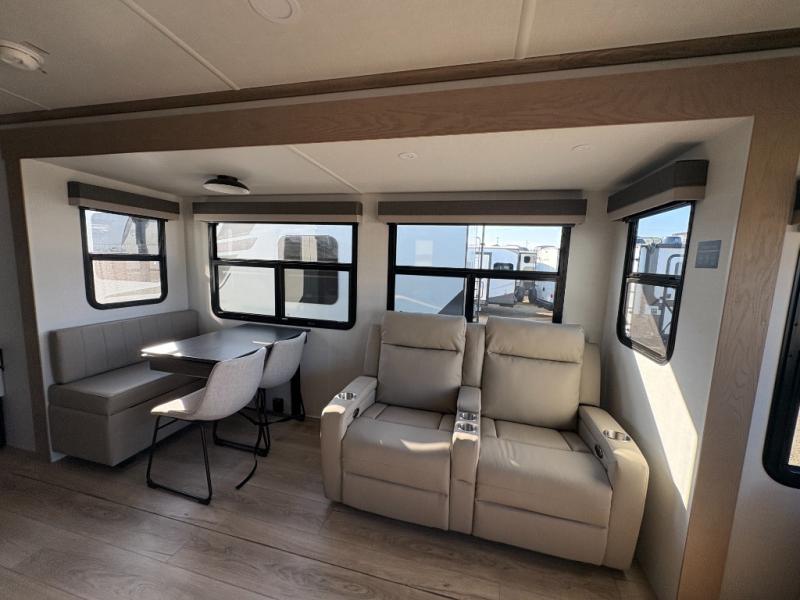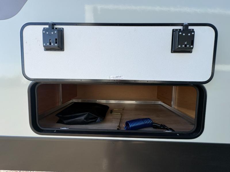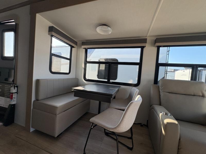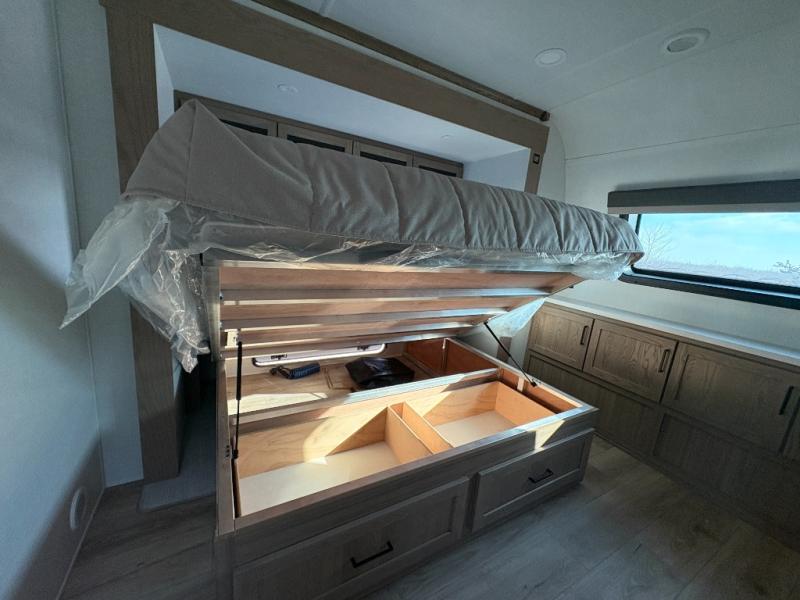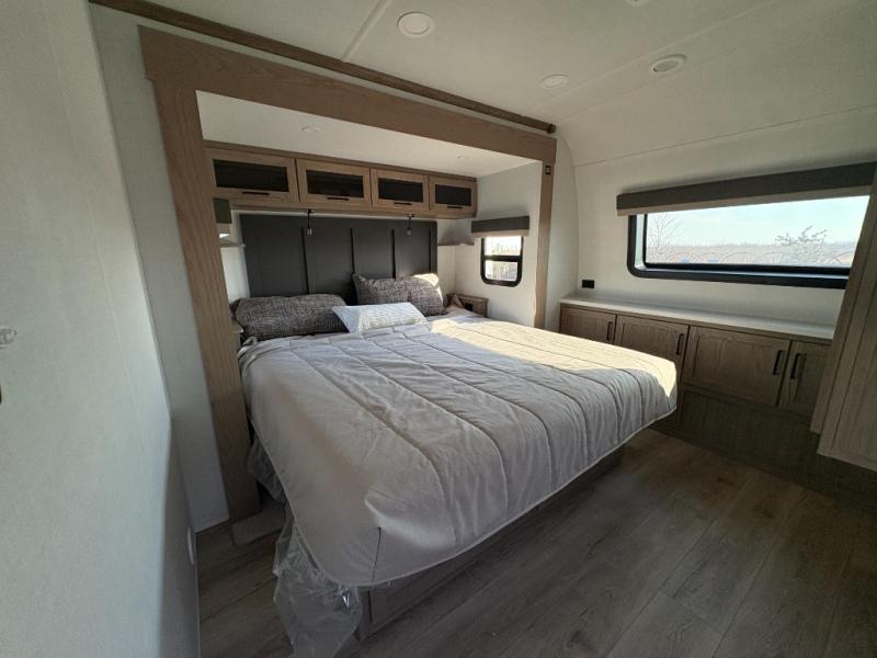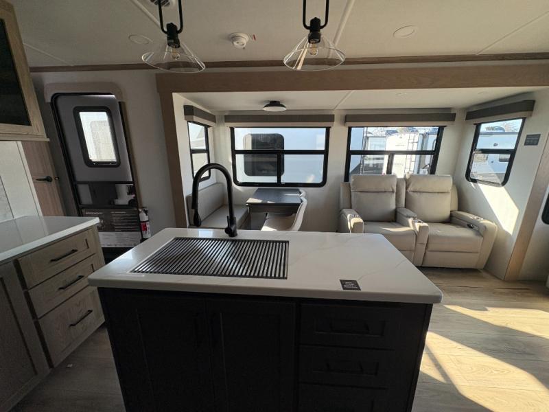You're going to love the amount of natural light in this model with large windows in the back and the door side. The chef of the group will love the kitchen island, and there is tons of storage space for dishes, food, and knickknacks. The entertainment center with a Smart TV will allow you to watch movies at night, or you may just find yourselves outside under the two power awnings with LED lights. There is also an outside griddle prep here to cook pancakes in the morning. The king bed is sure to bring comfort, and you'll appreciate the large wardrobe to keep your clothes tidy. There is even washer and dryer prep if you choose to go full-time!