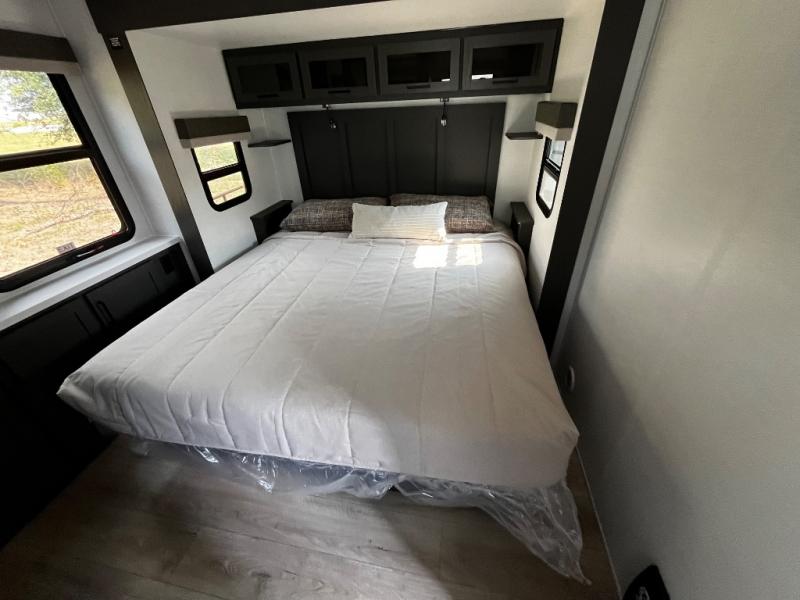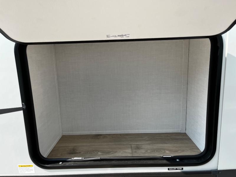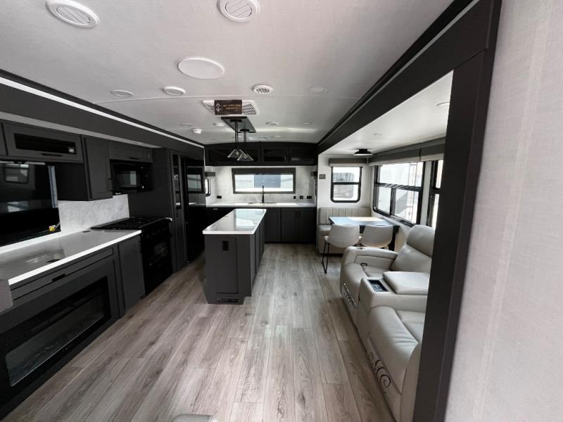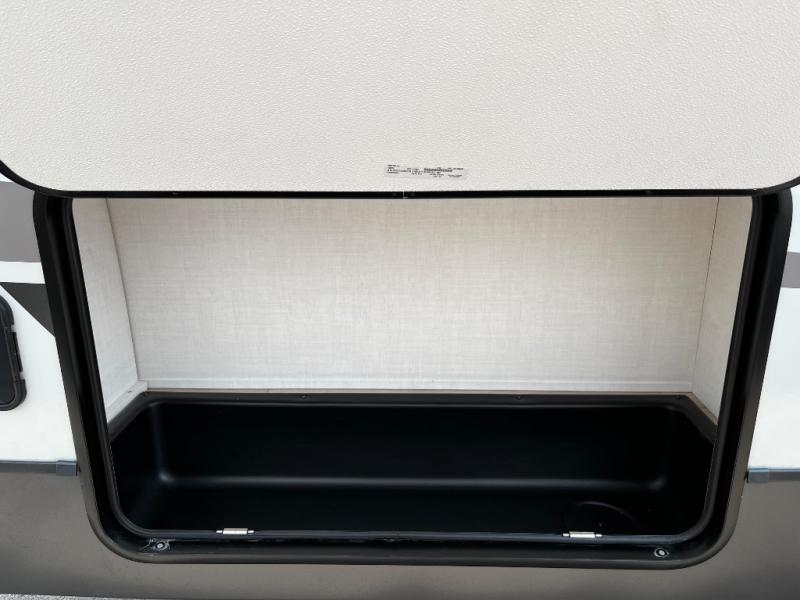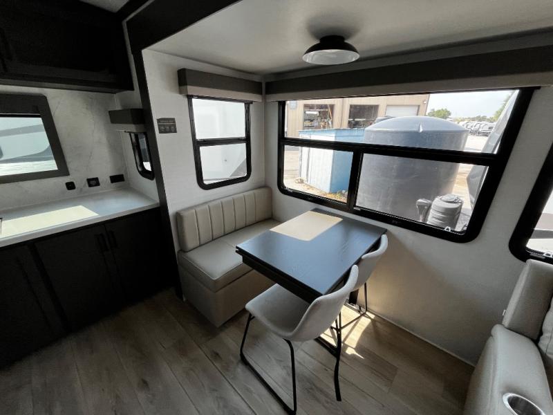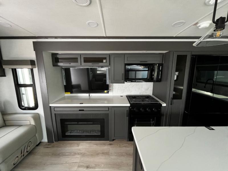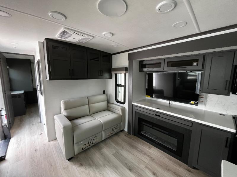 You'll love every minute spent in this front kitchen travel trailer! There is ample counter space to prep meals, plus a spacious kitchen island with a pull-out trash can. After lunch is made, you can dine at the table with chairs and a bench, or take your plate outdoors to eat under the two power awnings. Once you're back inside, you can relax on the theater seat across from the Smart TV and fireplace, and the hide-a-bed sofa here will provide sleeping space for guests. This unit also includes a rear private bedroom with a king bed slide out, a dresser, and a wardrobe with washer and dryer prep if you choose to add those appliances!
