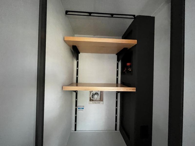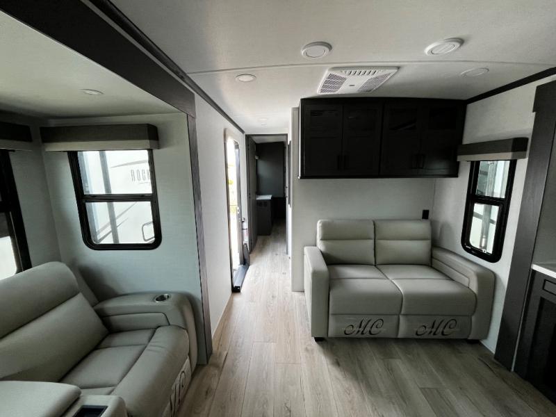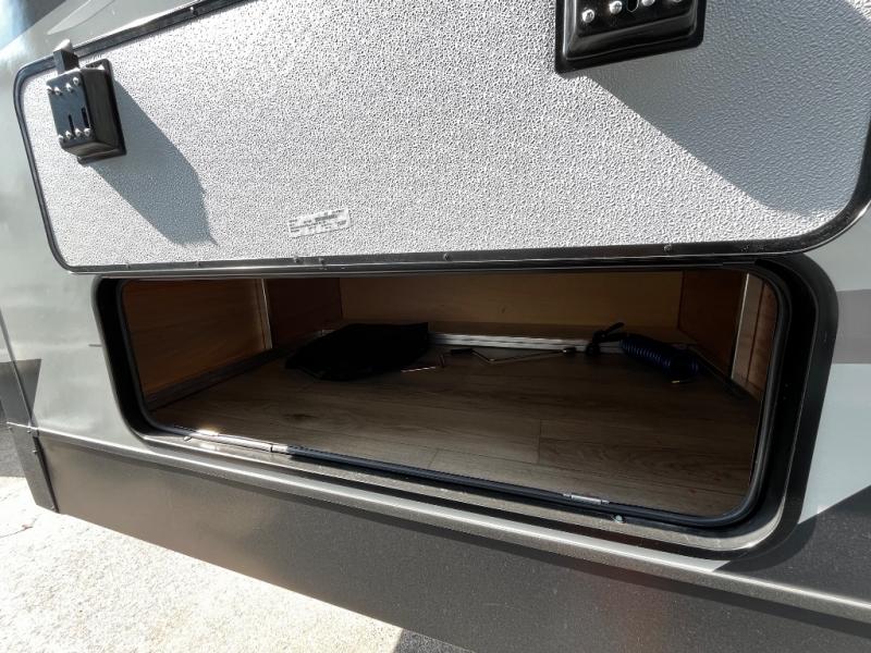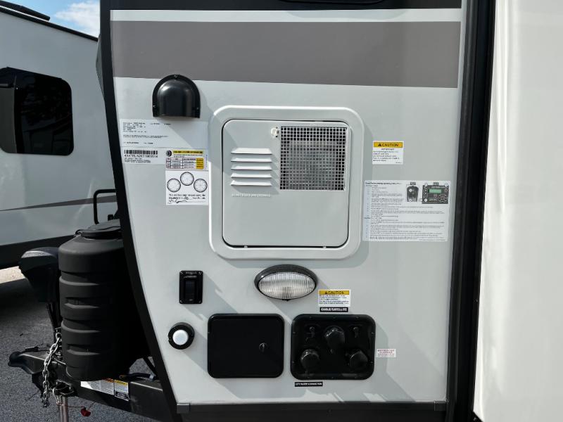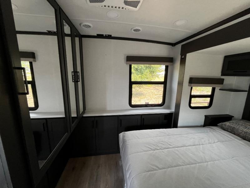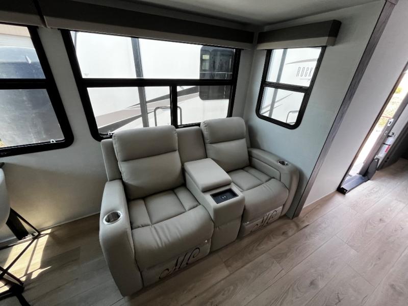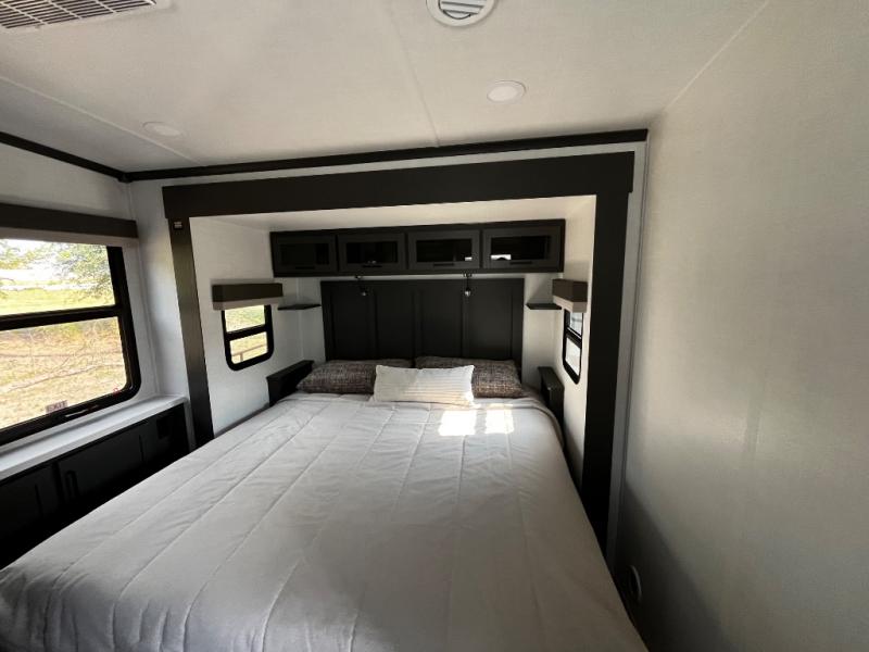 You'll love every minute spent in this front kitchen travel trailer! There is ample counter space to prep meals, plus a spacious kitchen island with a pull-out trash can. After lunch is made, you can dine at the table with chairs and a bench, or take your plate outdoors to eat under the two power awnings. Once you're back inside, you can relax on the theater seat across from the Smart TV and fireplace, and the hide-a-bed sofa here will provide sleeping space for guests. This unit also includes a rear private bedroom with a king bed slide out, a dresser, and a wardrobe with washer and dryer prep if you choose to add those appliances!
