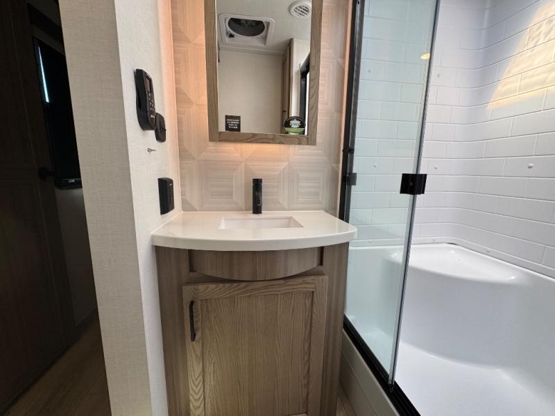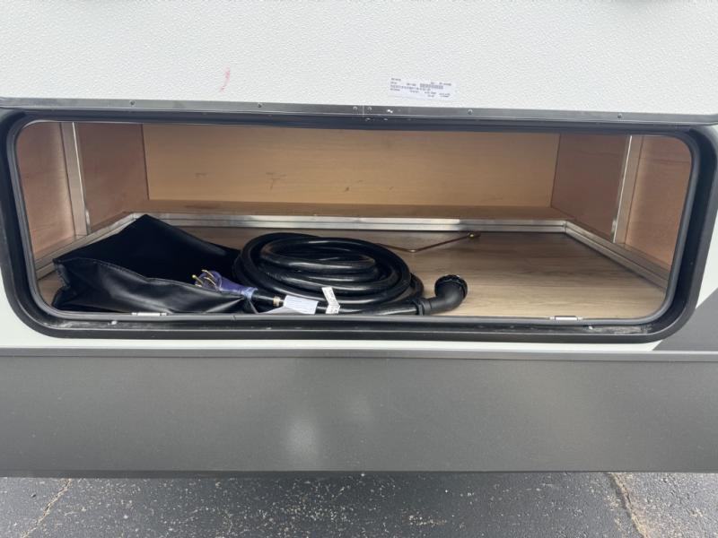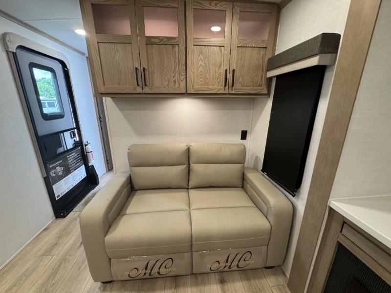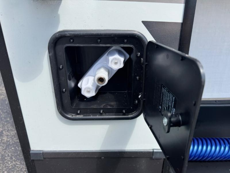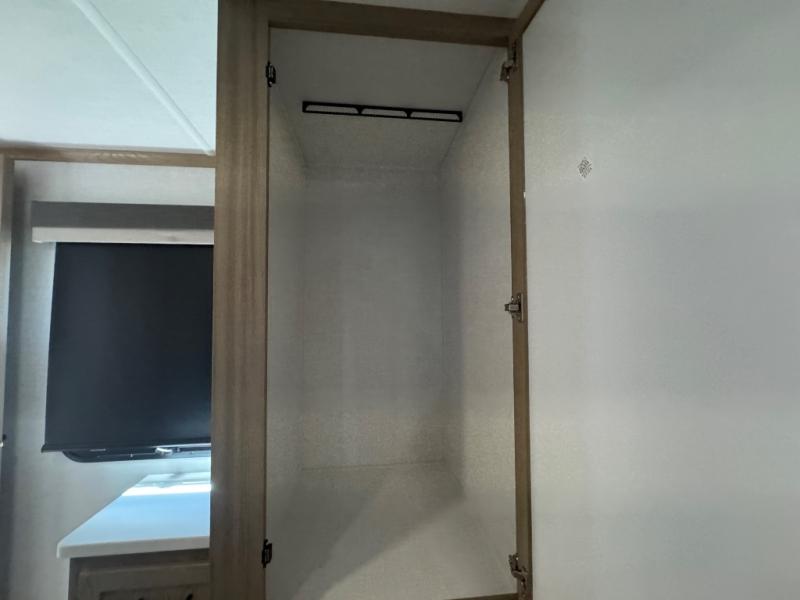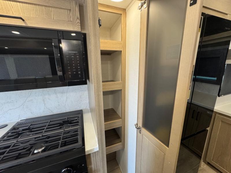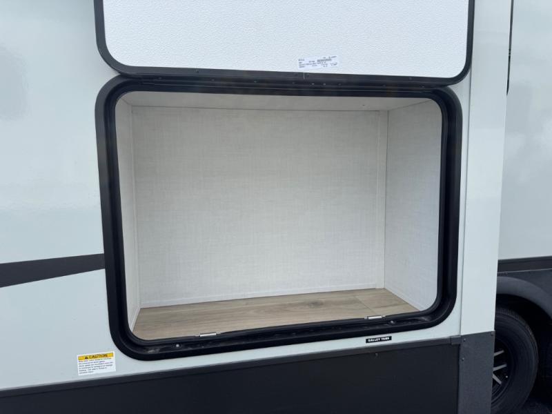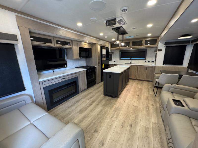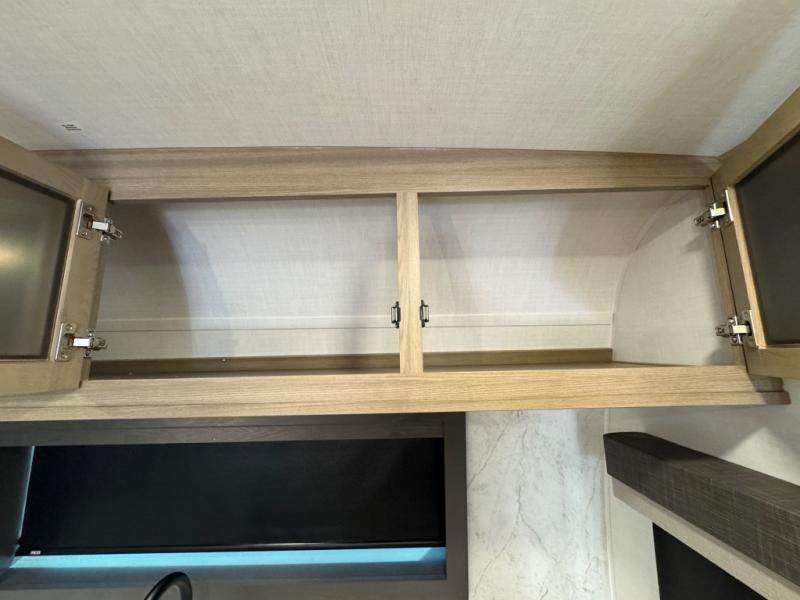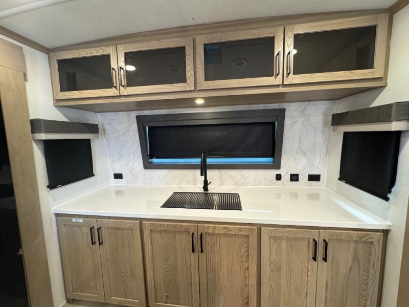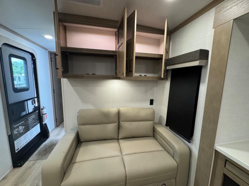 You'll love every minute spent in this front kitchen travel trailer! There is ample counter space to prep meals, plus a spacious kitchen island with a pull-out trash can. After lunch is made, you can dine at the table with chairs and a bench, or take your plate outdoors to eat under the two power awnings. Once you're back inside, you can relax on the theater seat across from the Smart TV and fireplace, and the hide-a-bed sofa here will provide sleeping space for guests. This unit also includes a rear private bedroom with a king bed slide out, a dresser, and a wardrobe with washer and dryer prep if you choose to add those appliances!