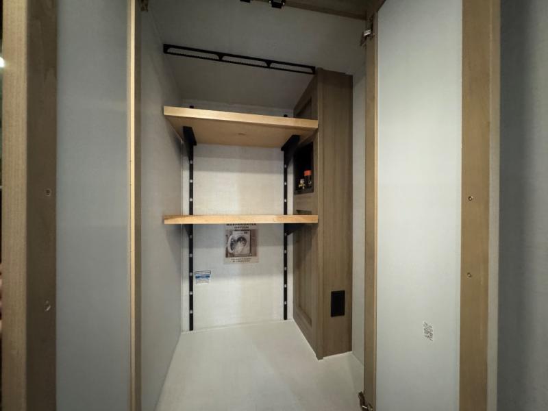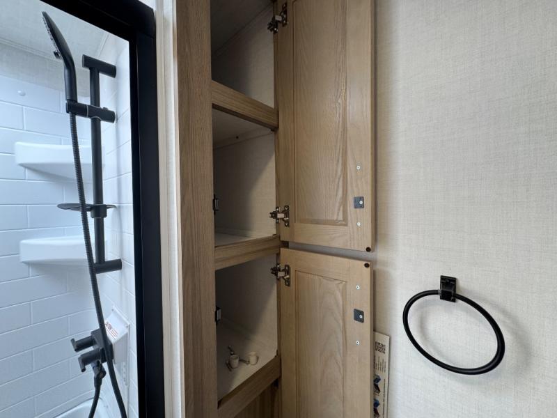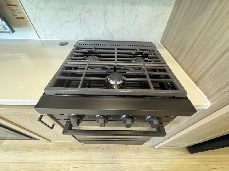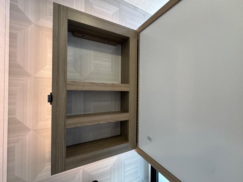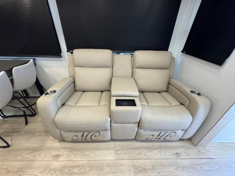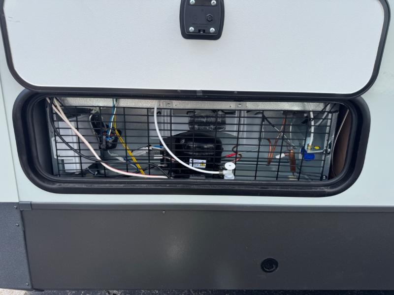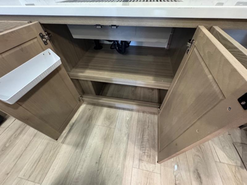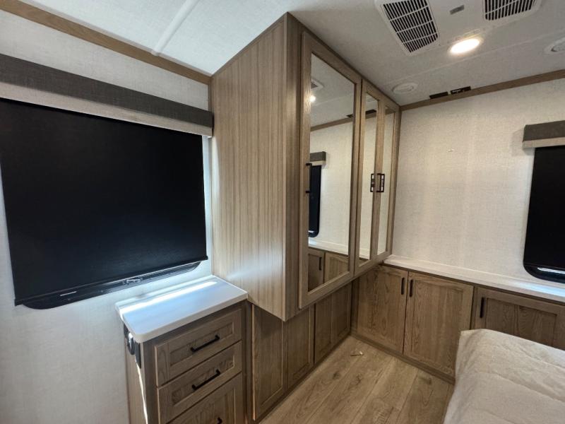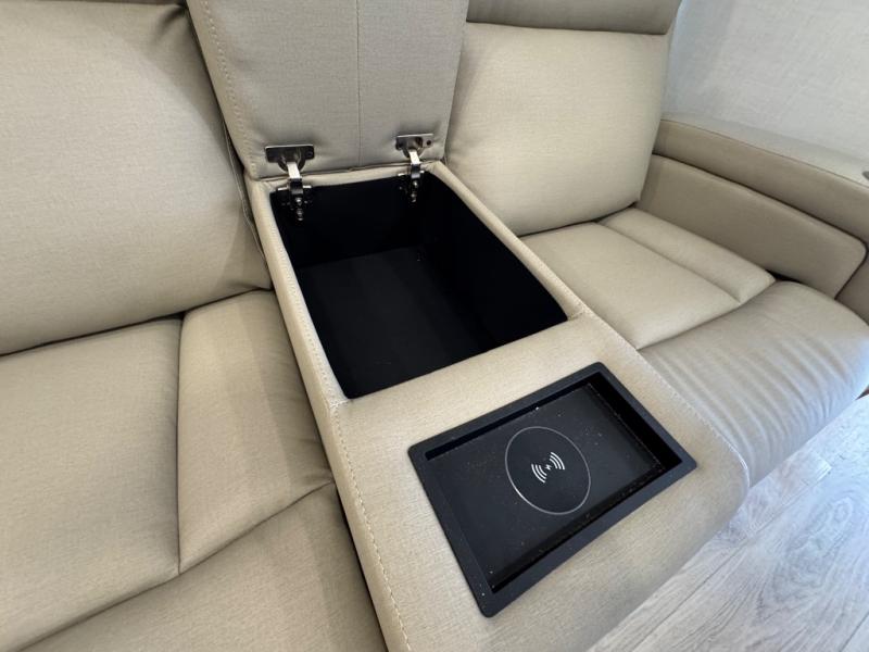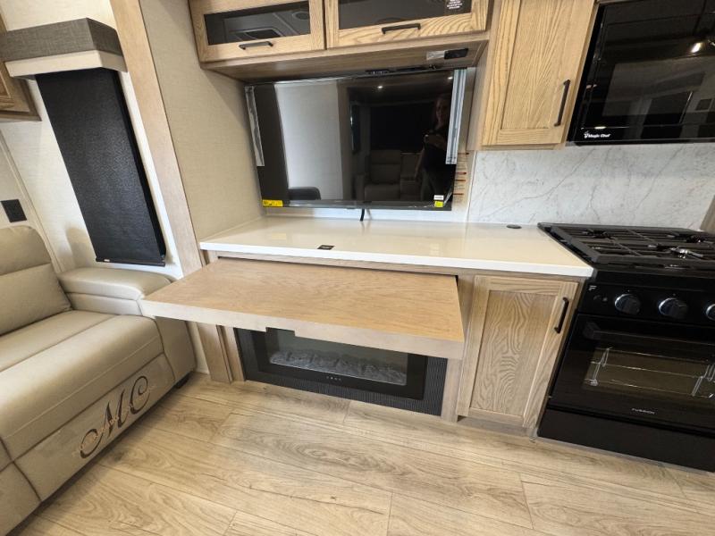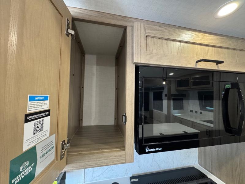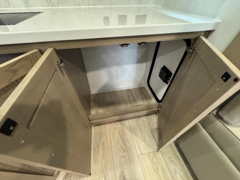 You'll love every minute spent in this front kitchen travel trailer! There is ample counter space to prep meals, plus a spacious kitchen island with a pull-out trash can. After lunch is made, you can dine at the table with chairs and a bench, or take your plate outdoors to eat under the two power awnings. Once you're back inside, you can relax on the theater seat across from the Smart TV and fireplace, and the hide-a-bed sofa here will provide sleeping space for guests. This unit also includes a rear private bedroom with a king bed slide out, a dresser, and a wardrobe with washer and dryer prep if you choose to add those appliances!