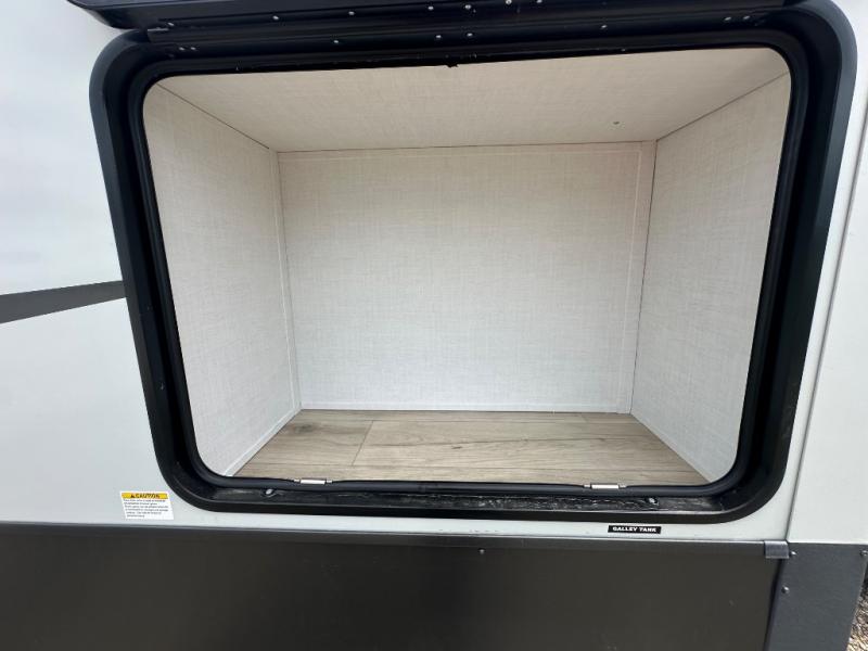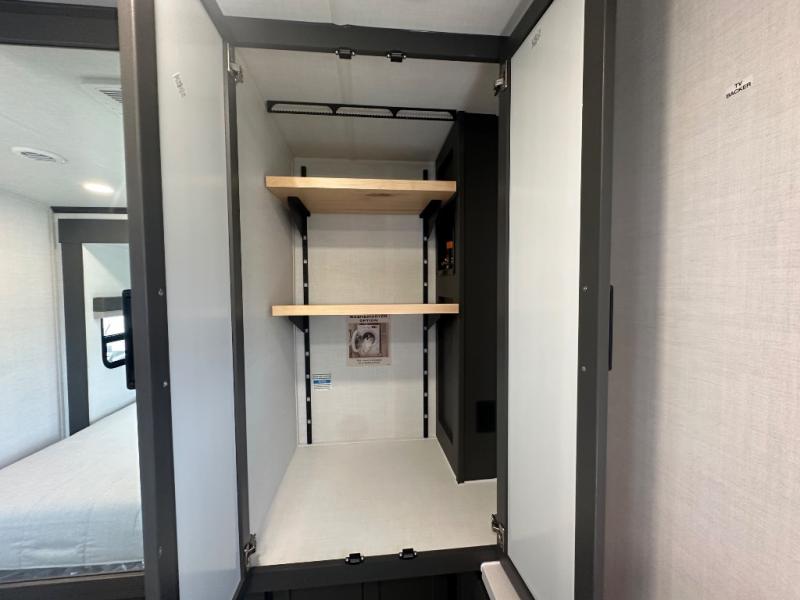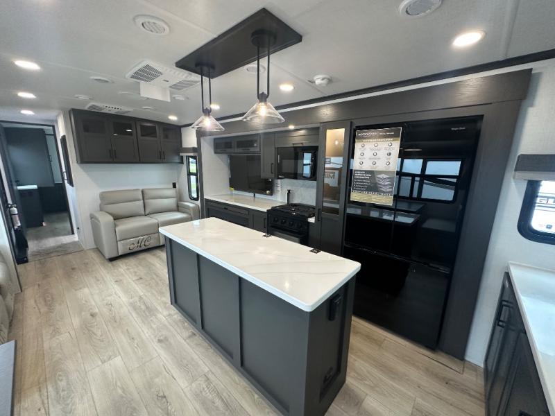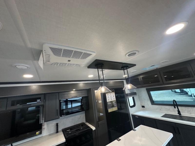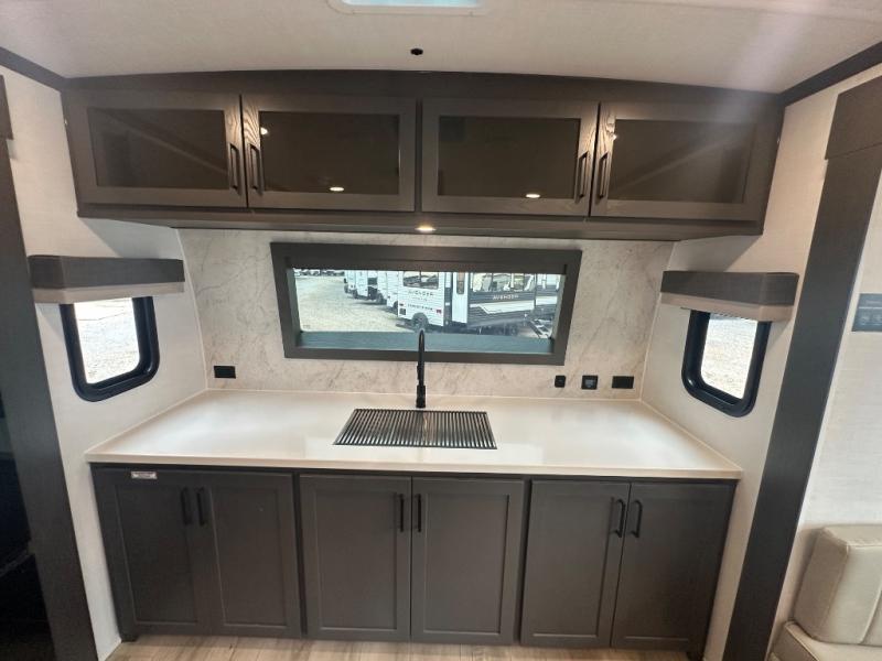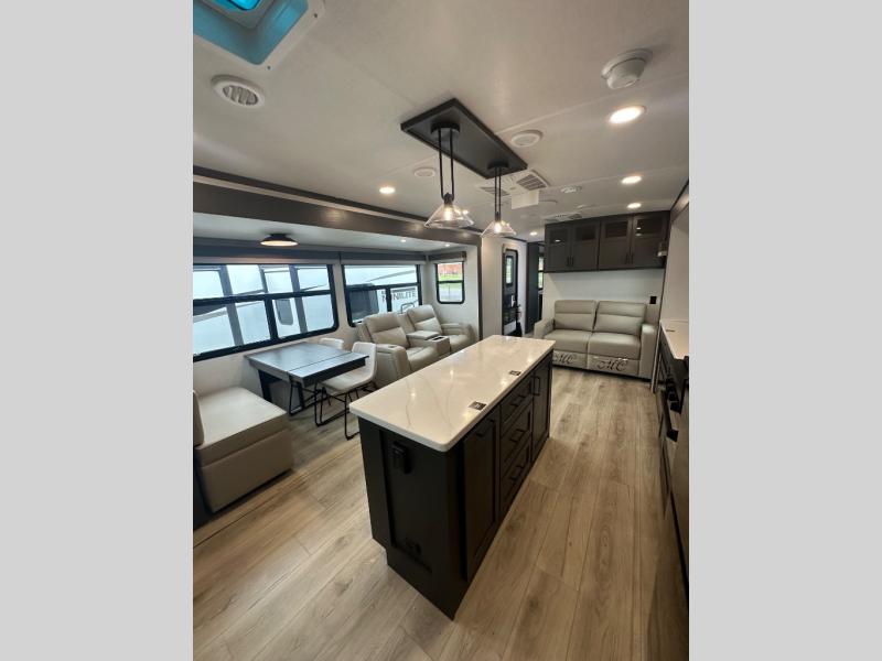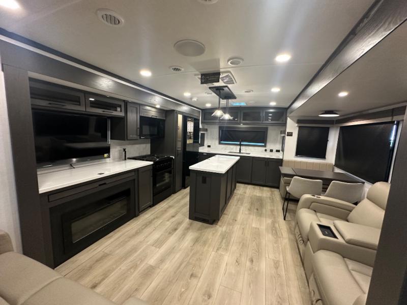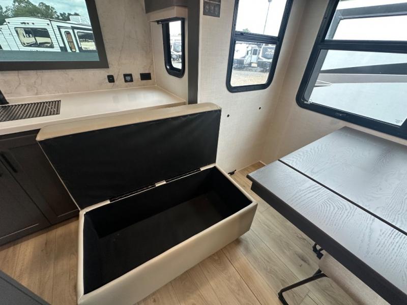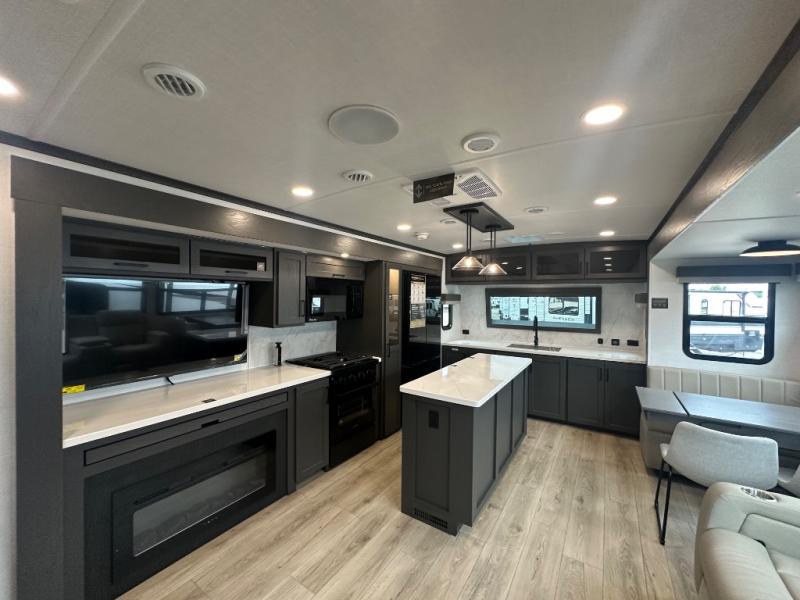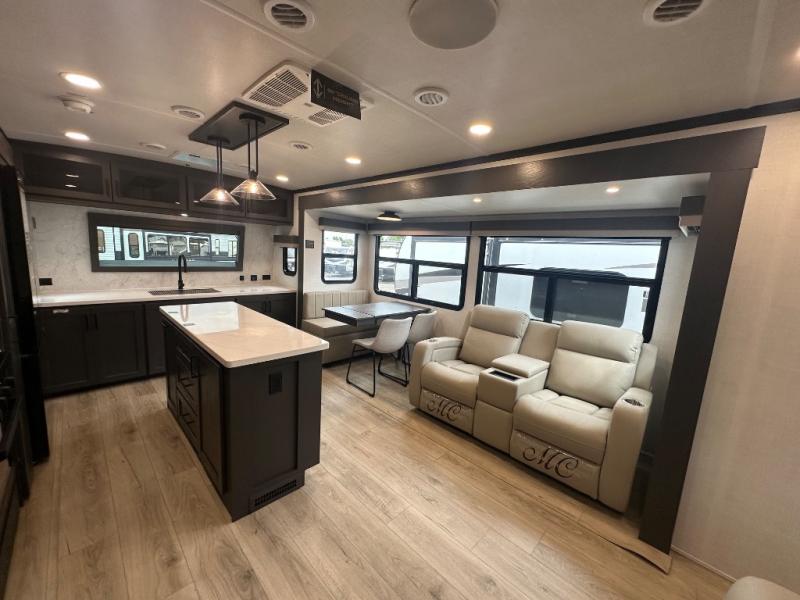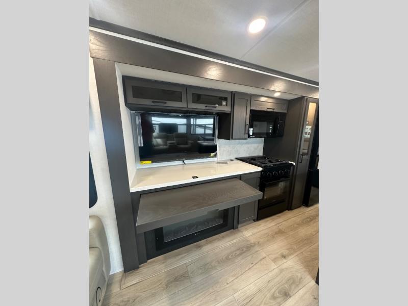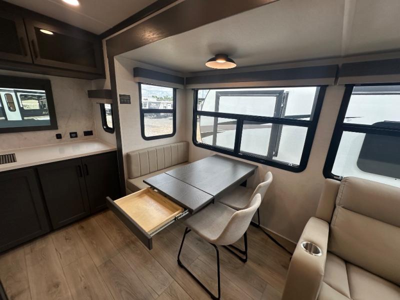 You'll love every minute spent in this front kitchen travel trailer! There is ample counter space to prep meals, plus a spacious kitchen island with a pull-out trash can. After lunch is made, you can dine at the table with chairs and a bench, or take your plate outdoors to eat under the two power awnings. Once you're back inside, you can relax on the theater seat across from the Smart TV and fireplace, and the hide-a-bed sofa here will provide sleeping space for guests. This unit also includes a rear private bedroom with a king bed slide out, a dresser, and a wardrobe with washer and dryer prep if you choose to add those appliances!