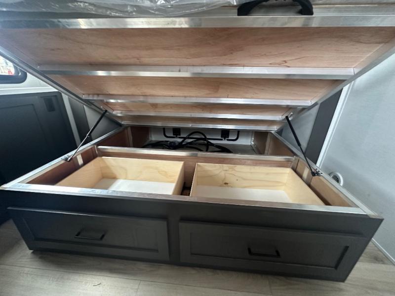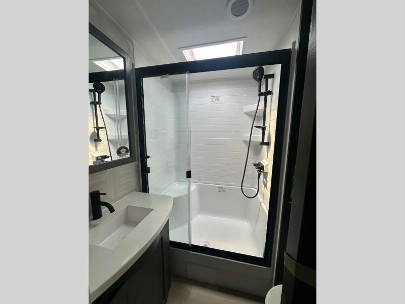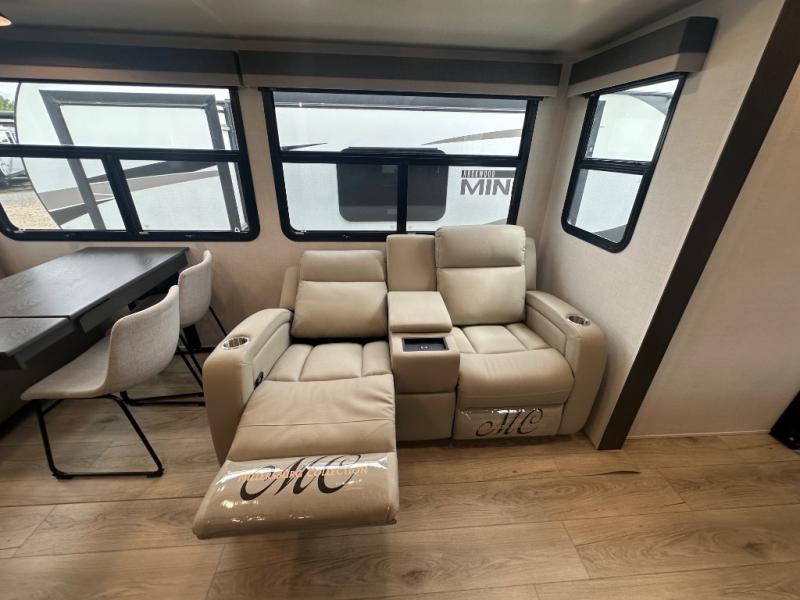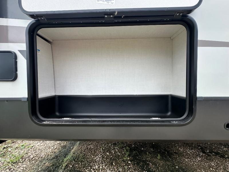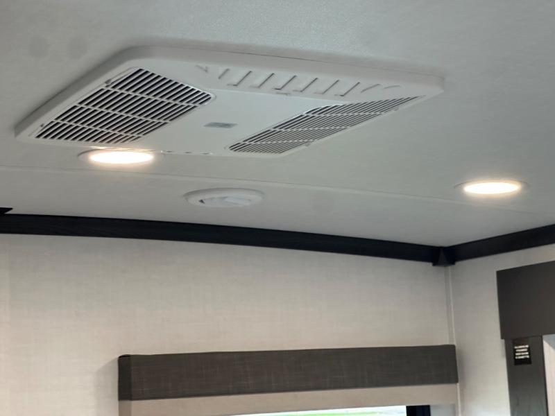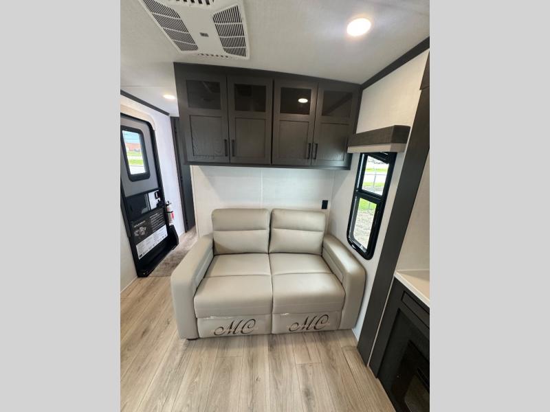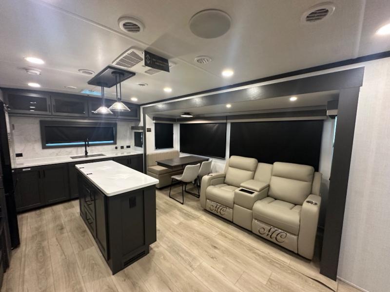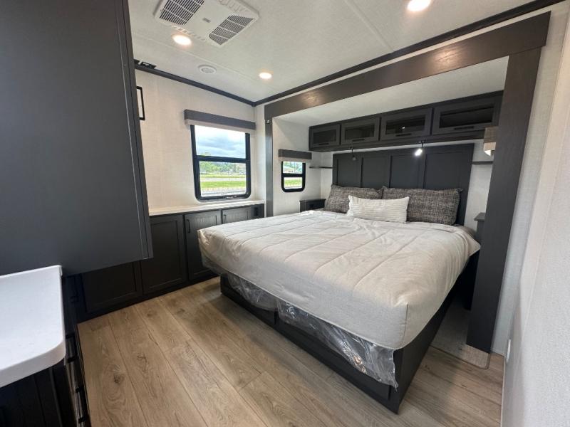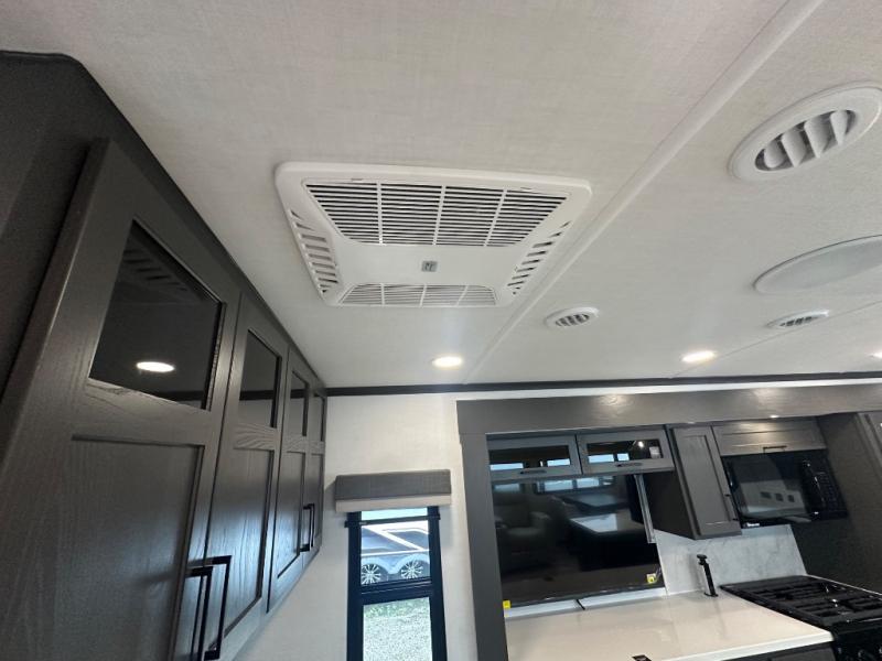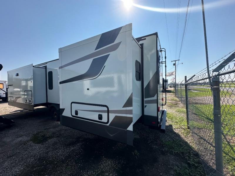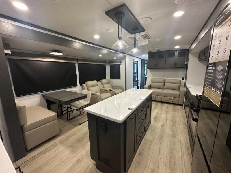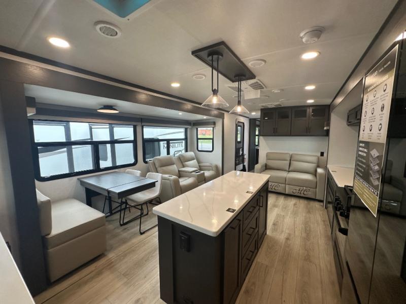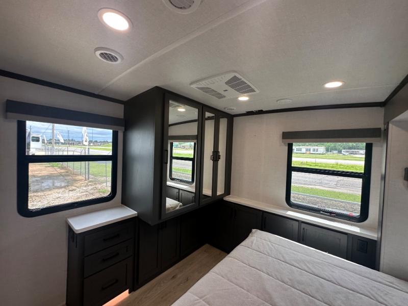 You'll love every minute spent in this front kitchen travel trailer! There is ample counter space to prep meals, plus a spacious kitchen island with a pull-out trash can. After lunch is made, you can dine at the table with chairs and a bench, or take your plate outdoors to eat under the two power awnings. Once you're back inside, you can relax on the theater seat across from the Smart TV and fireplace, and the hide-a-bed sofa here will provide sleeping space for guests. This unit also includes a rear private bedroom with a king bed slide out, a dresser, and a wardrobe with washer and dryer prep if you choose to add those appliances!