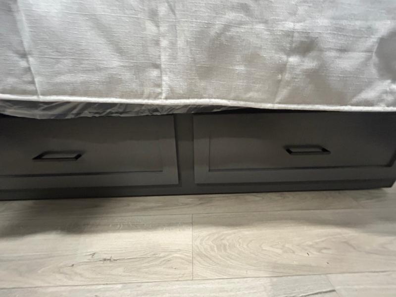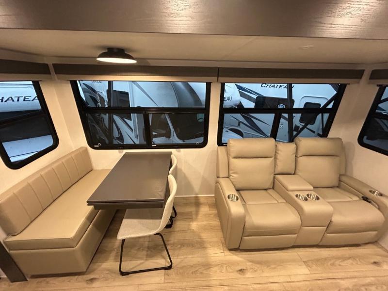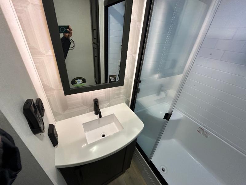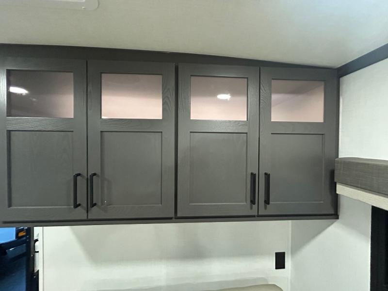 You'll love every minute spent in this front kitchen travel trailer! There is ample counter space to prep meals, plus a spacious kitchen island with a pull-out trash can. After lunch is made, you can dine at the table with chairs and a bench, or take your plate outdoors to eat under the two power awnings. Once you're back inside, you can relax on the theater seat across from the Smart TV and fireplace, and the hide-a-bed sofa here will provide sleeping space for guests. This unit also includes a rear private bedroom with a king bed slide out, a dresser, and a wardrobe with washer and dryer prep if you choose to add those appliances!