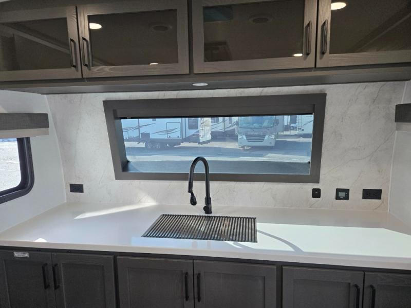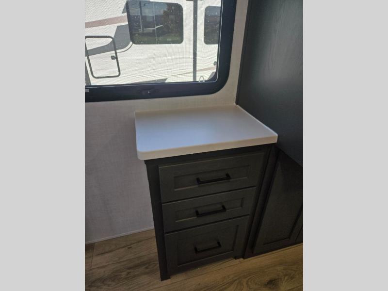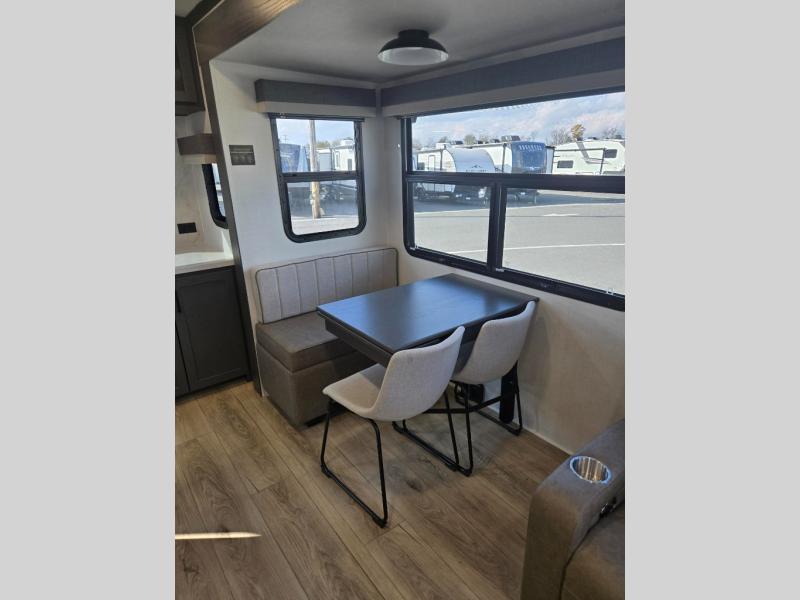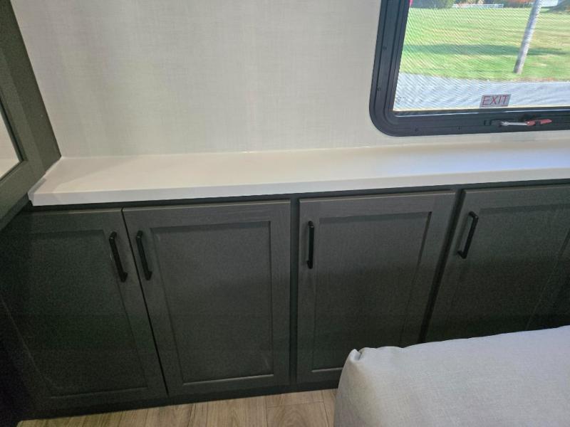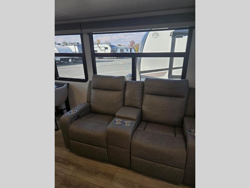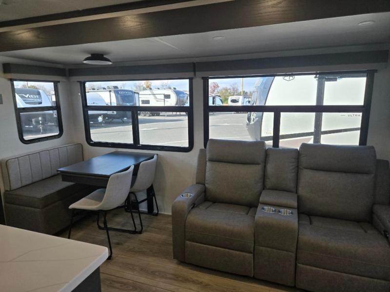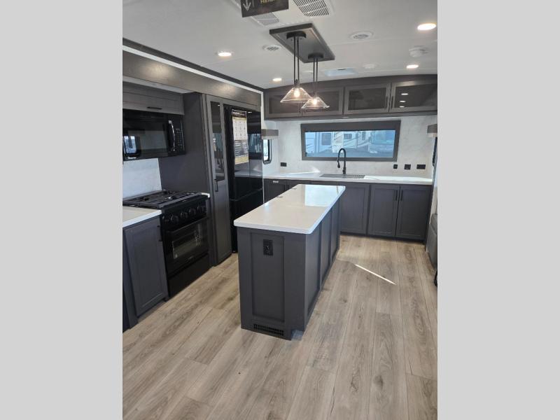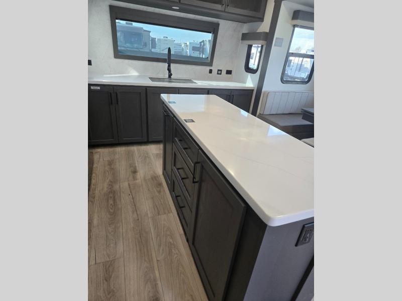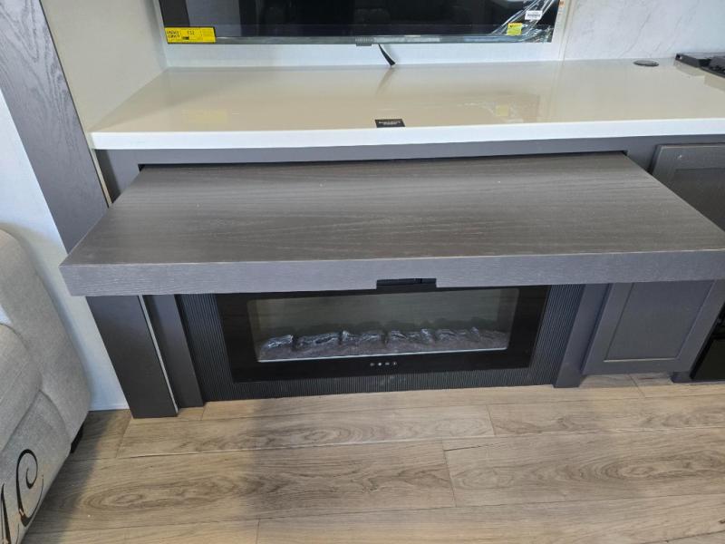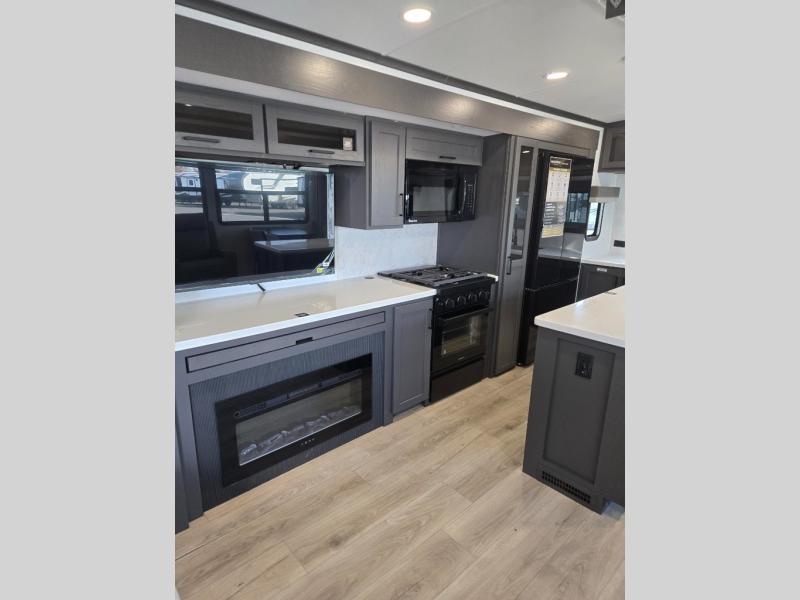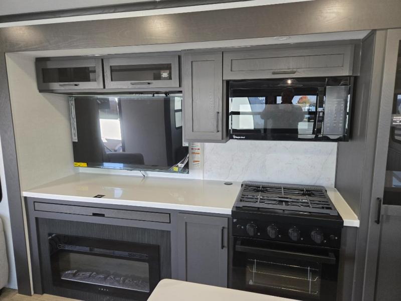 You'll love every minute spent in this front kitchen travel trailer! There is ample counter space to prep meals, plus a spacious kitchen island with a pull-out trash can. After lunch is made, you can dine at the table with chairs and a bench, or take your plate outdoors to eat under the two power awnings. Once you're back inside, you can relax on the theater seat across from the Smart TV and fireplace, and the hide-a-bed sofa here will provide sleeping space for guests. This unit also includes a rear private bedroom with a king bed slide out, a dresser, and a wardrobe with washer and dryer prep if you choose to add those appliances!