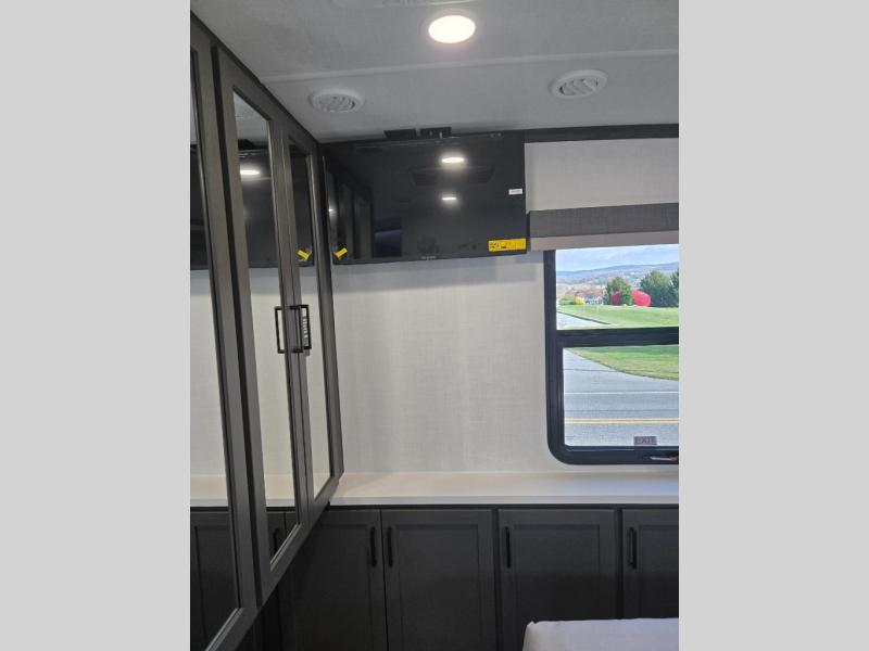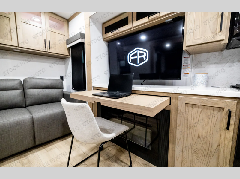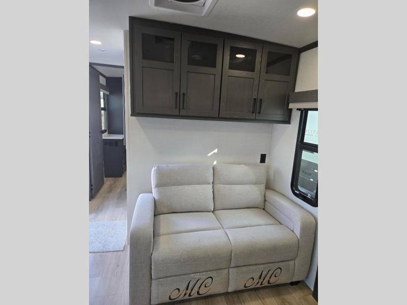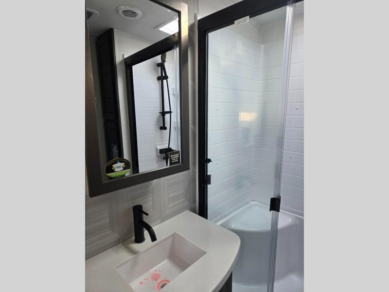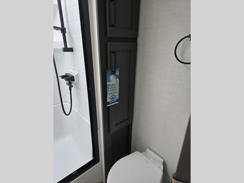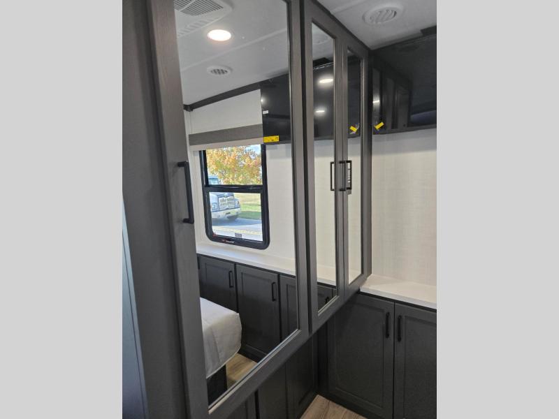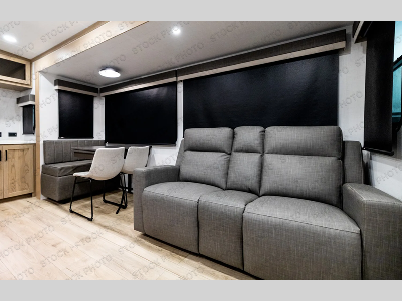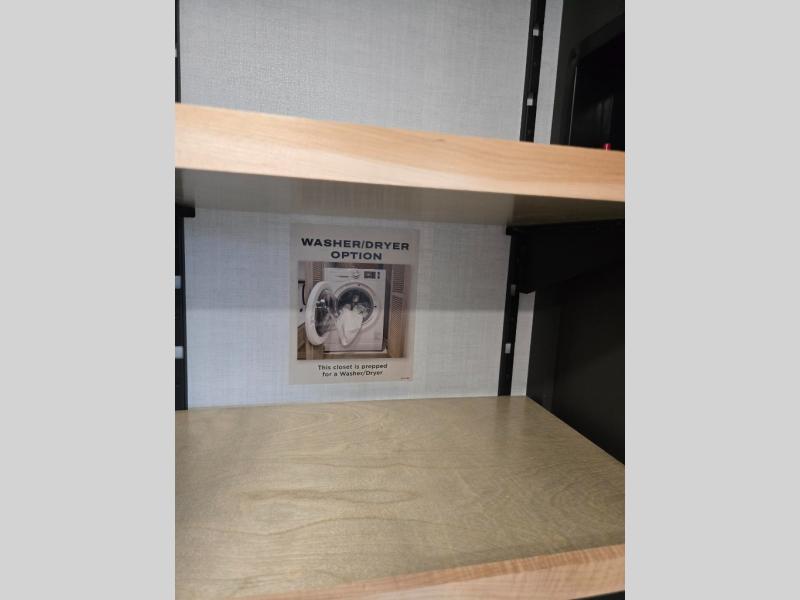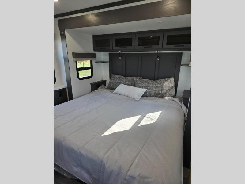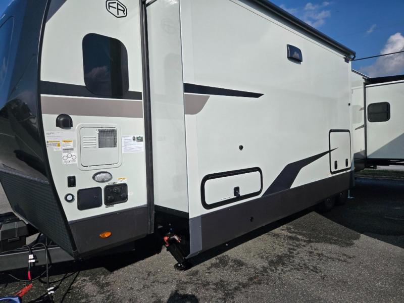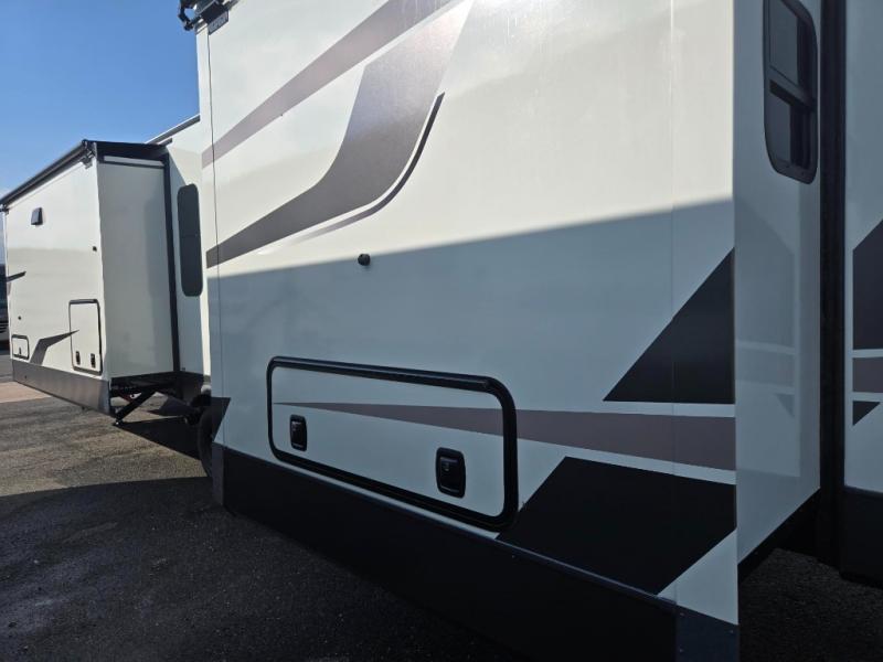You'll love every minute spent in this front kitchen travel trailer! There is ample counter space to prep meals, plus a spacious kitchen island with a pull-out trash can. After lunch is made, you can dine at the table with chairs and a bench, or take your plate outdoors to eat under the two power awnings. Once you're back inside, you can relax on the theater seat across from the Smart TV and fireplace, and the hide-a-bed sofa here will provide sleeping space for guests. This unit also includes a rear private bedroom with a king bed slide out, a dresser, and a wardrobe with washer and dryer prep if you choose to add those appliances!