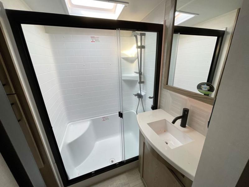 Looking for a spacious bedroom and bathroom for the perfect couple's RV with extra sleeping space for guests? This model provides a queen bed slide out for more interior floor space to get to the front wardrobe with shelves, and the dresser with a window beside it for great views of your campsite. The bathroom offers a shower with a seat, linen storage, and counter space for your toiletries. The main living and kitchen combined area has a hide-a-bed sofa slide that allows two guests to stay the night or you can choose the optional theater seat. There is also a breakfast bar with stools to dine at, and a U-shaped counter including appliances to make meals and store leftovers. And you will find exterior storage to bring along camping chairs and extra gear.